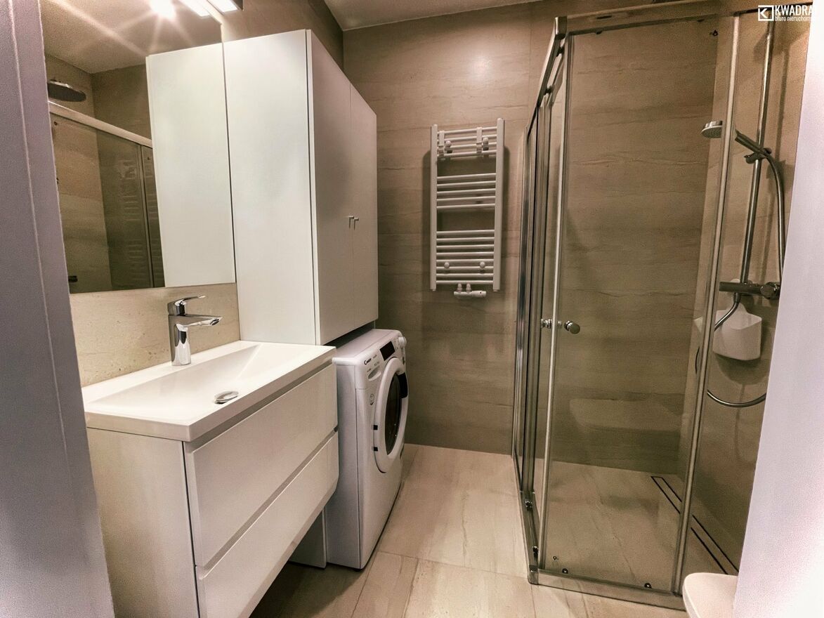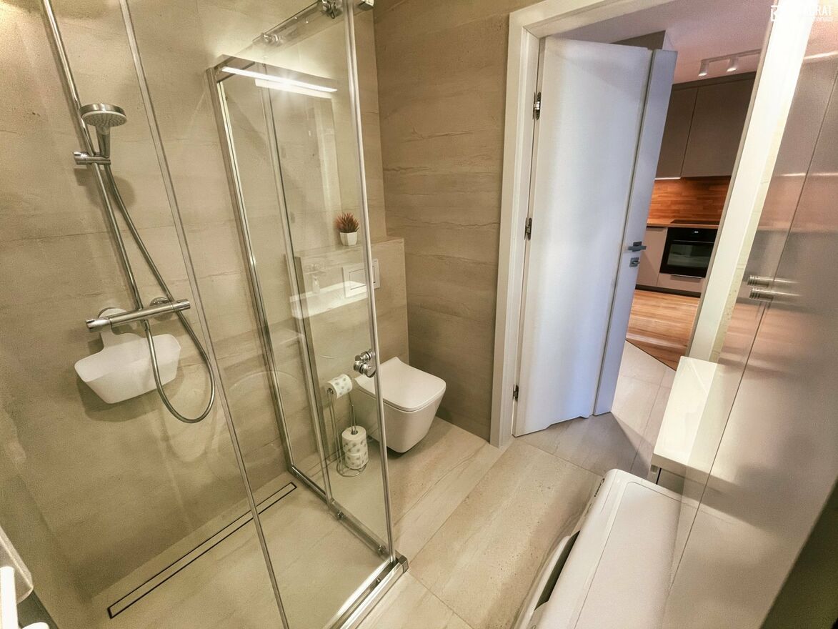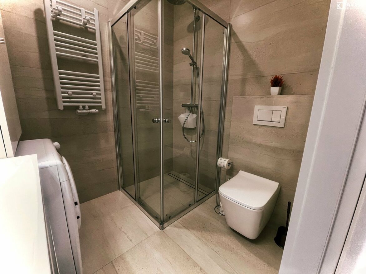 - W łazience mamy do dyspozycji prysznic z odpływem liniowym,