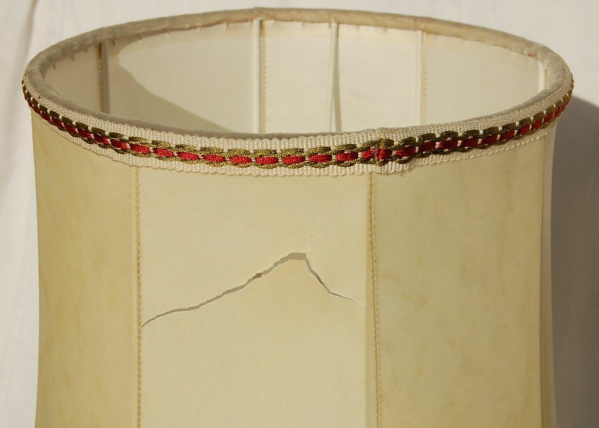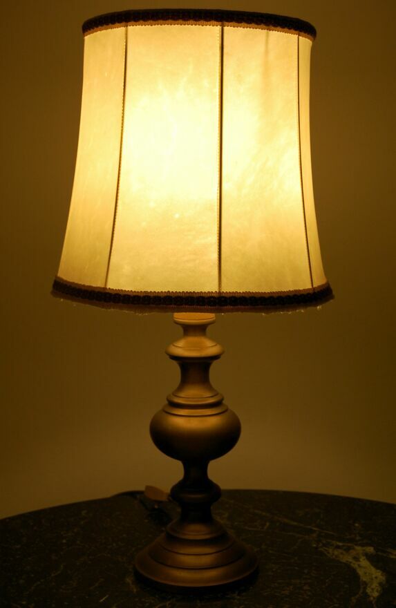 Piękna, duża lampa stołowa z mosiądzu - antyk ze Szwajcarii. Lampa ma mosiężny, toczony korpus. Metal nie ma zarysowań, jedynie jest pokryty patyną. Na życzenie mogę przed wysyłką wyczyścić ją specjalistycznym płynem do pielęgnacji metali. Gwint ma podstawę z beżowego tworzywa uformowaną w kształt topiącej się świecy. Abażur jest wykonany z pergaminu (ze skóry) w kolorze jasnego beżu, na jednym panelu pergamin jest pęknięty - widoczne na zdjęciach. Abażur można wymienić na inny (jest możliwość zakupienia lampy bez abażuru). Lampa jest sprawna, gwint i przewód z wtyczką i włącznikiem nie mają uszkodzeń. Lampa jest stabilna, dość ciężka. Stan zachowania bardzo dobry.CENA NIE PODLEGA NEGOCJACJI.