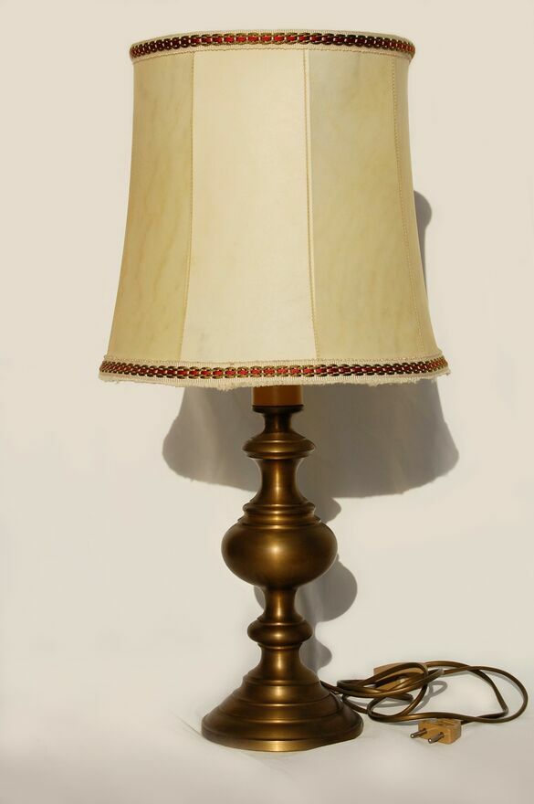 Mosiężna lampa stołowa, mosiądz, pergaminowy abażur, antyk