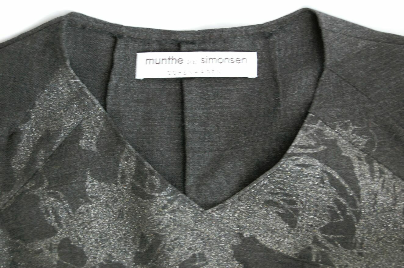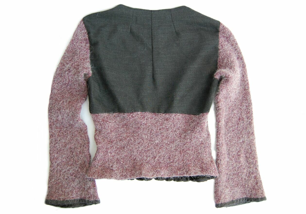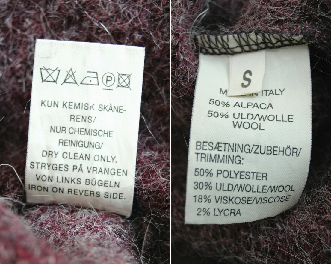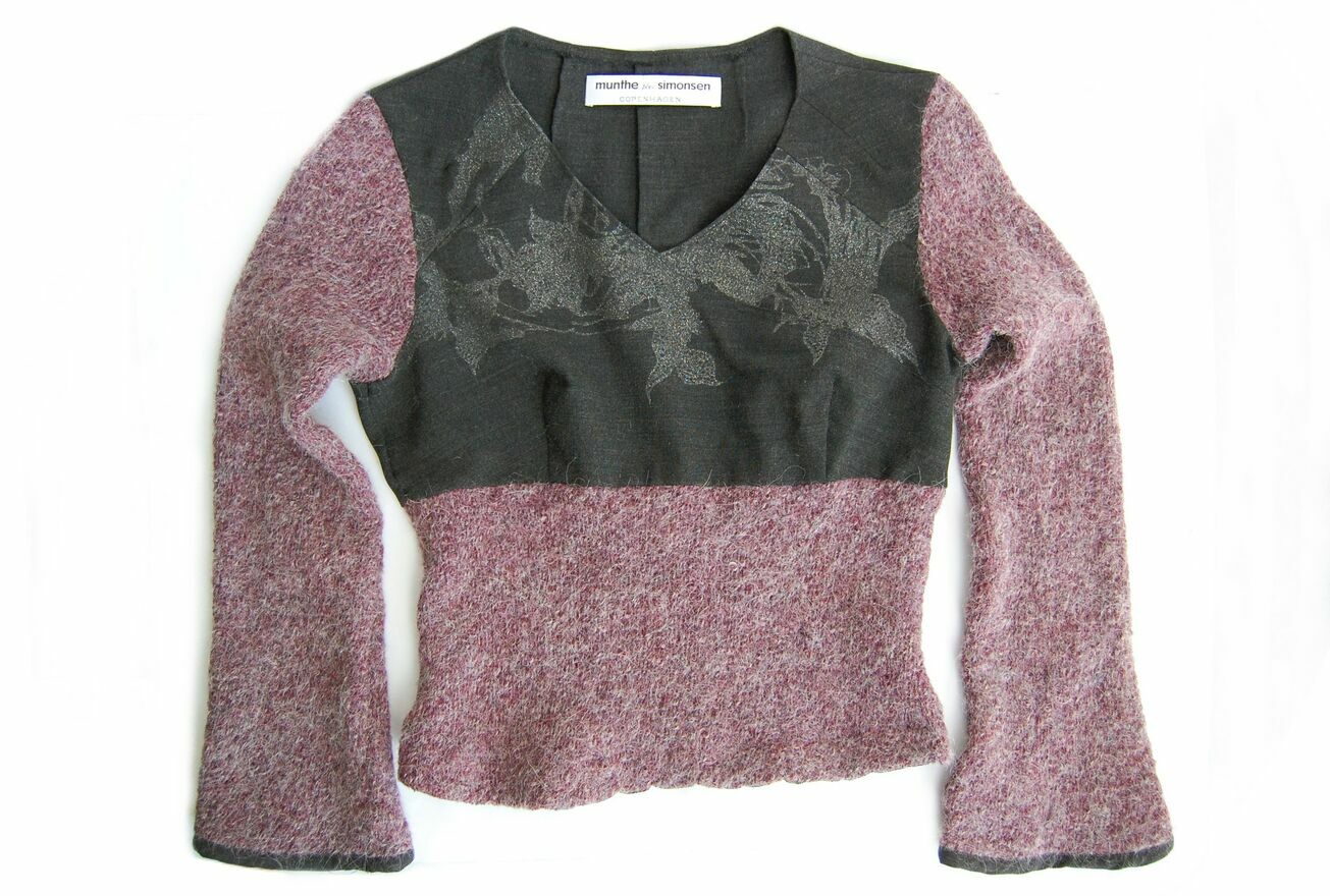 Baśniowo piękny sweter z rozszerzanymi rękawami dla leśnej elficzki. :) Duńska marka Munthe Plus Simonsen, Copenhagen, sweter był zakupiony na wyspie Bornholm. Rozmiar 36 (S) - proszę sprawdzić wymiary. Sweter jest artystycznie wykonany z liliowej, włochatej wełny o cudnej barwie kwiatów wrzosu z jaśniejszymi, dłuższymi włóknami oraz ciemnoszarej dzianiny ozdobionej przy dekolcie wzorem malowanym srebrnym brokatem. Materiał, skład: rękawy i spód (liliowe): 50% alpaka, 50% wełna. Część z szarej dzianiny, w tym lamówki rękawów: 50% poliester, 30% wełna, 18% wiskoza, 2% lycra. Stan zachowania bardzo dobry, sweter był bardzo rzadko noszony, starannie przechowywany, zadbany.Wymiary mierzone na płasko: