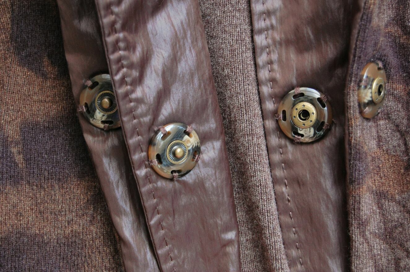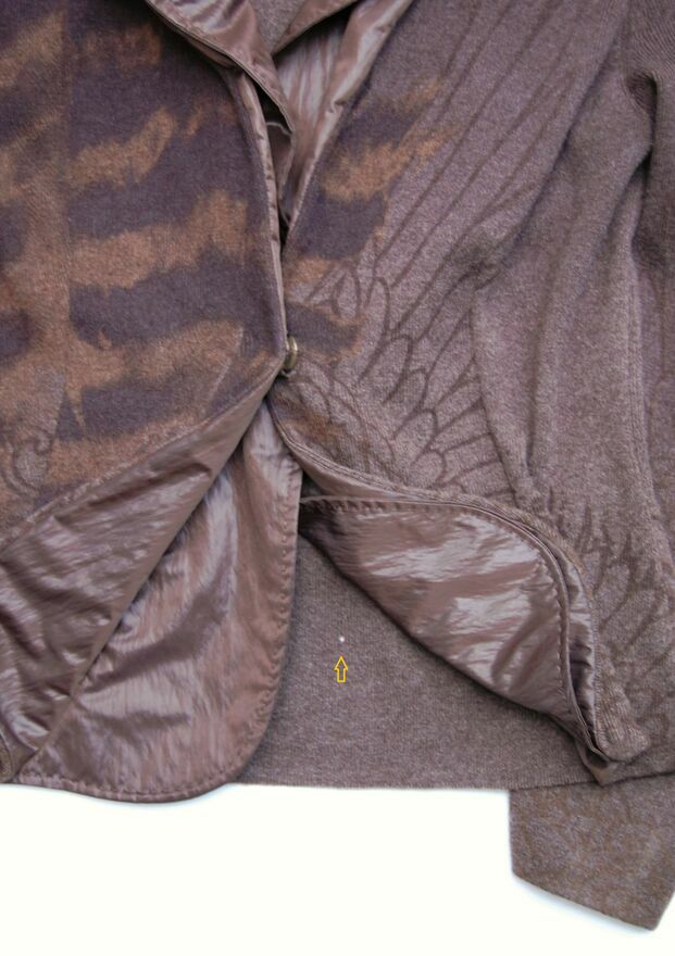 Elegancki, wełniany żakiet damski z artystycznym wzorem feniksa, Nice Connection. Rozmiar 42 (XL) - może pasować na osoby noszące rozmiary M i L. Skład materiału: 70% wełna, 30% kaszmir, podszewka: 51% nylon/poliamid, 49% poliester. Żakiet ma kolor brązowy, cieniowany, w odcieniach ciepłego i płowego brązu, ze wzorem piór i feniksa, który także jest cieniowany. Od frontu jest podszewka z kołnierzem z połyskującej, brązowej tafty poliestrowej. Żakiet zapina się na dwa, duże, ozdobne zatrzaski z metalu i tworzywa imitującego szylkret. Stan zachowania bardzo dobry, żakiet był bardzo rzadko noszony, materiał jest gładki, bez zmechacenia. Jedyną niedoskonałością jest mała dziurka z tyłu, u dołu (widoczna na zdjęciach), nie wpływa na strukturę materiału.Wymiary mierzone na płasko bez rozciągania: