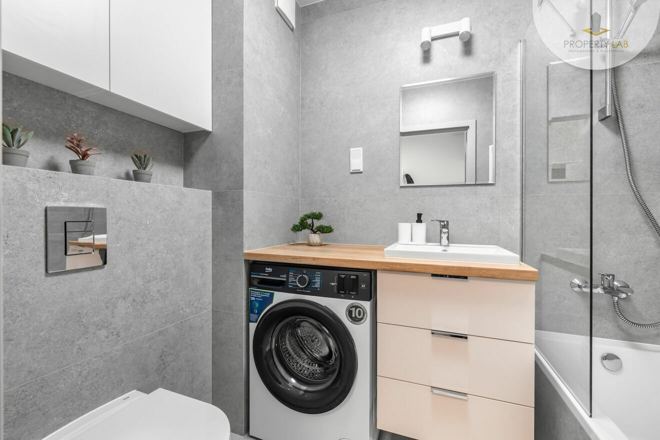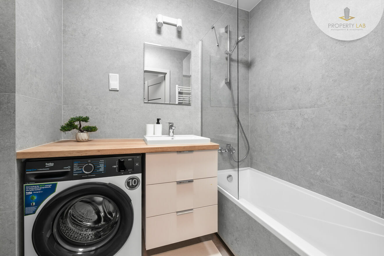 Łazienka: wanna z parawanem prysznicowym, umywalka z szafką, lustro, pralka