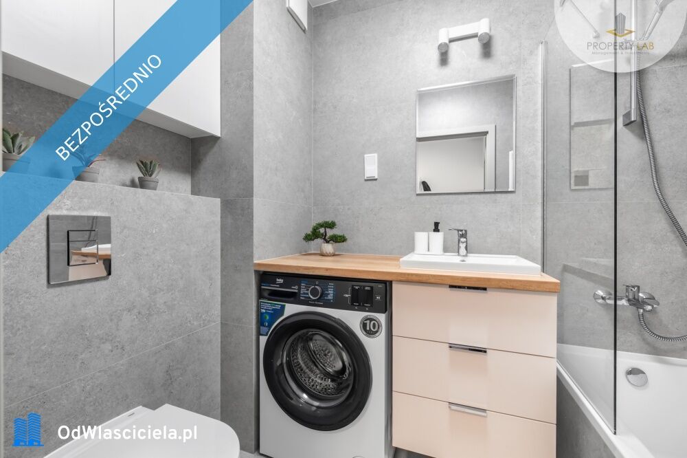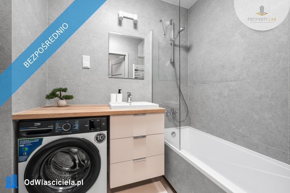 Łazienka: wanna z parawanem prysznicowym, umywalka z szafką, lustro, pralka