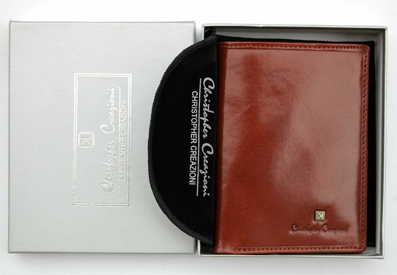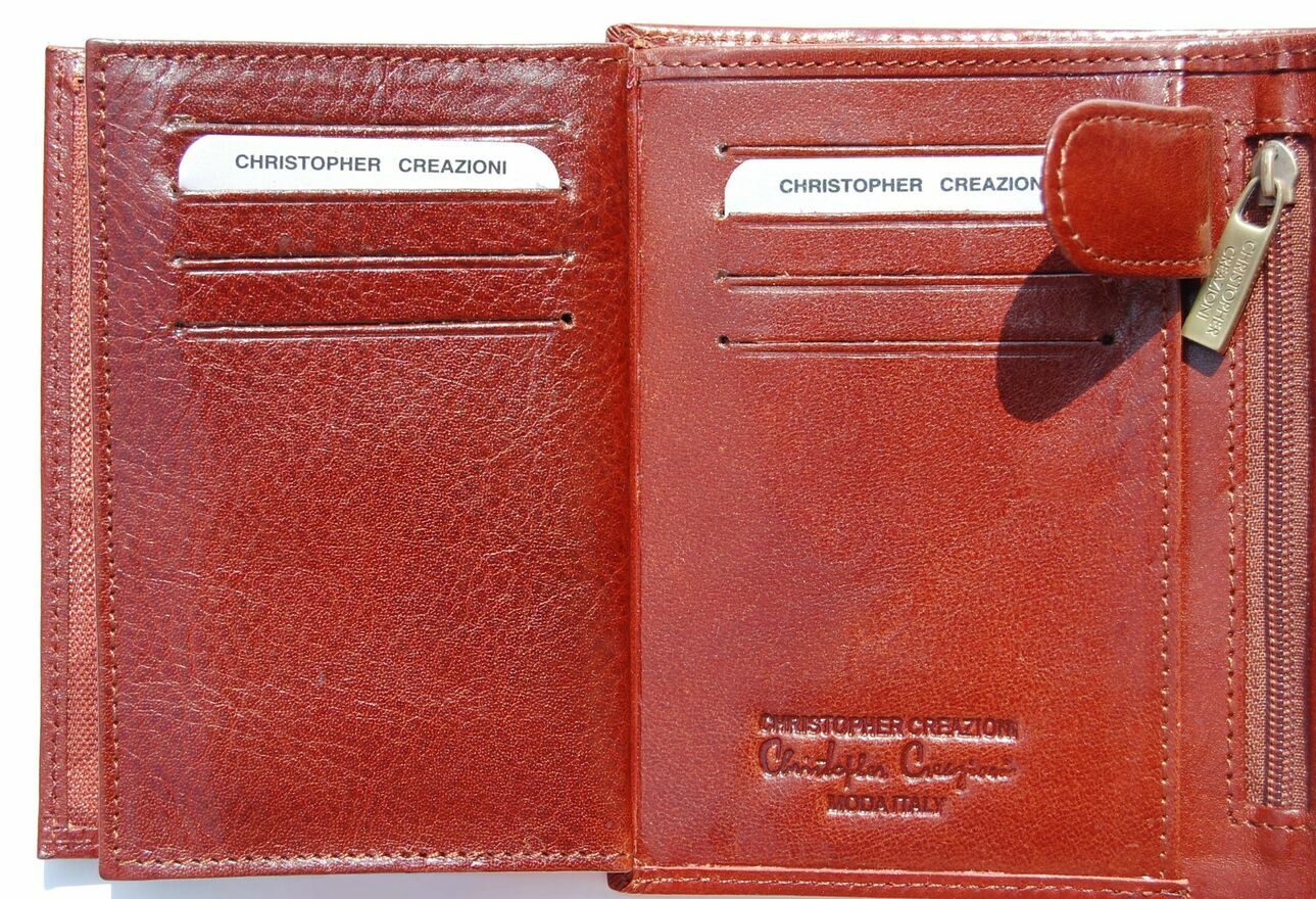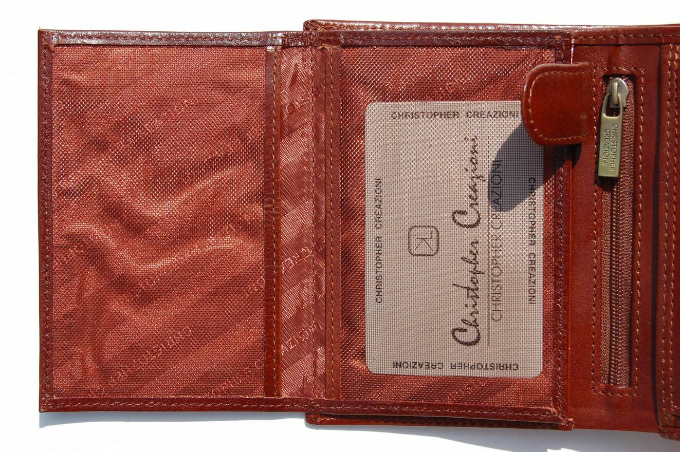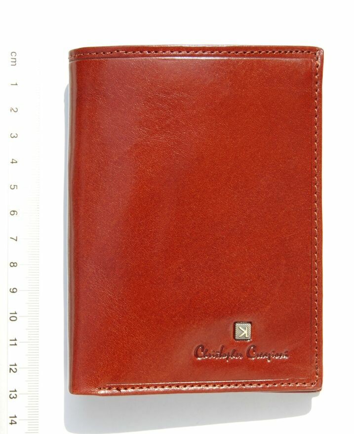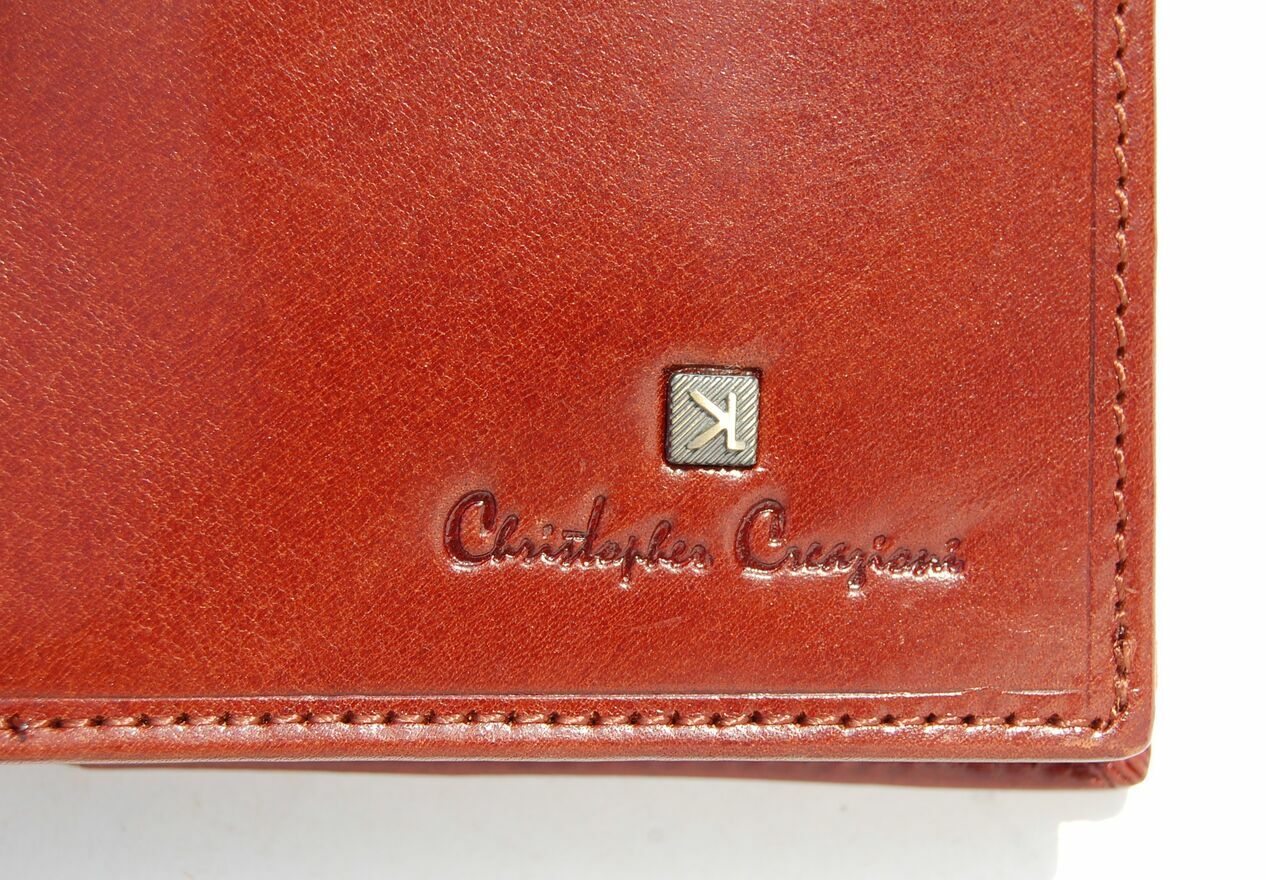 Portfel skórzany, męski włoskiej firmy Christopher Creazioni. Kolor: brandy (brązowy). Portfel jest wykonany z najlepszej, włoskiej skóry licowej wyprawianej roślinnie, wewnątrz posiada wybity próbnik, potwierdzający autentyczność. Portfel jest rozkładany (bez zapiecia), ma pionową orientację. Front jest ozdobiony wytłoczonym napisem i mosiężnym logo marki. Ma 2 kieszenie na banknoty, 1 kieszeń na bilon, zamykaną na zatrzask, 1 kieszeń zamykaną na suwak, 12 przegródek, w tym 3 przezroczyste, na karty, dowód osobisty, rejestracyjny, wizytówki, zdjęcia. Stan: nowy, w firmowym pudełku.CENA NIE PODLEGA NEGOCJACJI.