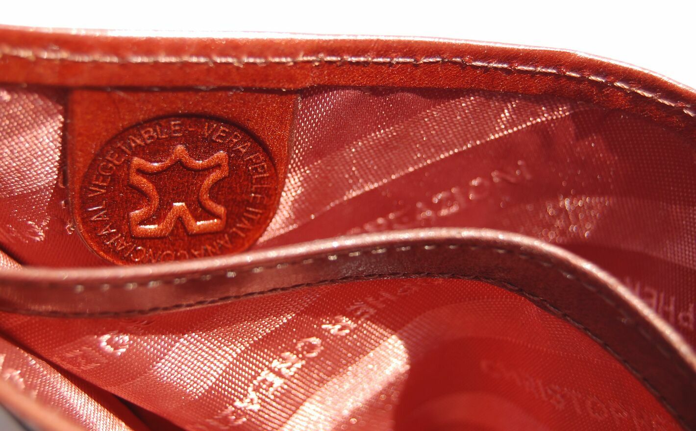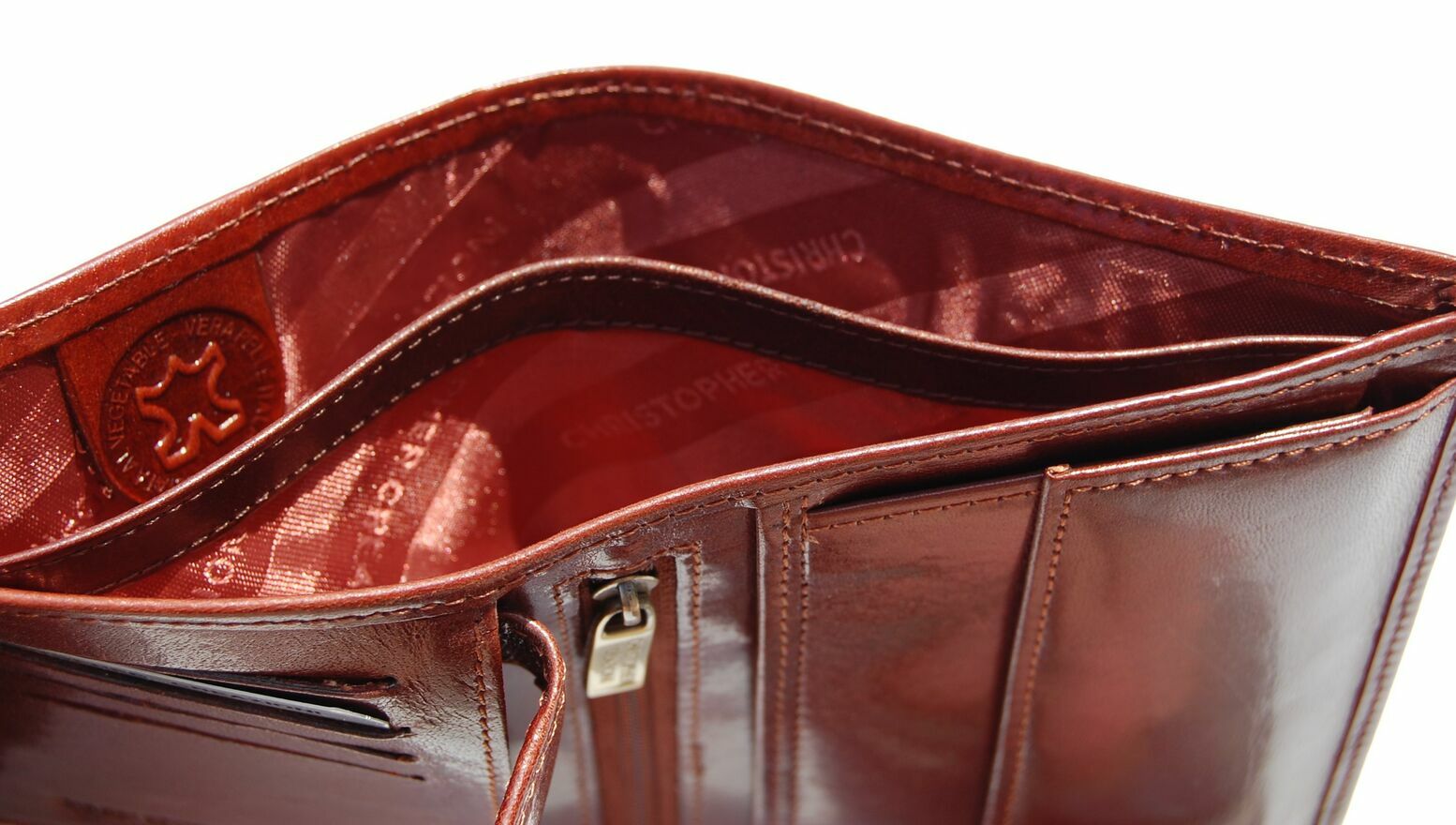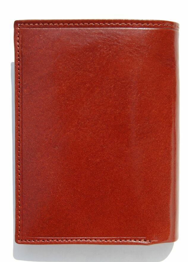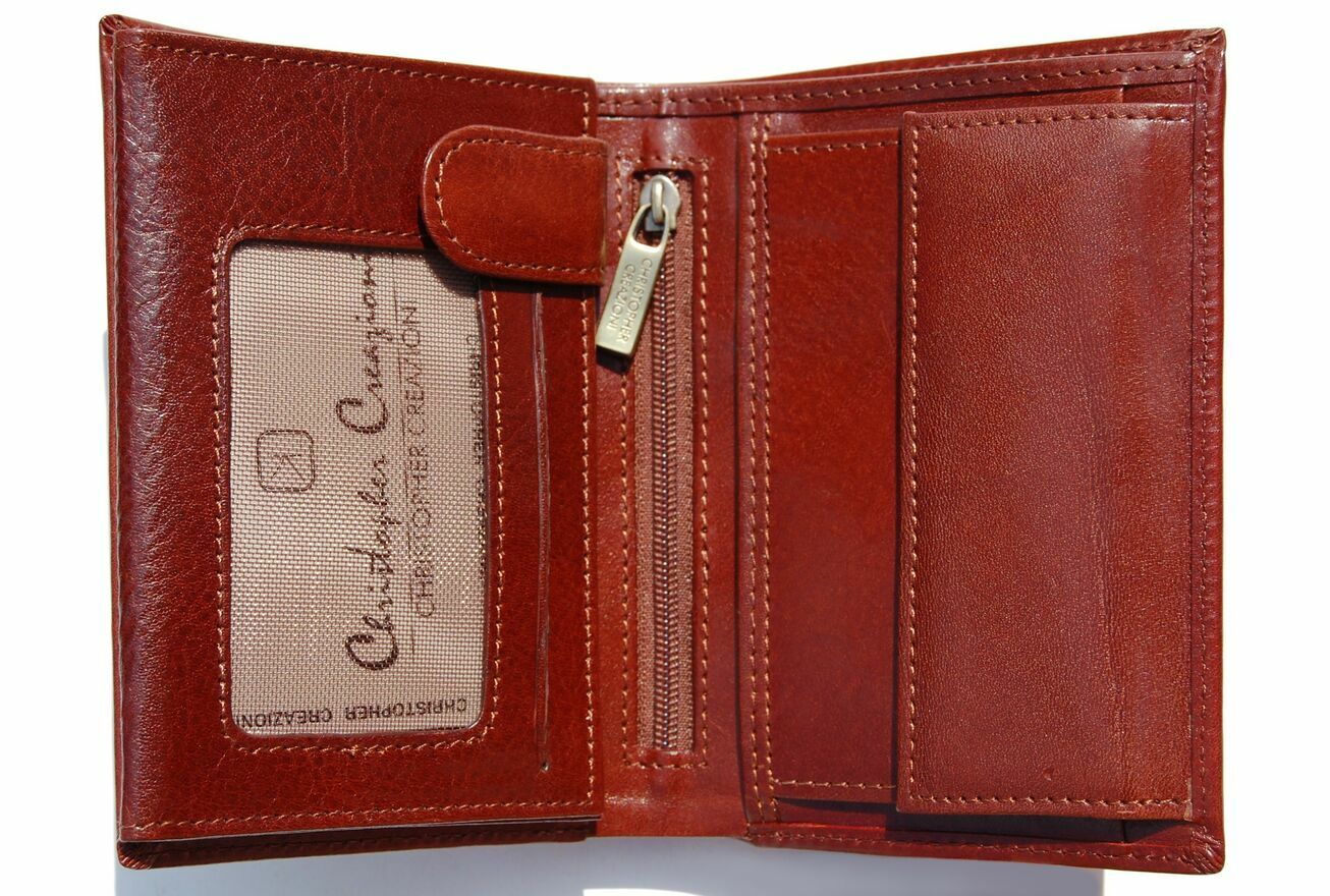 Portfel skórzany, męski włoskiej firmy Christopher Creazioni. Kolor: brandy (brązowy). Portfel jest wykonany z najlepszej, włoskiej skóry licowej wyprawianej roślinnie, wewnątrz posiada wybity próbnik, potwierdzający autentyczność. Portfel jest rozkładany (bez zapiecia), ma pionową orientację. Front jest ozdobiony wytłoczonym napisem i mosiężnym logo marki. Ma 2 kieszenie na banknoty, 1 kieszeń na bilon, zamykaną na zatrzask, 1 kieszeń zamykaną na suwak, 12 przegródek, w tym 3 przezroczyste, na karty, dowód osobisty, rejestracyjny, wizytówki, zdjęcia. Stan: nowy, w firmowym pudełku.CENA NIE PODLEGA NEGOCJACJI.