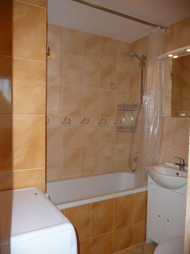 Łazienka: wanna, umywalka z szafką, WC, pralka.