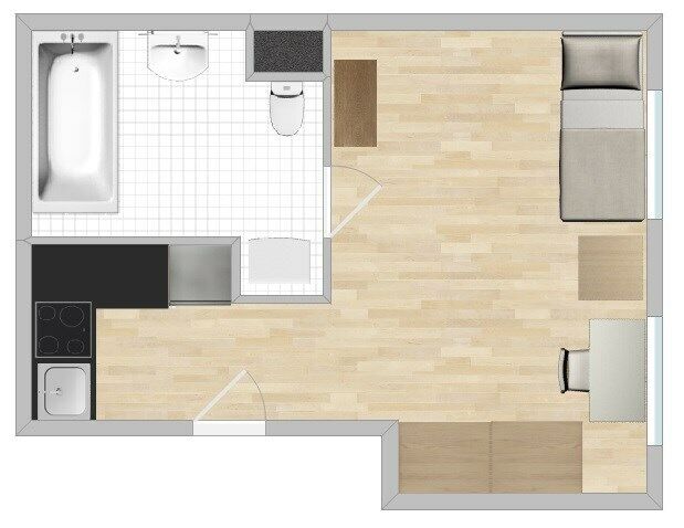 Mieszkanie składa się z pokoju z aneksem kuchennym oraz łazienki.