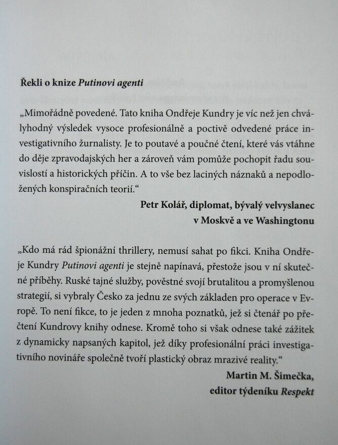 Przyzwyczailiśmy się postrzegać przestrzeń, w której żyjemy, jako bezpieczną. W 1996 roku Czechy przystąpiły do NATO, a sześć lat później do Unii Europejskiej, co wzmocniło przekonanie społeczeństwa, że od tej pory nie będziemy musieli stawiać czoła żadnym większym zagrożeniom. I że możemy spokojnie skupić się na wszystkim, co możliwe, oprócz ochrony naszych swobód i bezpieczeństwa. Ale gdy zajmowaliśmy się interesami, podróżami, rozrywką czy pracą, Rosja nigdy nie wycofała stąd swoich tajnych agentów; wręcz przeciwnie, w ostatnich latach ich szeregi zostały znacząco wzmocnione. Powierzono im szereg zadań, polityczne wsparcie ze strony kierownictwa Kremla i praktycznie nieograniczone fundusze na ich działalność. Z jasnym celem podważenia wciąż jeszcze chwiejnej demokracji, wprowadzenia do niej chaosu, osłabienia jej pozycji w strukturach obronnych i politycznych Zachodu oraz przejęcia naszych sekretów. Ostatnio z podobnym zdziwieniem obserwują szeroko zakrojoną działalność rosyjskiego szpiegostwa w wielu innych krajach UE. Okazuje się, że destrukcyjna działalność rosyjskich służb specjalnych nie jest reliktem czasów, które dawno minęły, pogrzebanym wraz z upadkiem Żelaznej Kurtyny, ale że nadszedł czas, aby poważnie się nią zająć.