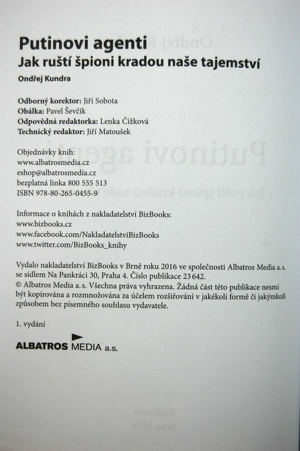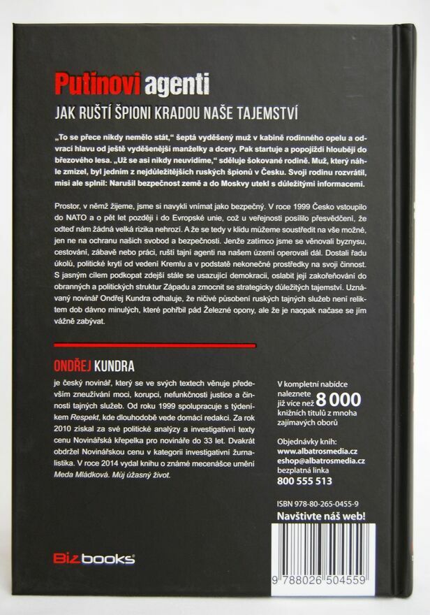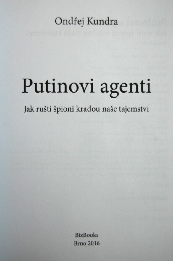 "Putinovi agenti: Jak ruští špioni kradou naše tajemství" Ondřej Kundra. Książka w języku czeskim. Wydawnictwo BizBooks, 2016 r. Twarda okładka. Liczba stron 200. Książka jest nowa.Wymiary: 21 x 15 cm.