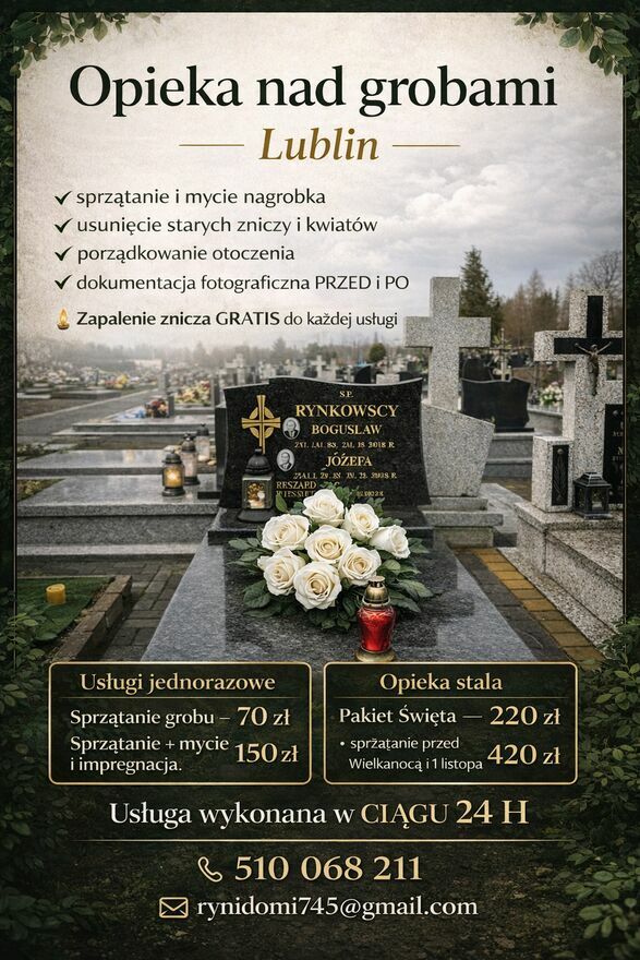 Opieka nad grobami — LublinOferuję rzetelną i pełną szacunku opiekę nad grobami na terenie Lublina i okolic.