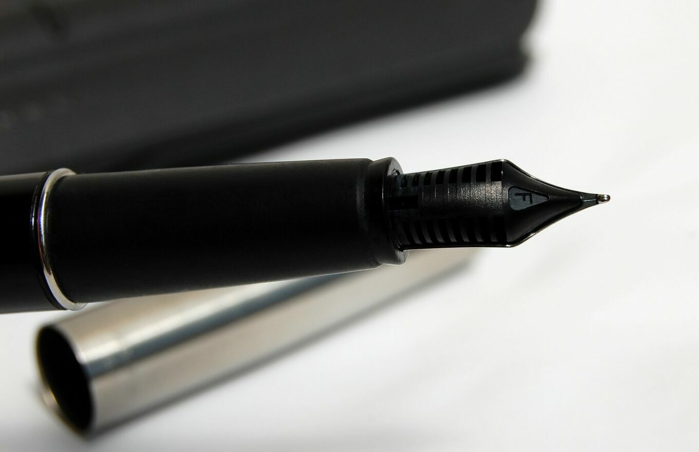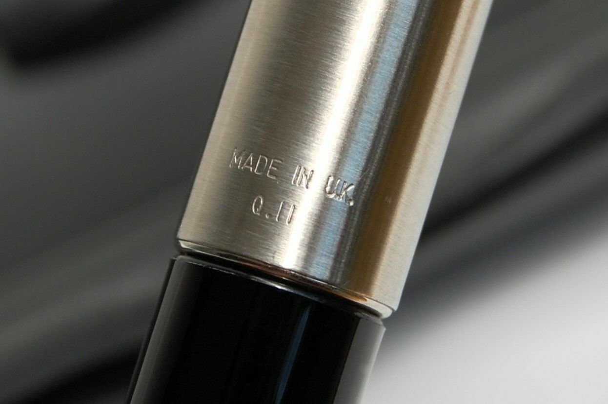 Pióro wieczne firmy Parker, model Frontier z sygnaturą "made in U.K. Q.II" - wyprodukowany w Wielkiej Brytanii w 2000 r. Model obecnie już nie jest produkowany. Pióro ma czarną, błyszczącą obudowę (nieprzezroczystą), uchwyt jest wykonany z matowej, czarnej gumy. Wykończenia są ze stali nierdzewnej z połyskiem, skuwka pióra jest satynowana z błyszczącym klipsem. Stalówka pióra ze stali nierdzewnej ma rozmiar F, jest ozdobiona grawerunkiem. Pióro znajduje się w plastikowym, czarnym etui. Stan zachowania bardzo dobry, pióro było rzadko używane. Jedyne ślady użytkowania to delikatne, poprzeczne zarysowanie z jednej strony na skuwce (widoczne na zdjęciach) i bardzo drobne, minimalne rysy na stalówce i obudowie. Powierzchnia etui ma zarysowania - widoczne na zdjęciach. Pióro pisze gładko, dołączam nowy, duży nabój marki Parker z niebieskim atramentem. Polecam kolekcjonerom.CENA NIE PODLEGA NEGOCJACJI.