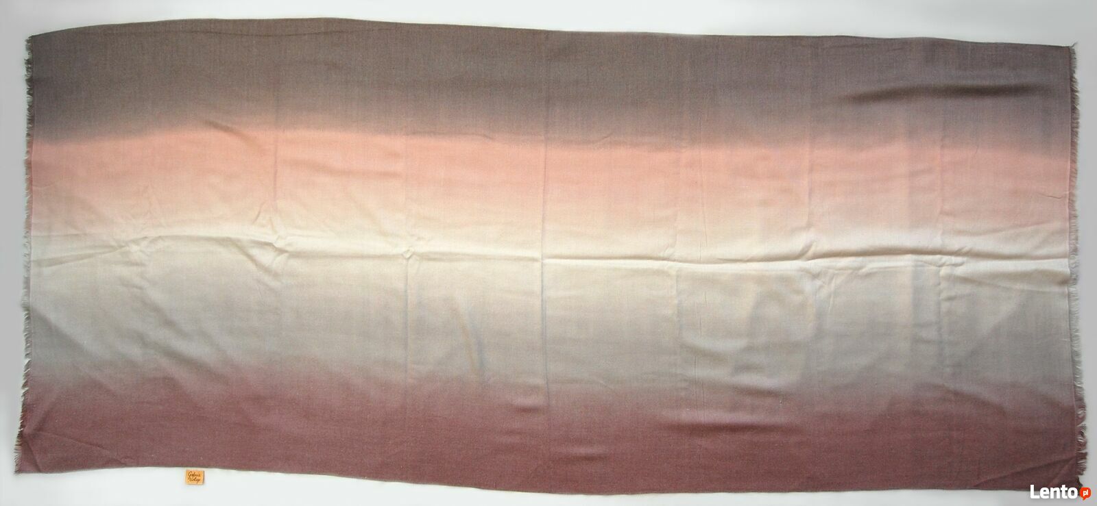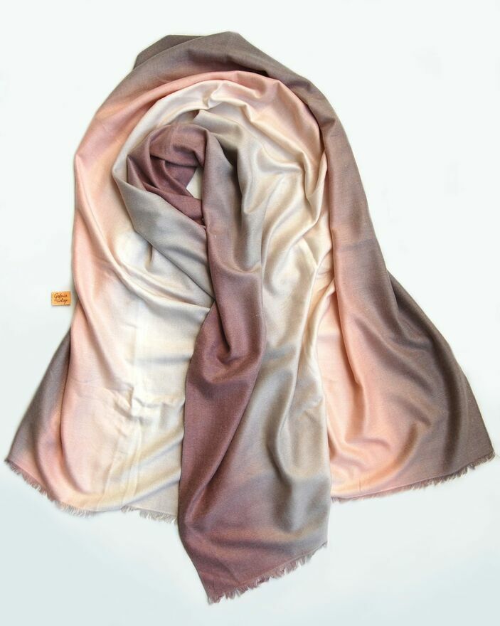Długi szal damski w pięknych, pastelowych kolorach mglistego wschodu słońca. Kremowa biel, pudrowy róż, beż, angielski róż i szarość w płynnie przenikają się w pasmach. Skład materiału: 80% bawełna, 20% kaszmir. Materiał jest delikatny w dotyku, miękki, ciepły. W dwóch miejscach są małe zgrubienia nici, które nie wpływają na trwałość materiału - pokazane w białych okręgach na zdjęciach. Szal jest nowy.CENA NIE PODLEGA NEGOCJACJI.