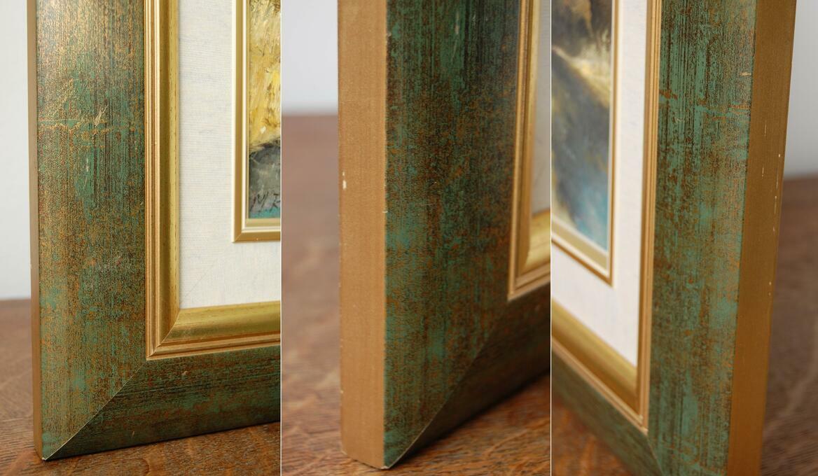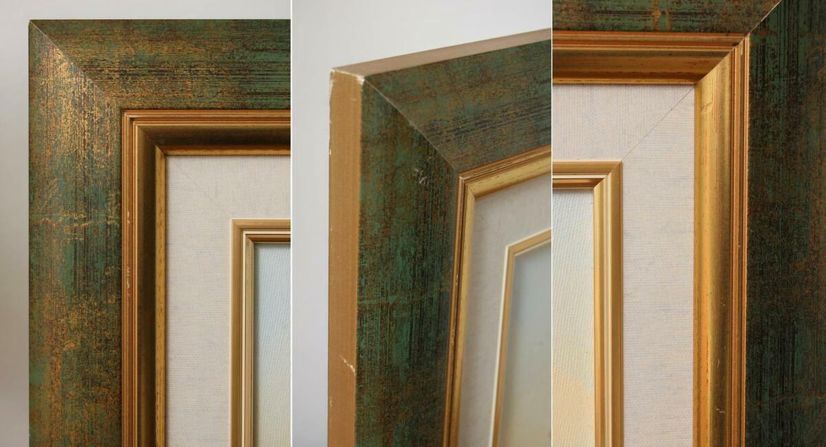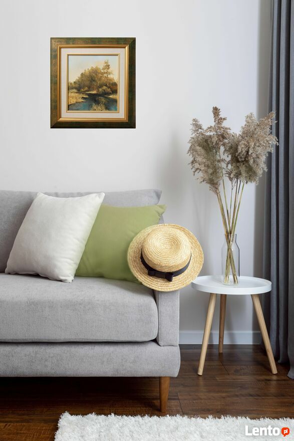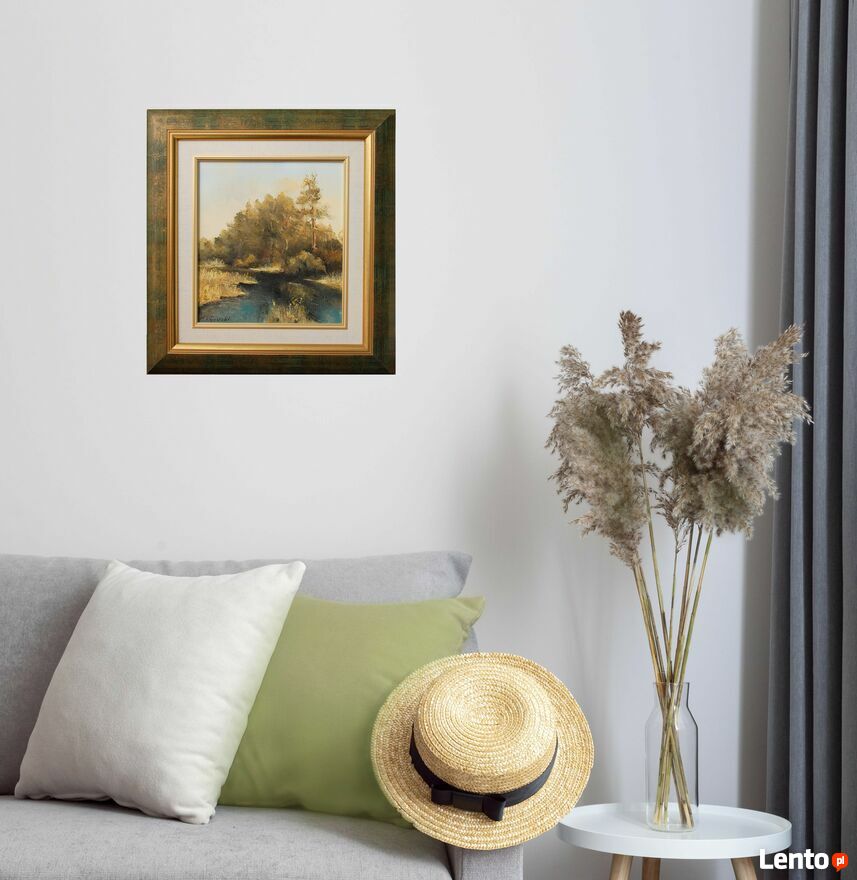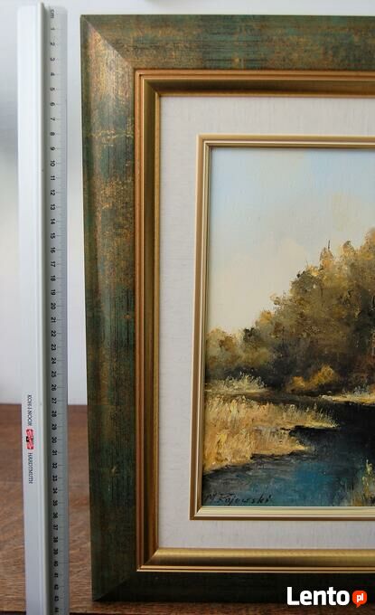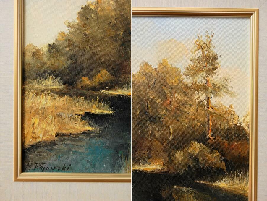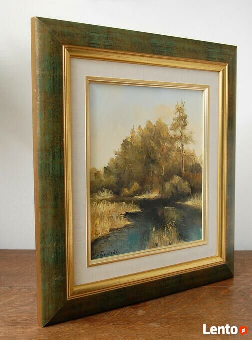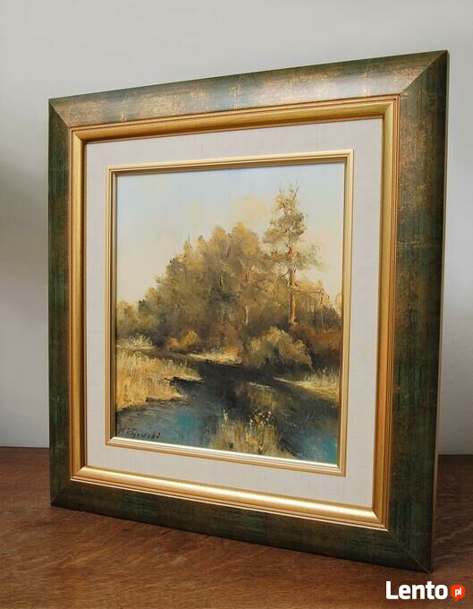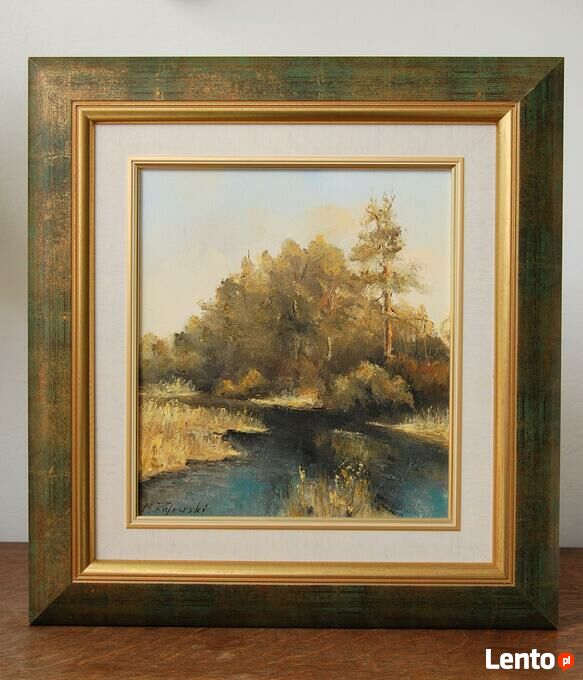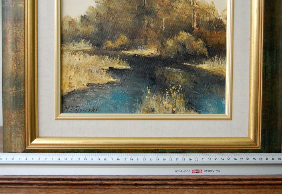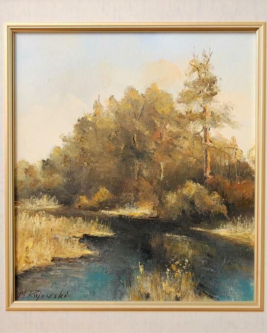 Pejzaż przedstawiający polski krajobraz: las z rzeką, rozlewiskiem - obraz olejny, sygnowany M. Rojewski. Obraz jest ręcznie namalowany na płótnie. Leśny krajobraz ma kolory charakterystyczne dla jesieni. Ciepłe, stonowane: oliwkowa zieleń, brąz, ochra (złamany odcień żółcieni, żółto-beżowy), skontrastowane są z chłodnym akcentem pruskiego błękitu głębokiej toni wody. Obraz jest oprawiony w ozdobną ramę drewnianą w kolorze zielonym przecieranym złotem i brązem, ze złotym fazowaniem i obramowaniem wokół obrazu, imitującym płótno. Stan zachowania bardzo dobry, z minimalnymi zarysowaniami na ramie (pokazane na zjęciach ze zbliżeniem).Wymiary obrazu wraz z ramą (wysokość x szerokość x głębokość): 47 x 44 x 3,8 (cm).