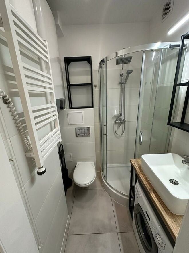 Łazienka: kabina prysznicowa, umywalka, pralka, WC podwieszane.