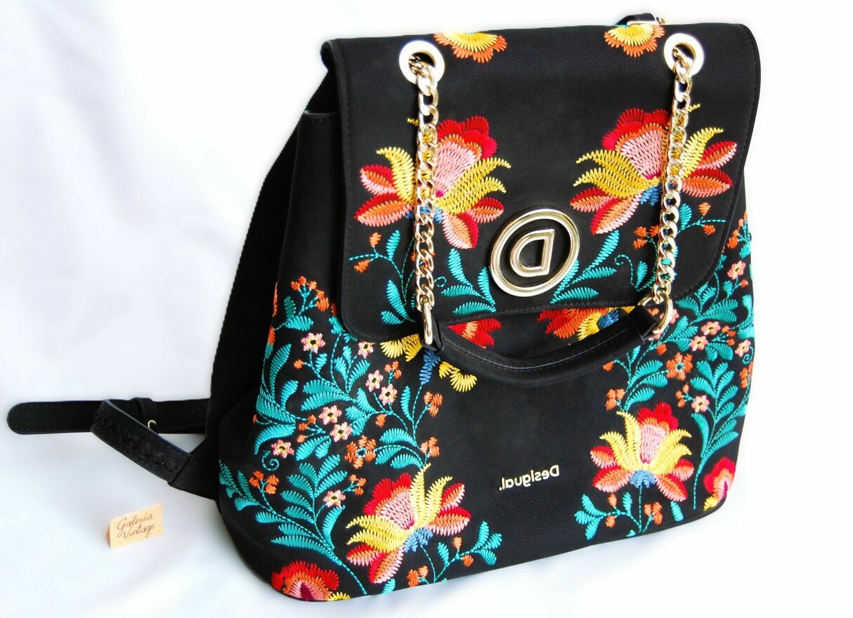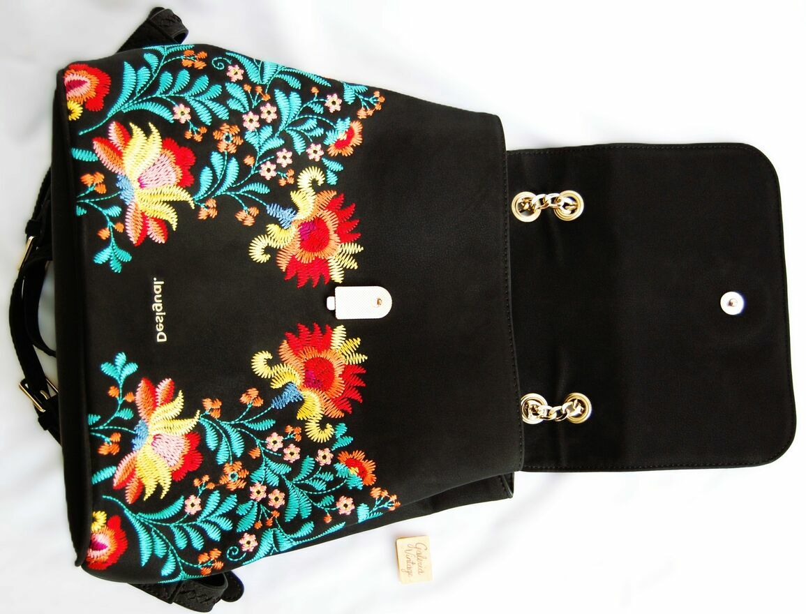 Plecak damski Desigual, model Adagio Denver - jeden z najładniejszych modeli haftowanych plecaków tej marki, niedostępny już w sprzedaży. Kolor czarny. Materiał zewnętrzny ma fakturę skóry i delikatnie zamszową powierzchnię - skład: 100% poliuretan. Podszewka jest w 100% z bawełny w kolorze czarnym. Plecak zdobi piękny haft z motywem kwiatów w kolorach czerwonym, pomarańczowym, żółtym i łososioworóżowym, błękitnym, z listkami w kolorze eukaliptusowej zieleni (jasna zieleń z domieszką błękitu). Okucia i logo są złote. Uchwyt plecaka jest połączony złotym łańcuchem z szelkami, podczas noszenia plecaka za uchwyt łańcuch przesuwa się do góry, co umożliwia noszenie plecaka jak torebki. Szelki mają długość regulowaną klamrami. Plecak jest zapinany na zatrzask z zabezpieczeniem przed przypadkowym otwarciem. We wnętrzu jest jedna komora i dwie kieszenie: otwarta i zapinana na zamek. Plecak jest nowy.CENA NIE PODLEGA NEGOCJACJI.