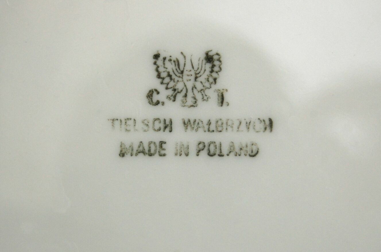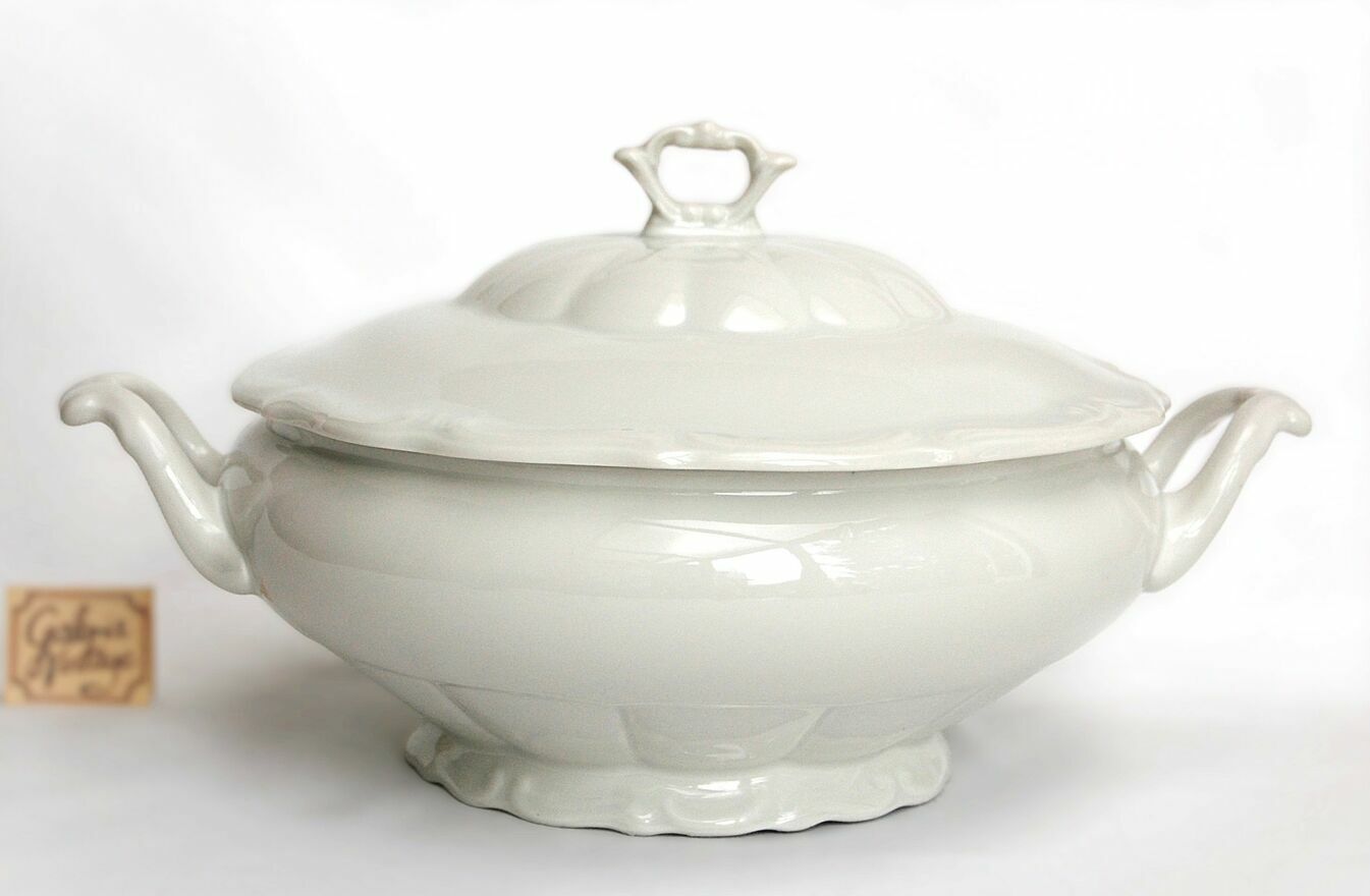 Piękna, klasyczna, stara waza do zupy. Sygnowana Tielsch Wałbrzych, made in Poland. Sygnatura stosowana w latach 1945-52. Pojemność: ok. 1,7 litra.Waza jest wykonana z białej, szkliwionej porcelany z delikatnym ornamentem wokół krawędzi pokrywy i ozdobnymi uchwytami. Waza była jedynie przechowywana, jest nowa - w idealnym stanie, bez uszkodzeń, bez wad.
