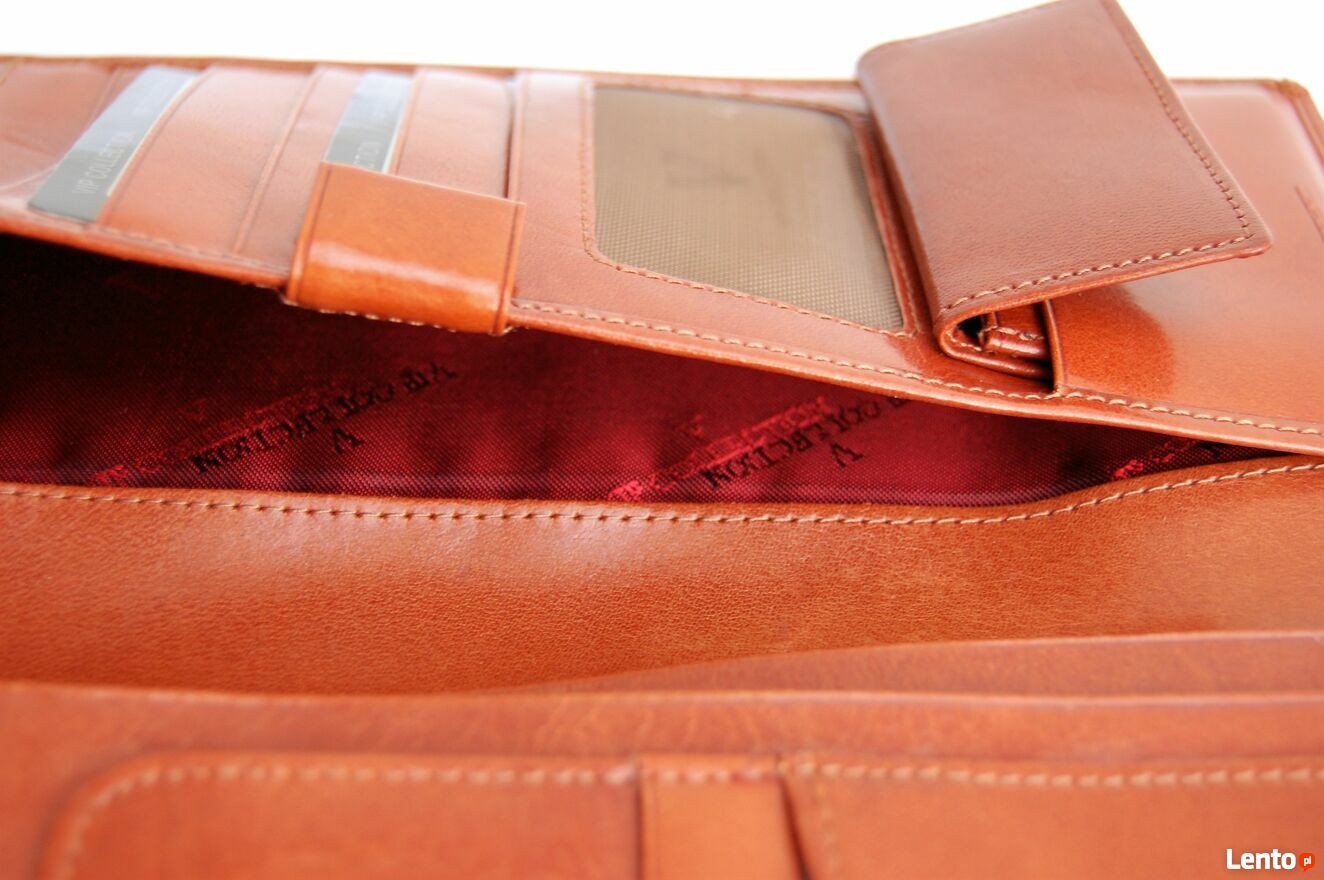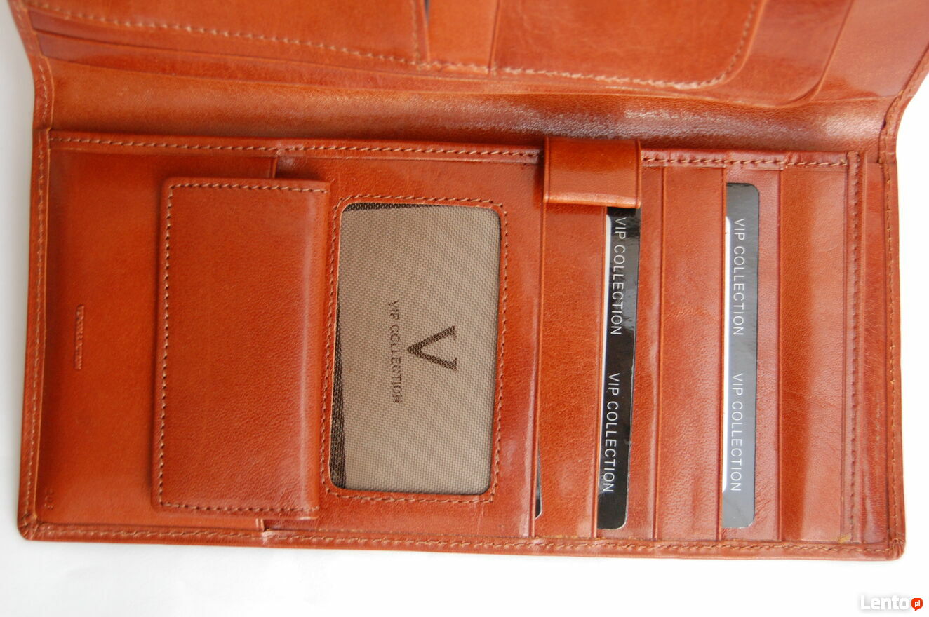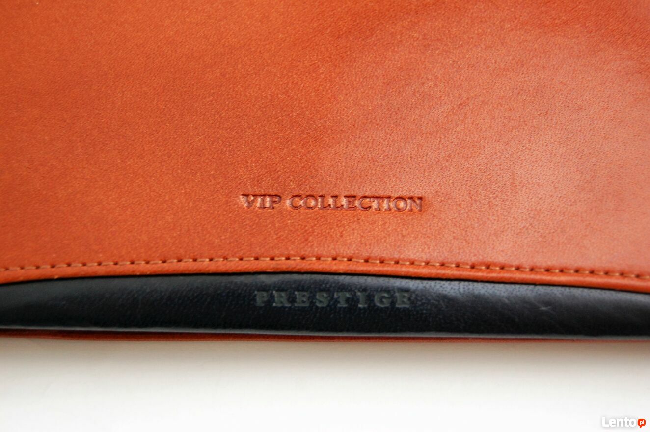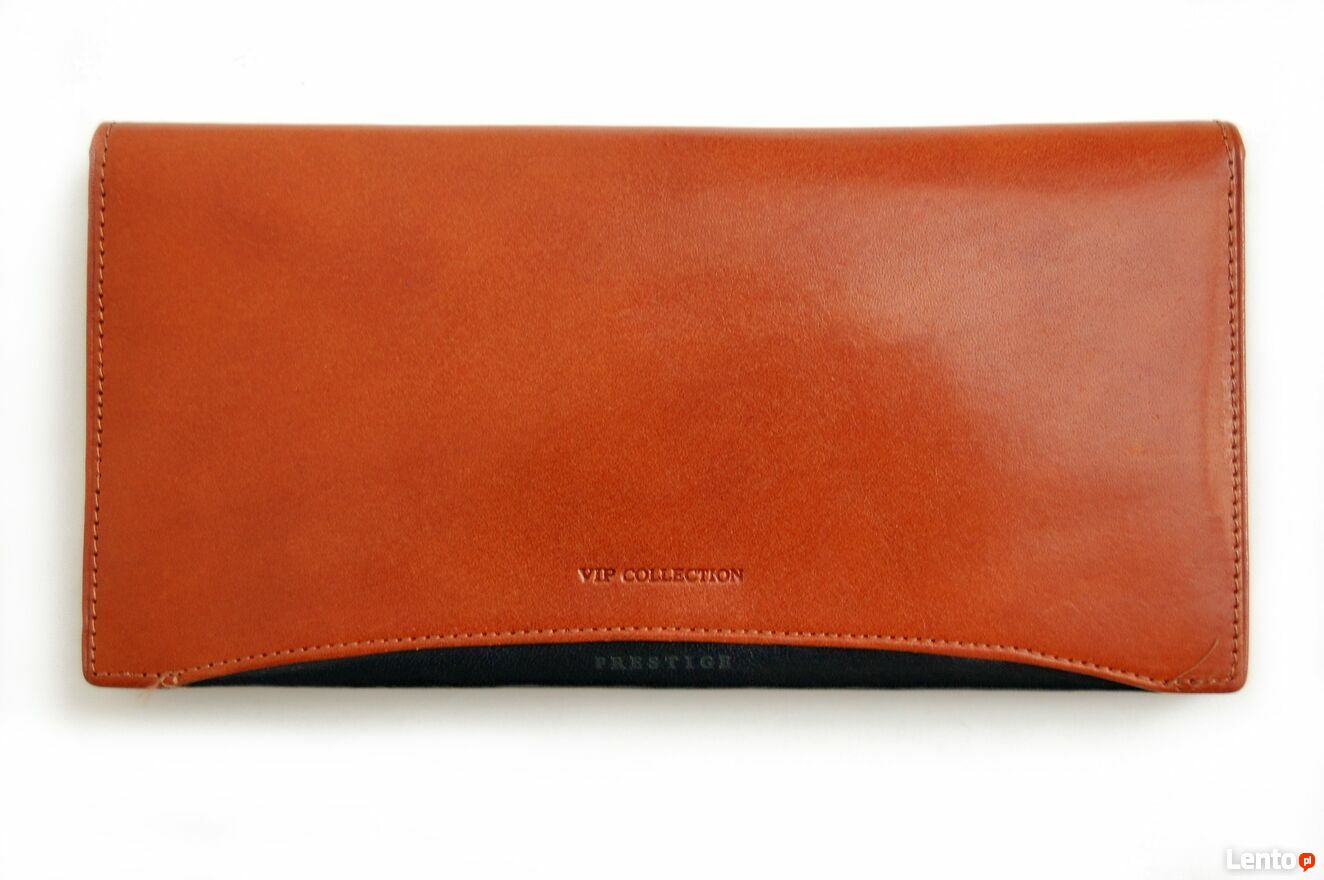 Elegancki portfel męski marki Vip Collection. Portfel jest wykonany z włoskiej skóry naturalnej, licowej w kolorze koniakowego brązu z czarnymi wstawkami. Wewnątrz są 3 przegrody na banknoty, 8 kieszeni na karty i wizytówki, wyjmowana kieszonka na bilon, zapinana na zatrzask. Portfel jest rozkładany, bez zapięcia. Stan: nowy.Wymiary (długość x szerokość x głębokość): 22 x 10,8 x 2 (cm).