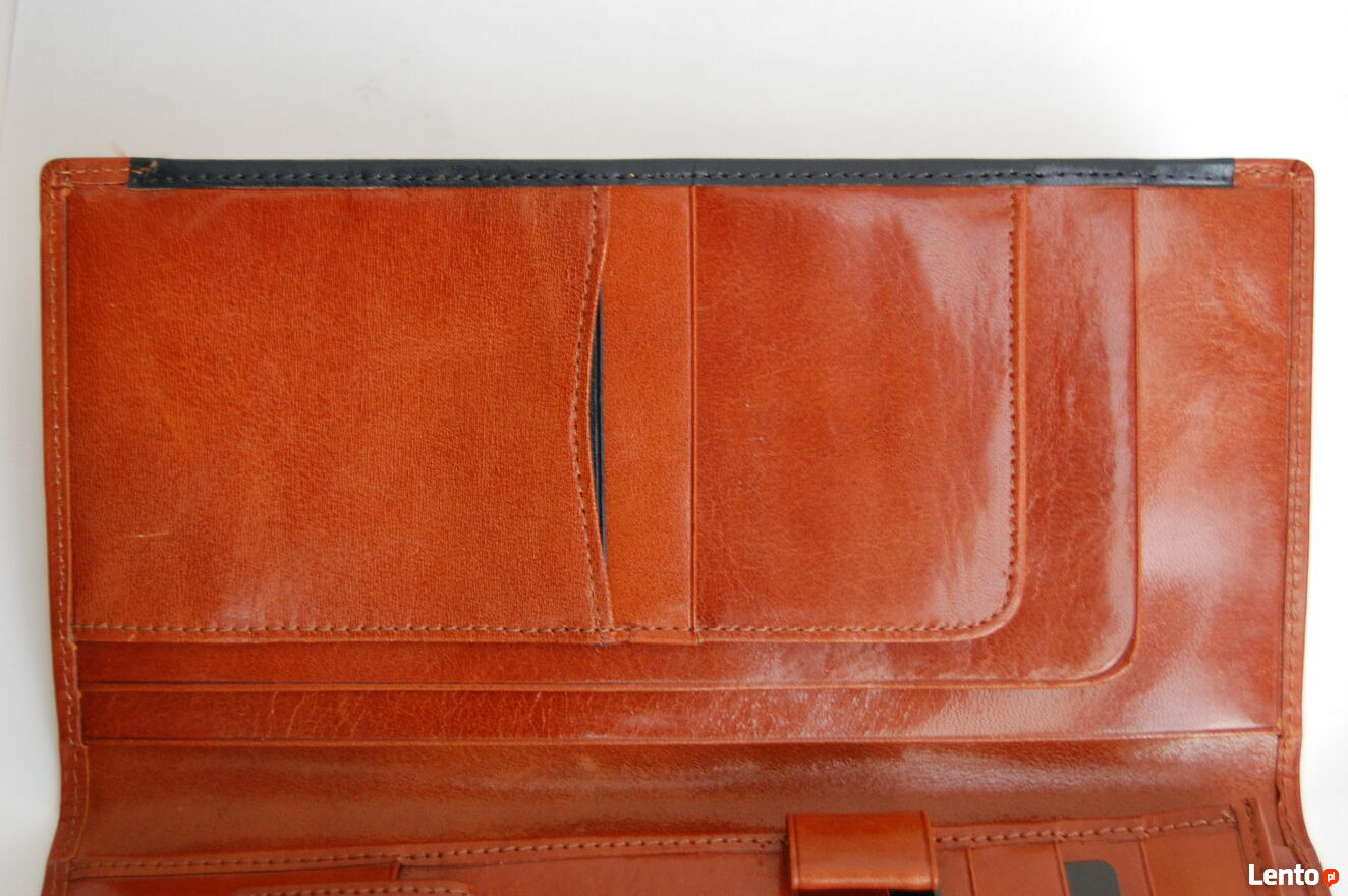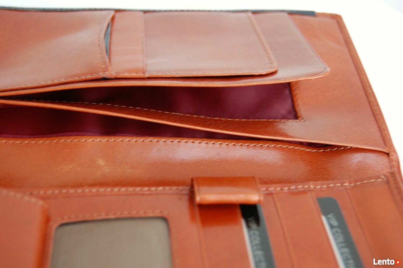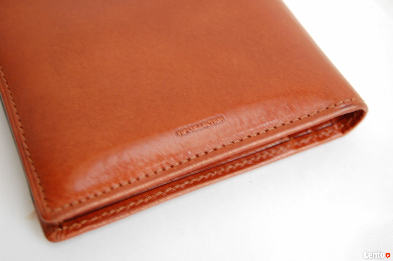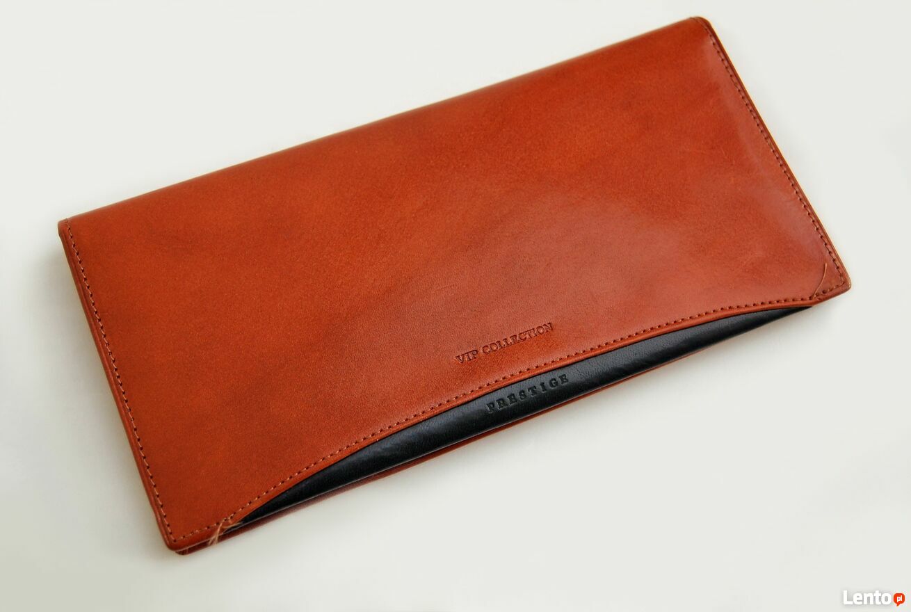 Elegancki portfel męski marki Vip Collection. Portfel jest wykonany z włoskiej skóry naturalnej, licowej w kolorze koniakowego brązu z czarnymi wstawkami. Wewnątrz są 3 przegrody na banknoty, 8 kieszeni na karty i wizytówki, wyjmowana kieszonka na bilon, zapinana na zatrzask. Portfel jest rozkładany, bez zapięcia. Stan: nowy.Wymiary (długość x szerokość x głębokość): 22 x 10,8 x 2 (cm).