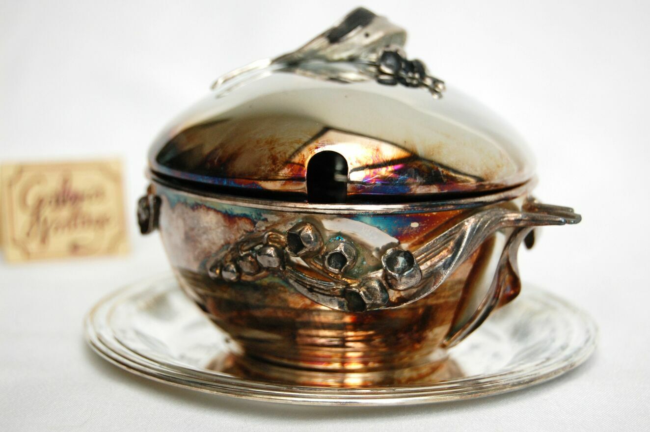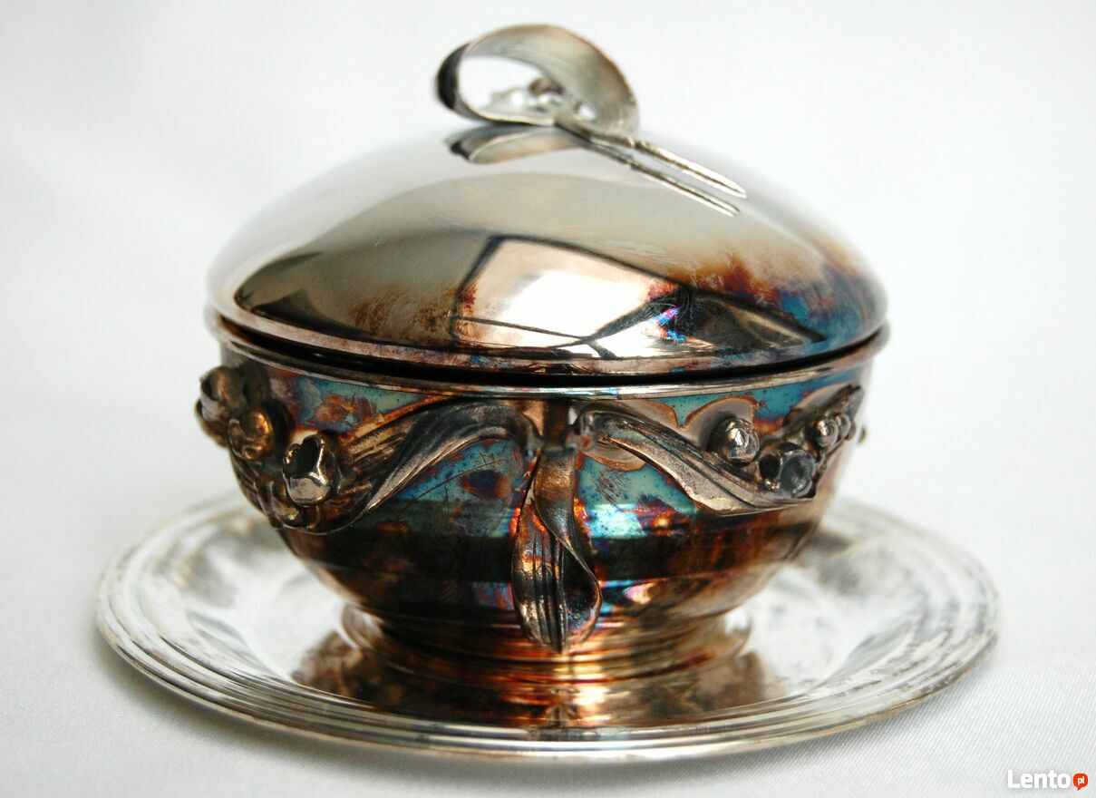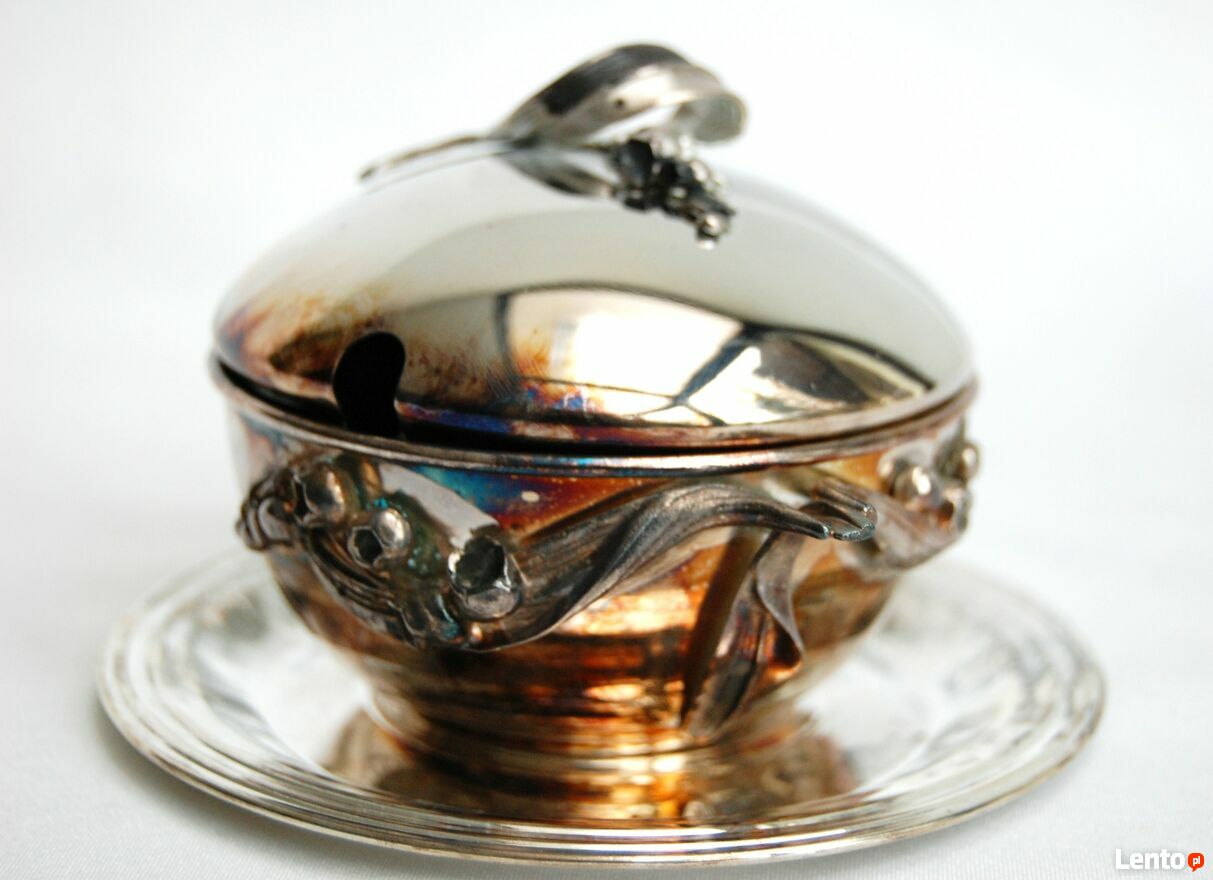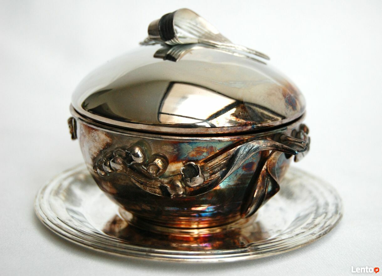 Piękna, platerowana srebrem cukiernica z motywem konwalii - Resovia, z okresu PRL. Wzornictwo jest inspirowane stylem secesyjnym. Srebrzona powierzchnia jest pokryta naturalną, wielobarwną patyną, którą można odczyścić płynem do pielęgnacji srebra (polecam Starwax). Cukiernica jest nowa, nie była czyszczona, jedynie starannie przechowywana. Jest w idealnym stanie: bez zarysowań i uszkodzeń.Wymiary:
