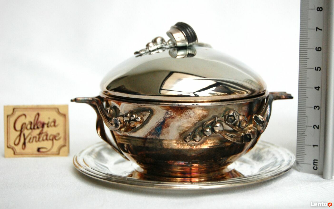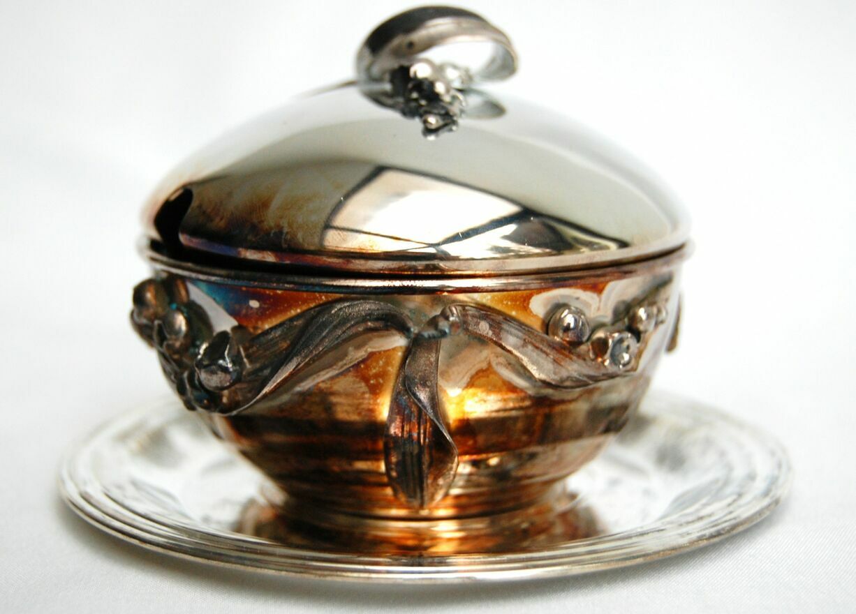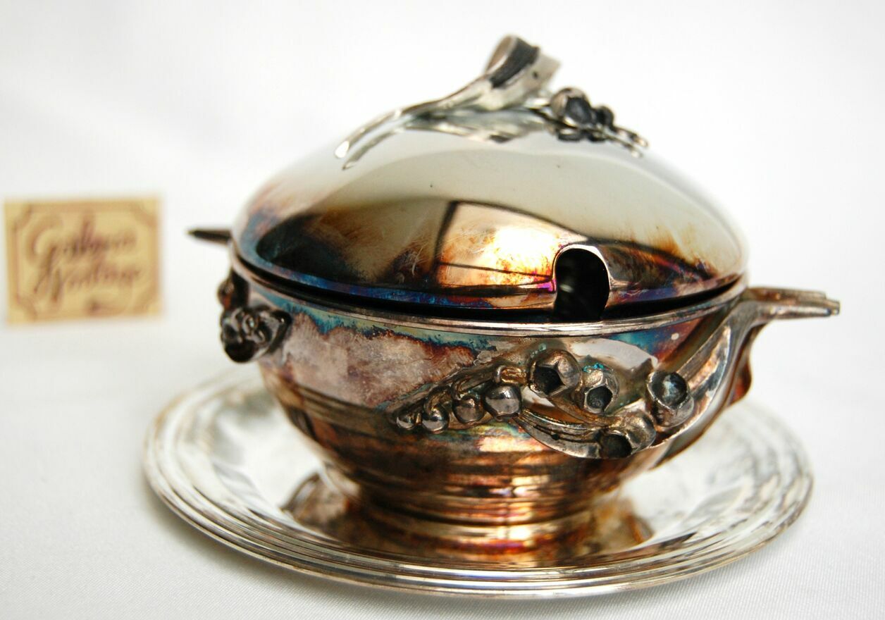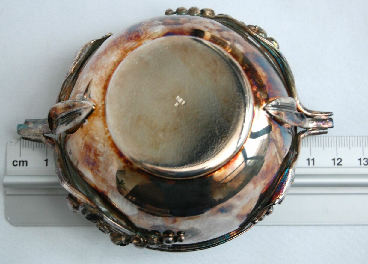 Piękna, platerowana srebrem cukiernica z motywem konwalii - Resovia, z okresu PRL. Wzornictwo jest inspirowane stylem secesyjnym. Srebrzona powierzchnia jest pokryta naturalną, wielobarwną patyną, którą można odczyścić płynem do pielęgnacji srebra (polecam Starwax). Cukiernica jest nowa, nie była czyszczona, jedynie starannie przechowywana. Jest w idealnym stanie: bez zarysowań i uszkodzeń.Wymiary: