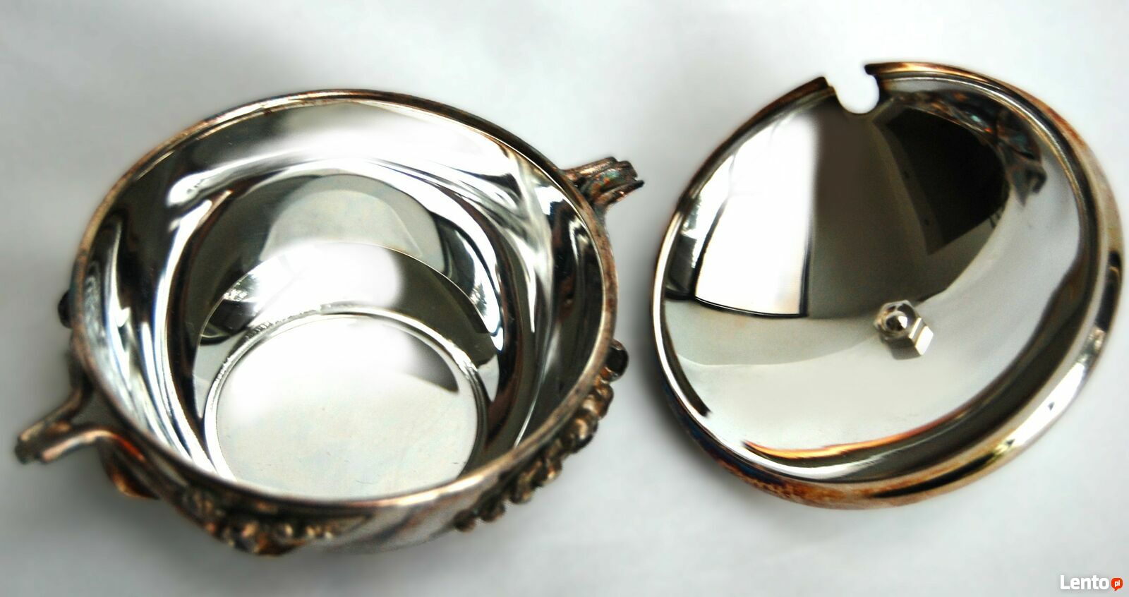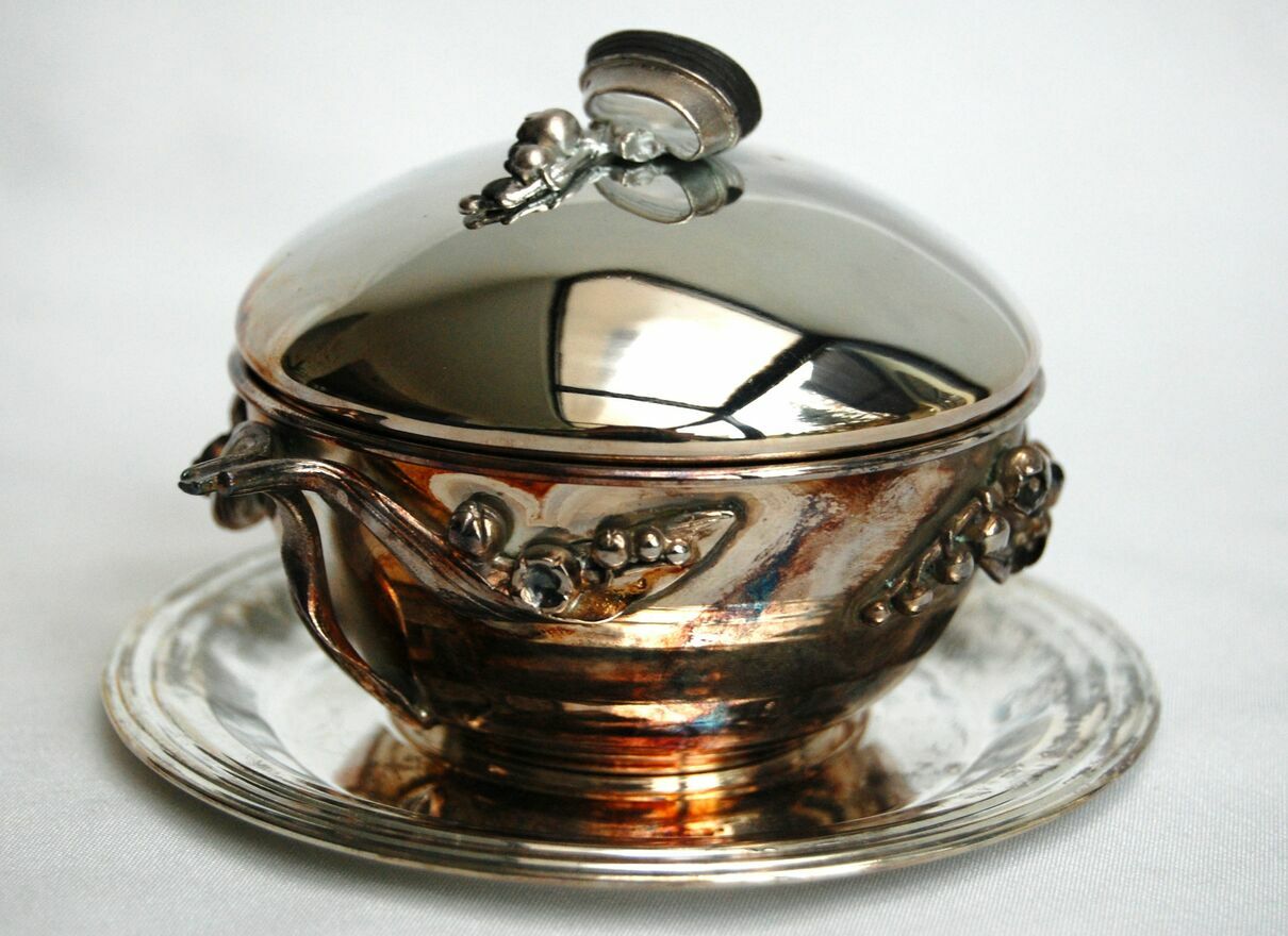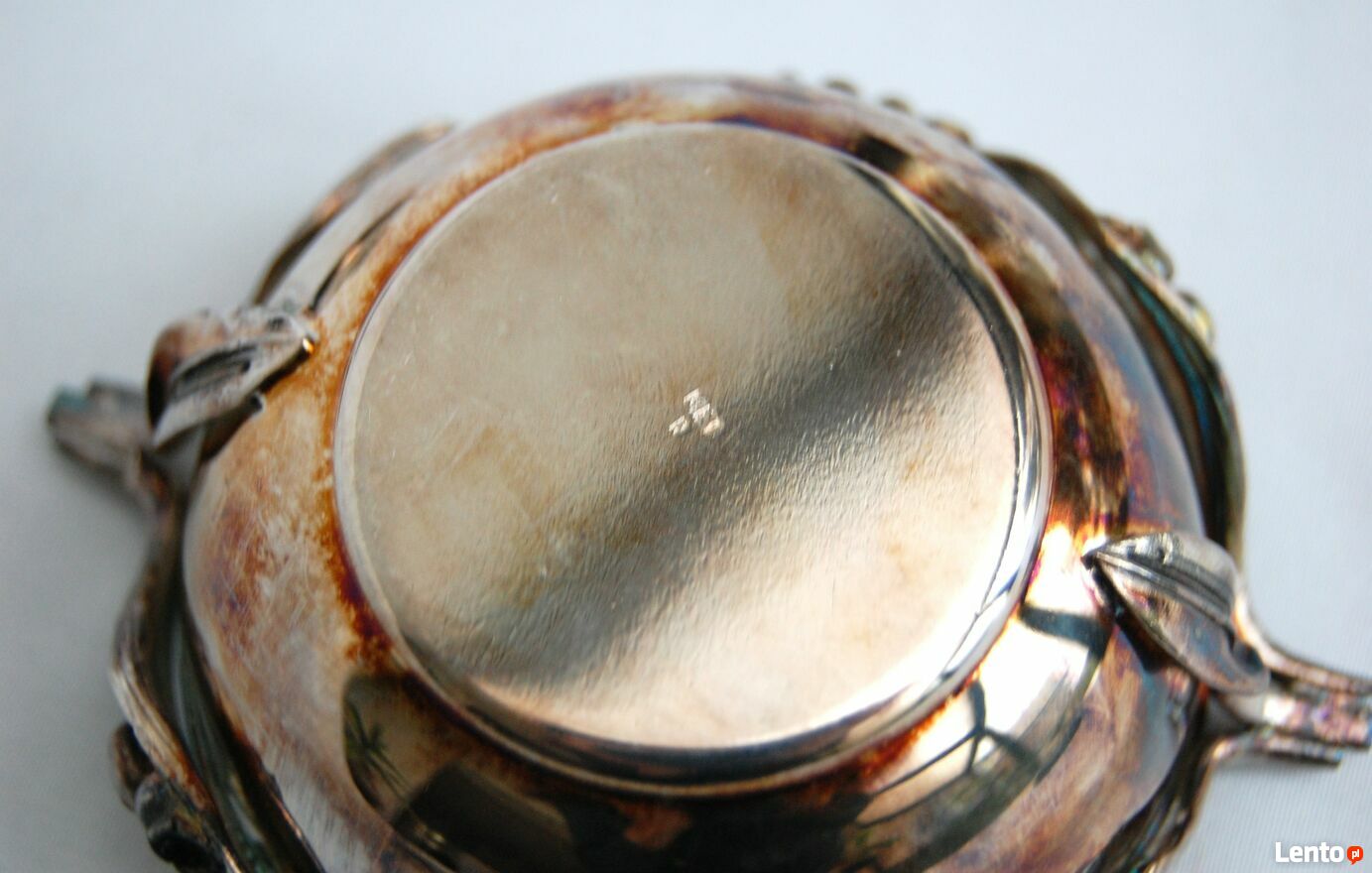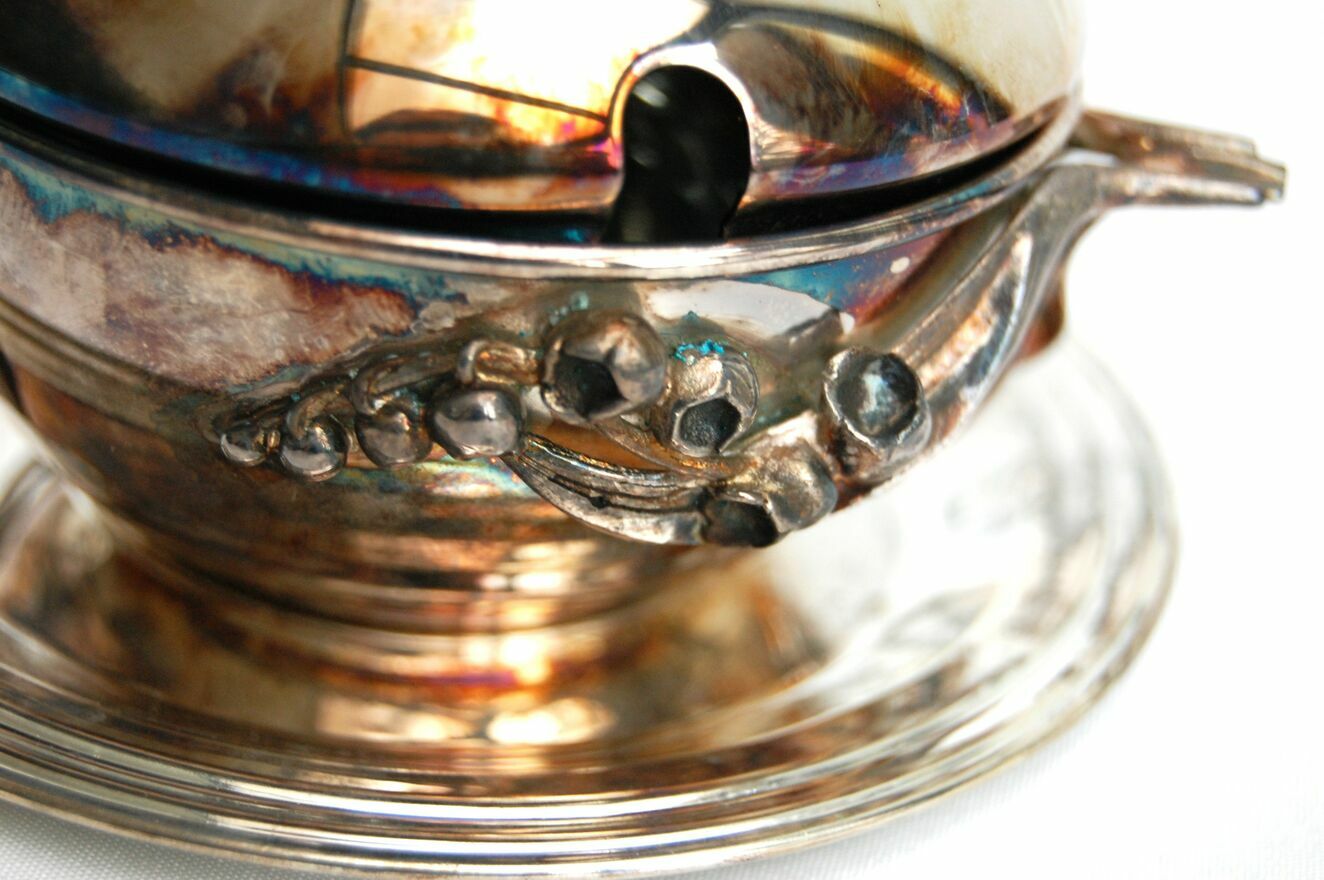 Piękna, platerowana srebrem cukiernica z motywem konwalii - Resovia, z okresu PRL. Wzornictwo jest inspirowane stylem secesyjnym. Srebrzona powierzchnia jest pokryta naturalną, wielobarwną patyną, którą można odczyścić płynem do pielęgnacji srebra (polecam Starwax). Cukiernica jest nowa, nie była czyszczona, jedynie starannie przechowywana. Jest w idealnym stanie: bez zarysowań i uszkodzeń.Wymiary: