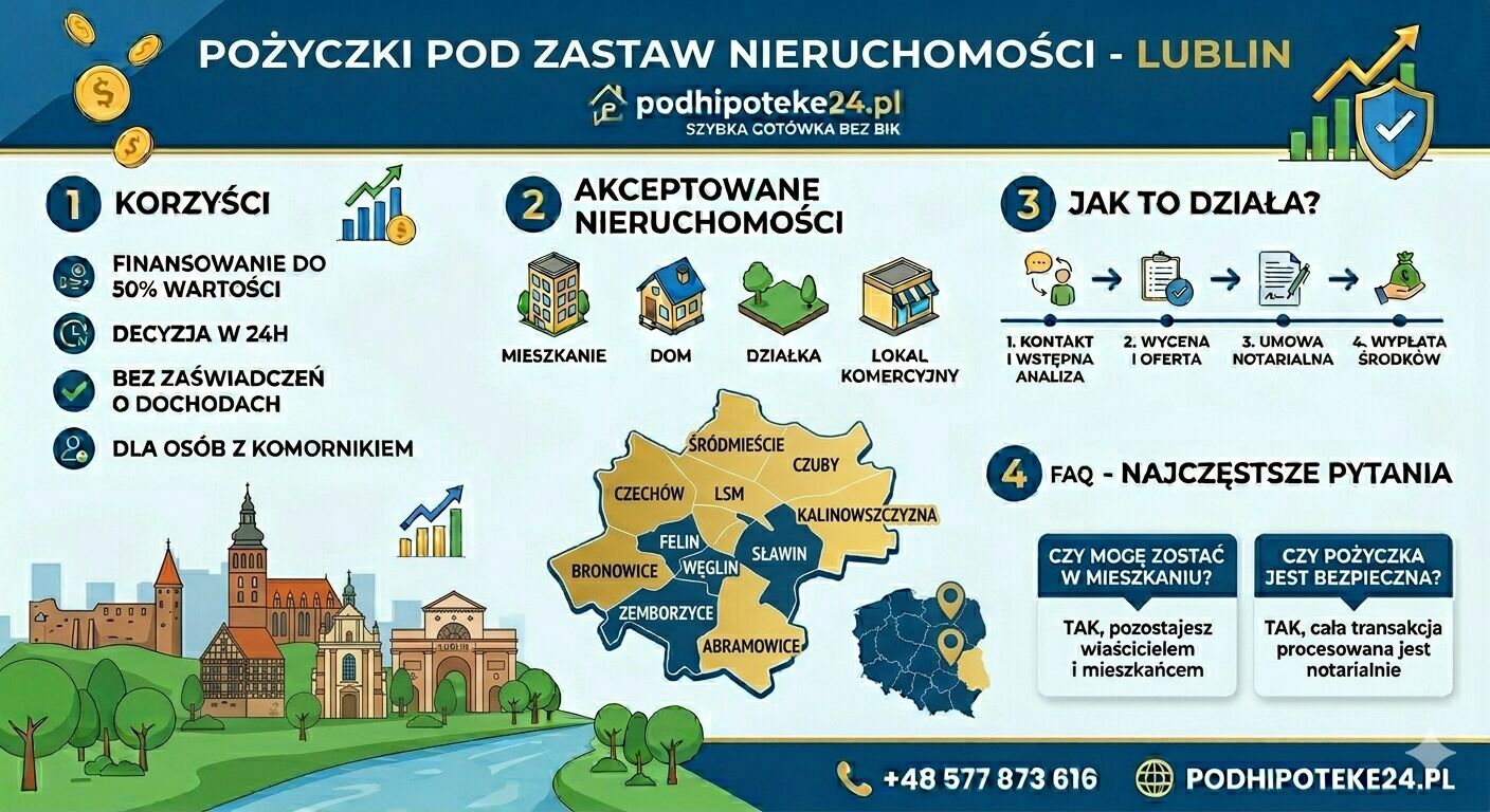 Szukasz bezpiecznego i szybkiego finansowania w Lublinie, ale bank odmówił Ci kredytu? Podhipoteke24.pl oferuje pozabankowe pożyczki pod zastaw nieruchomości, które są idealnym rozwiązaniem dla osób z negatywną historią kredytową lub zajęciami komorniczymi. Pomagamy mieszkańcom Lublina uzyskać kapitał na dowolny cel – od spłaty zadłużeń, przez ratowanie płynności finansowej firmy, aż po finansowanie ważnych inwestycji życiowych.Wyróżnia nas maksymalne uproszczenie procedur. Nie wymagamy zaświadczeń o dochodach z ZUS czy US. Najważniejszym zabezpieczeniem jest Twoja nieruchomość położona w Lublinie lub okolicach. Może to być mieszkanie, dom, działka budowlana lub lokal komercyjny.