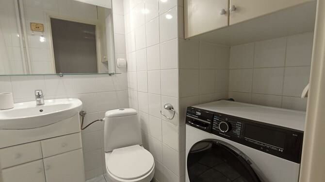 Łazienka z WC: wanna, umywalka, WC kompakt, pralka, szafki.