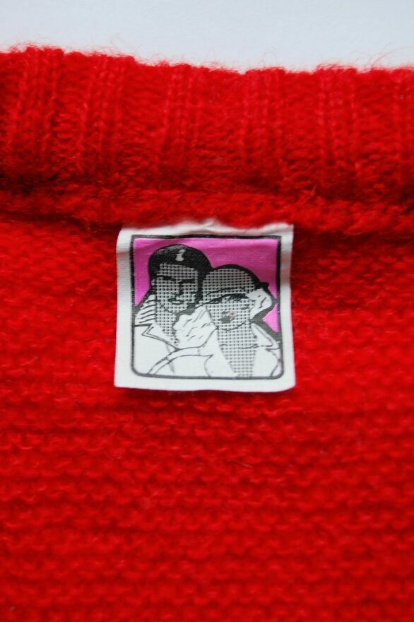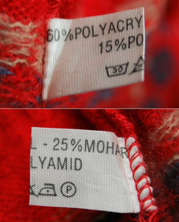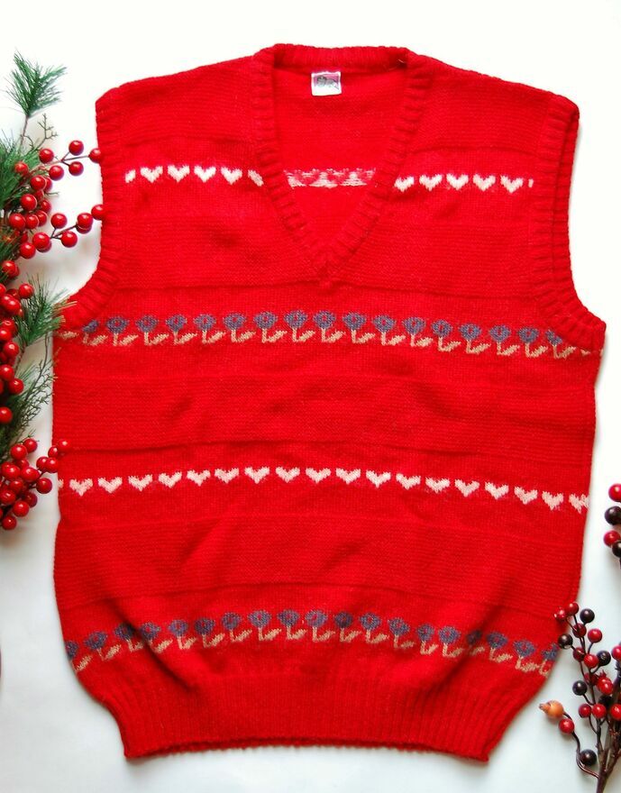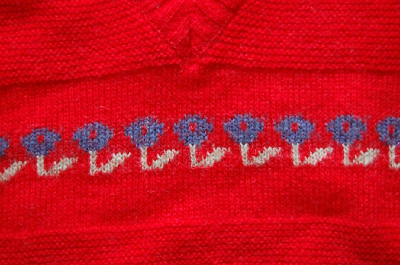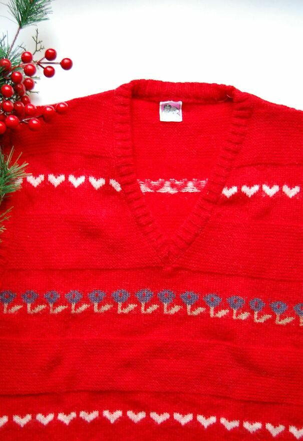 Piękny pulower damski w skandynawskim stylu - oryginalny vintage, nowy. Rozmiar S/M, krój swobodny. Kolor czerwony (na zdjęciach jest nieco przejaskrawiony, dość dobrze oddaje go zdjęcie z metką). Pulower ma dekolt w serek, jest ozdobiony wzorami białych serduszek i niebiesko-beżowych kwiatków oraz pasmami o różnej gęstości splotu. Materiał przyjemny w dotyku, średniej grubości, delikatny. Skład: 60% poliakryl, 25% moher, 15% poliamid. Stan: nowy.Wymiary mierzone na płasko: