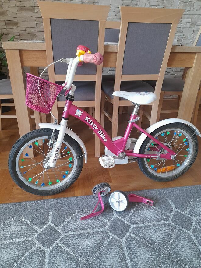 Rowerek Hello Kitty w dobrym stanie technicznym. Koła 16 cali. Hamulec w pedałach. W zestawie boczne kółeczka, dzwonek i koszyczek. Tylko odbiór osobisty.Tomek