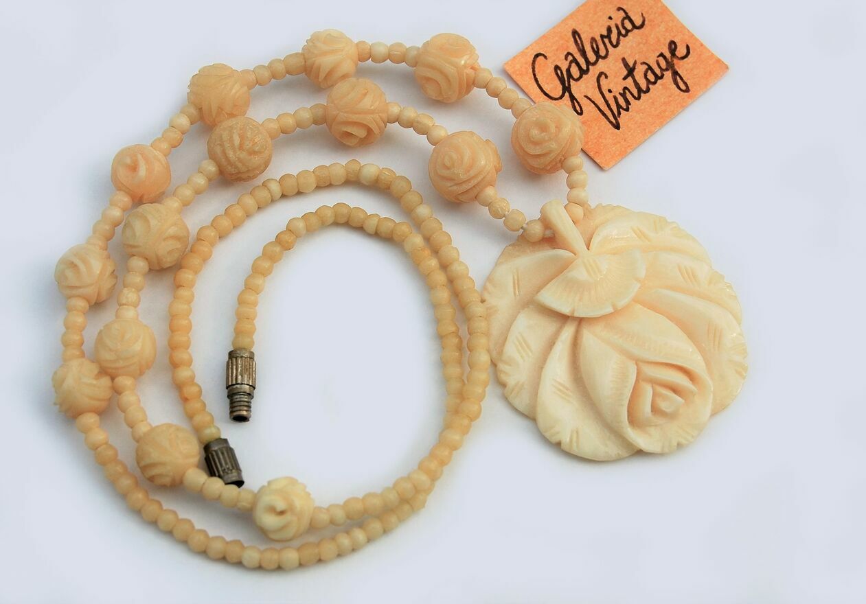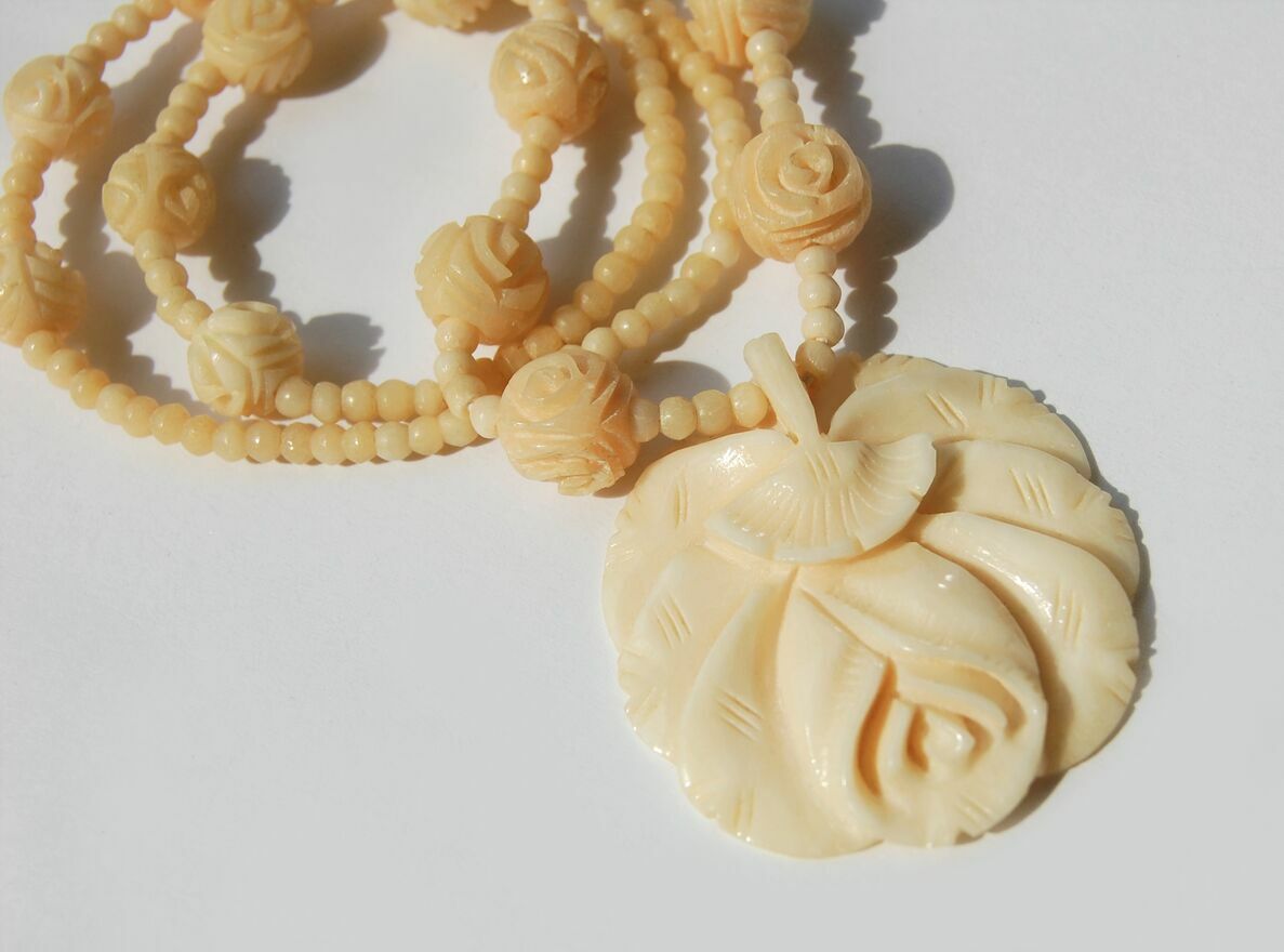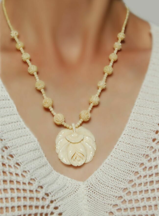 Róża rzeźbiony naszyjnik z kości, kość, vintage