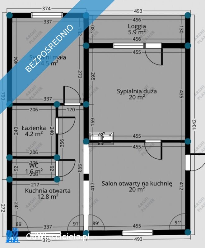 - duża kuchnia 12.5 m2 z oknem otwarta na salon - 20 m2