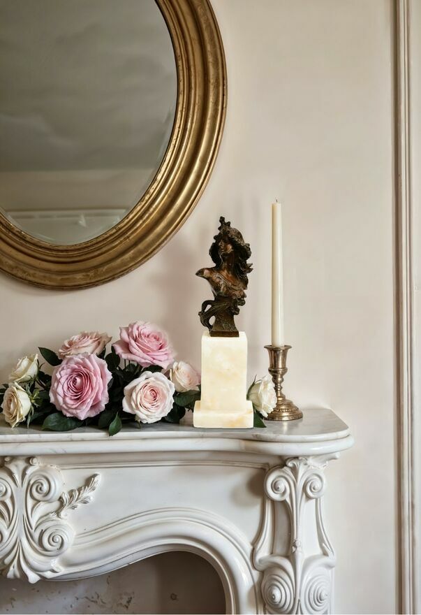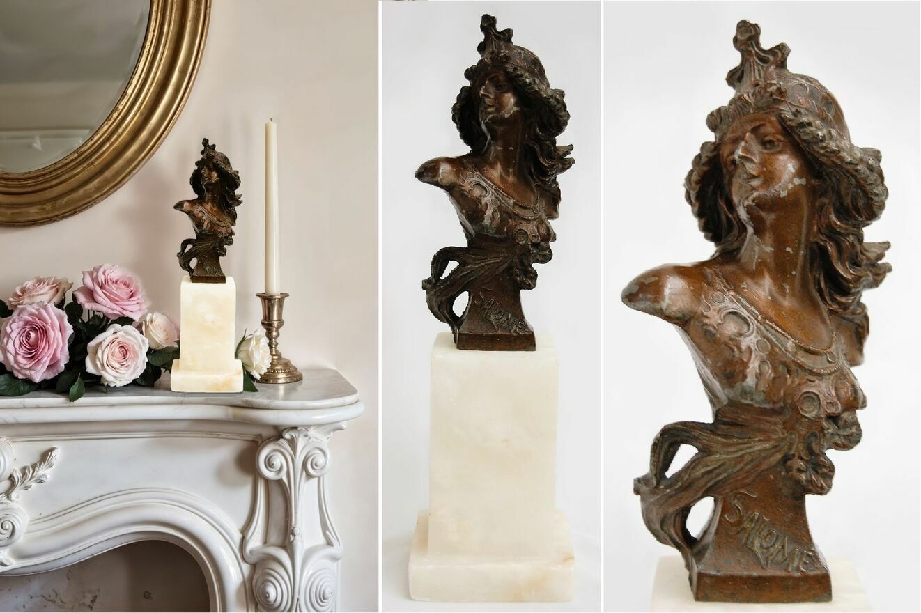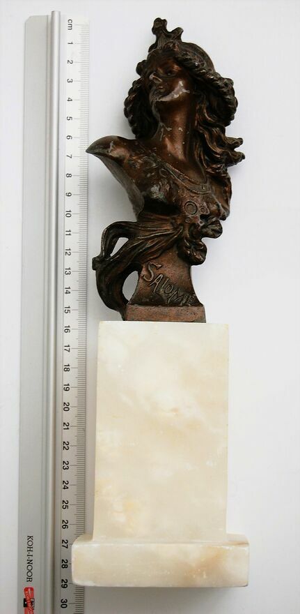 Stara, piękna rzeźba przedstawiająca popiersie Salome. Sygnowana, Paryż, Francja, II połowa XX w., lata 60 - 80. Popiersie Salome jest oddane ze wszystkimi szczegółami, zachwyca misterną fryzurą, ozdobami, pozą ujmującą postać jakby była w ruchu, co jest podkreślone powiewem szaty i włosów. Rzeźba jest wykonana z metalu, stylizowanego na brąz - powierzchnia jest pokryta metaliczną powłoką w kolorze brązu, miejscami są widoczne odpryski i otarcia. Cokół jest wykonany z białego marmuru, miejscami na krawędziach są drobne uszczerbki.Wymiary (wysokość całkowita x szerokość x głębokość): 19 x 20,4 (cm).