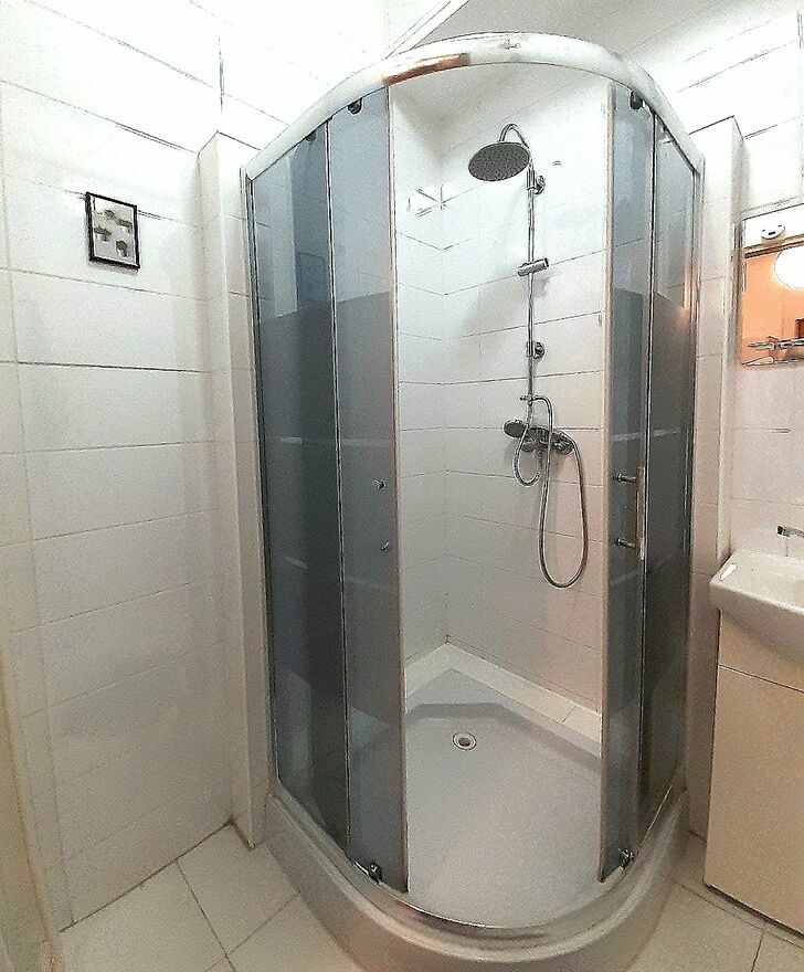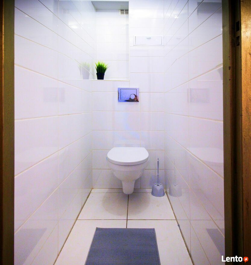 Łazienka i WC są oddzielne. W łazience jest kabina prysznicowa, umywalka z szafką, lustro, wieszaki na ręczniki, regał na kosmetyki.