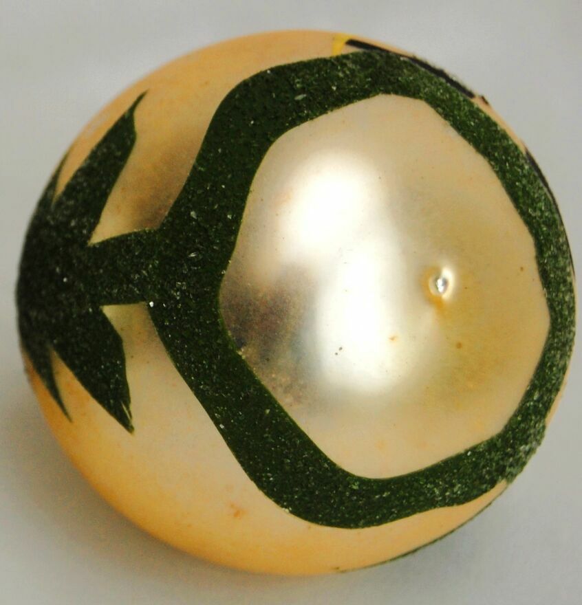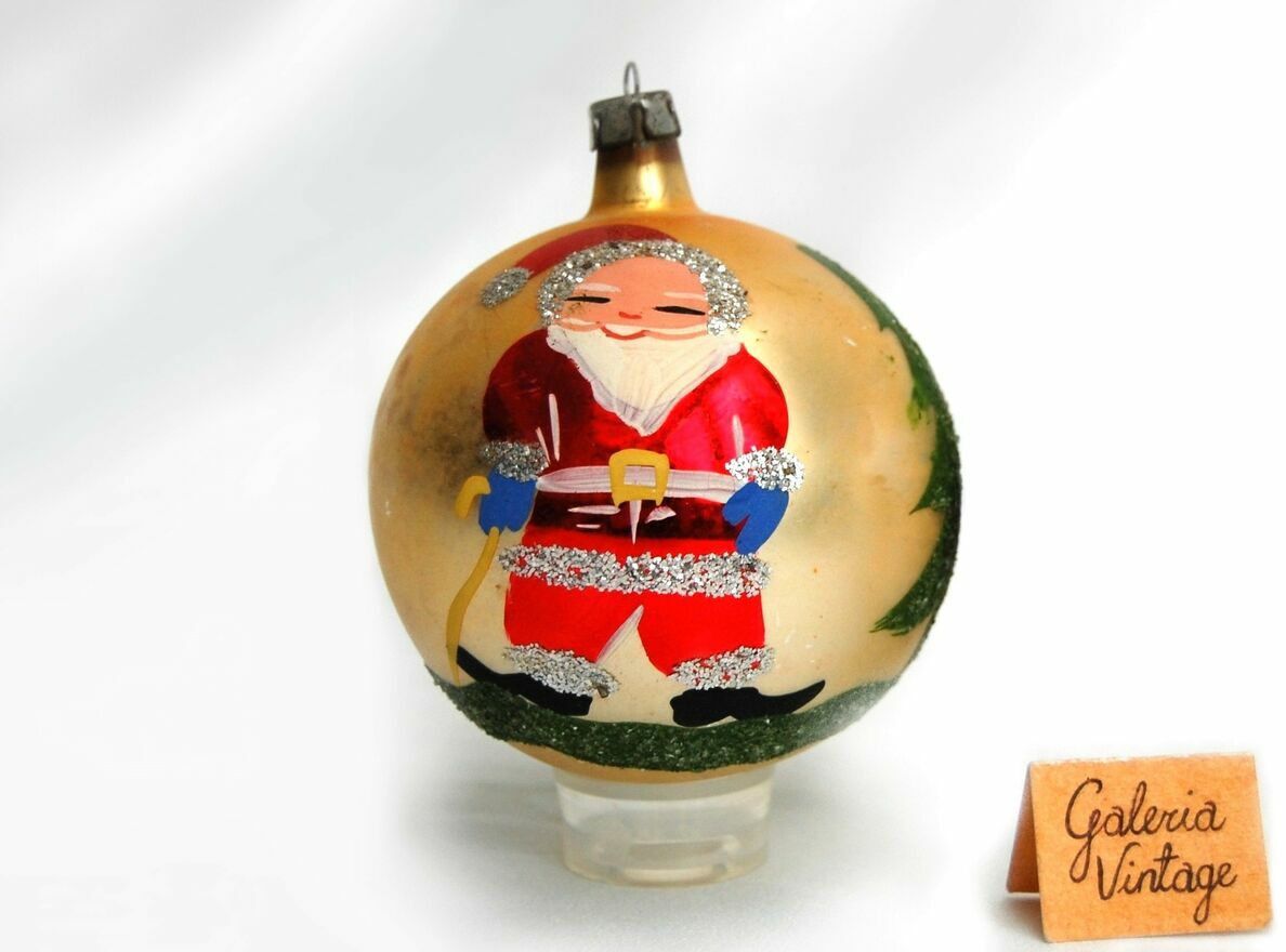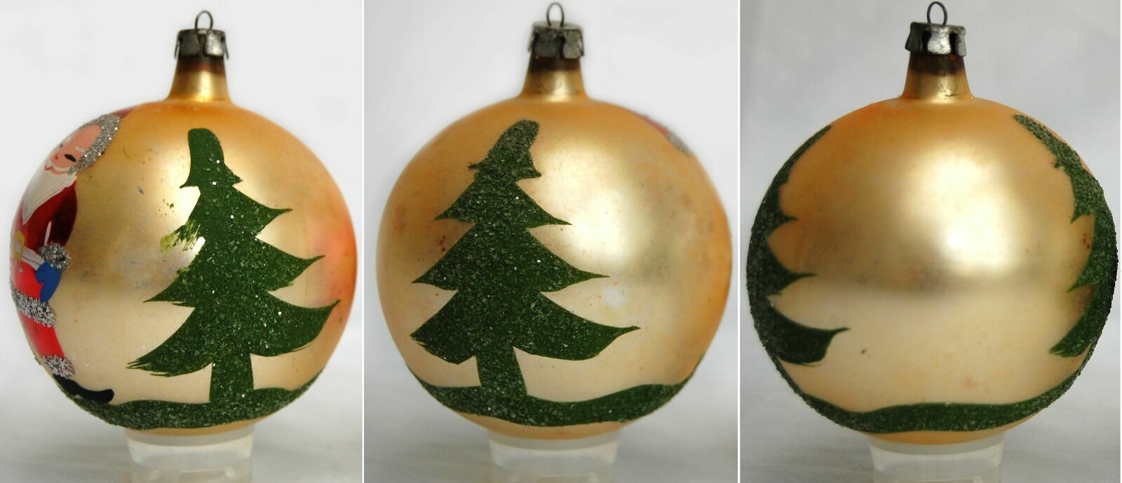 Stara bombka szklana z okresu PRL. Bombka jest ręcznie malowana. Ma kolor złoty, perłowy z czerwonym Mikołajem i zielonymi choinkami ze szklanym brokatem. Stan zachowania bardzo dobry, miejscami są małe przebarwienia - plamki i otarcia - widoczne na zdjęciach. Dostępna jest jedna bombka.Średnica: 8 cm.