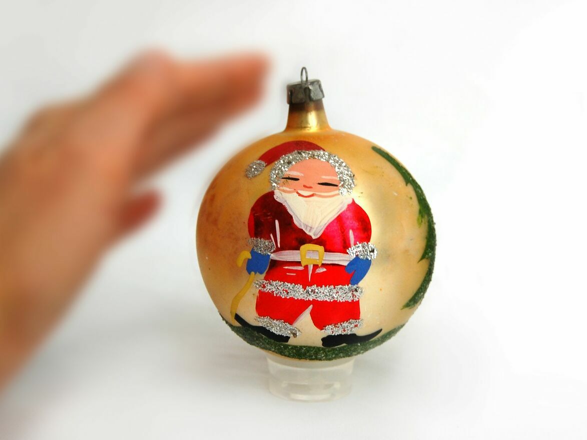 Stara bombka szklana ręcznie malowana 8 cm Mikołaj PRL
