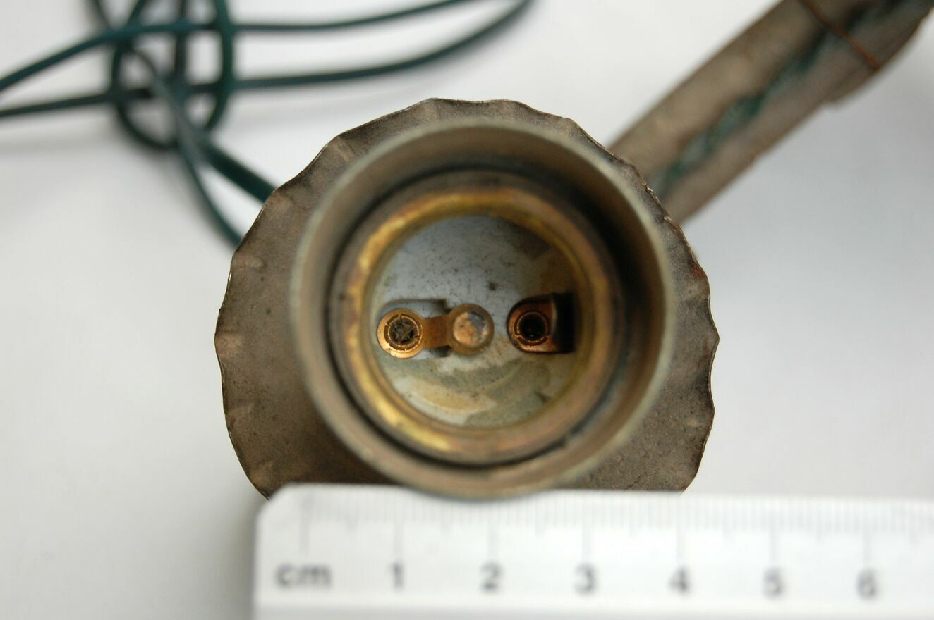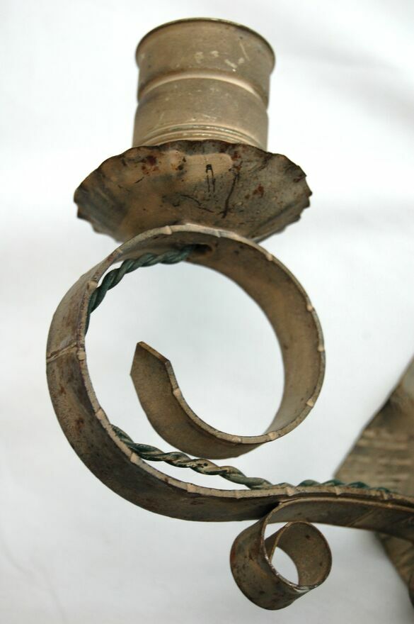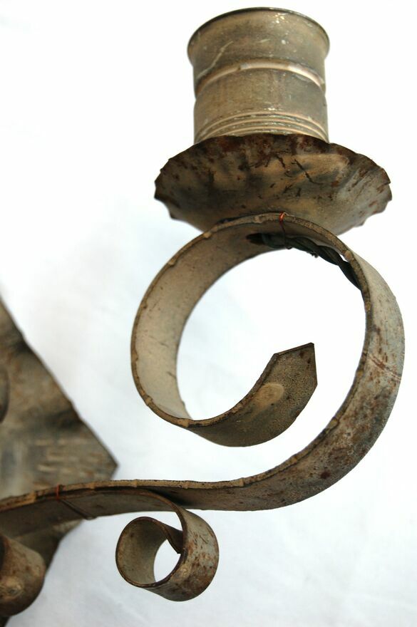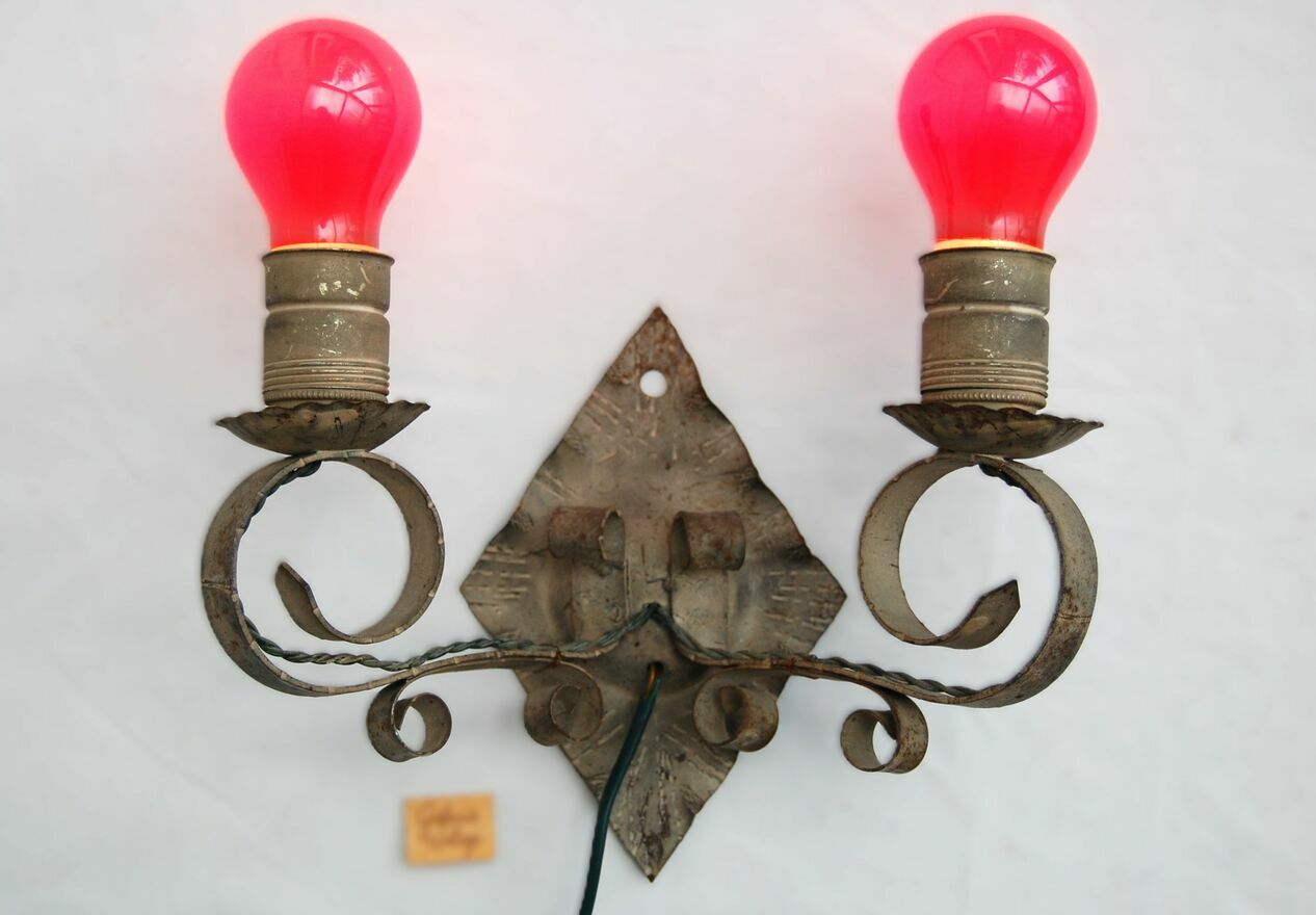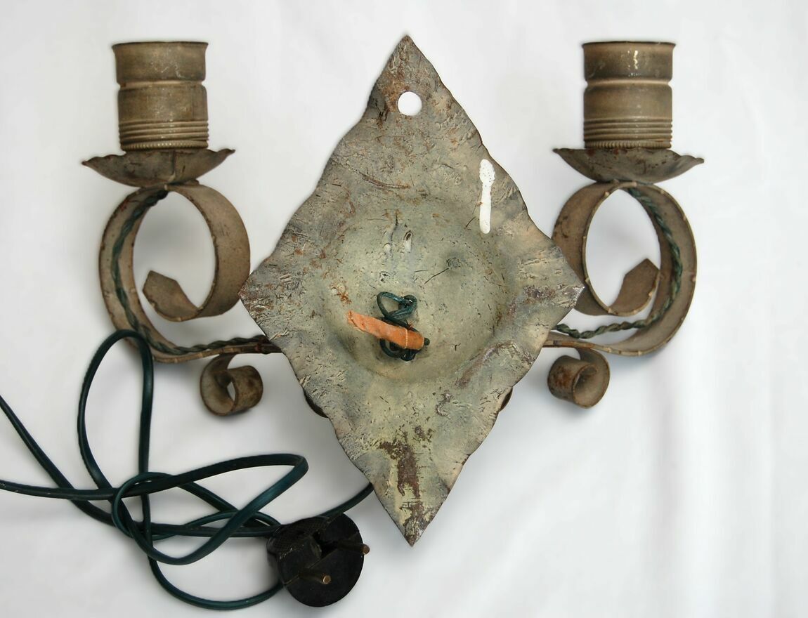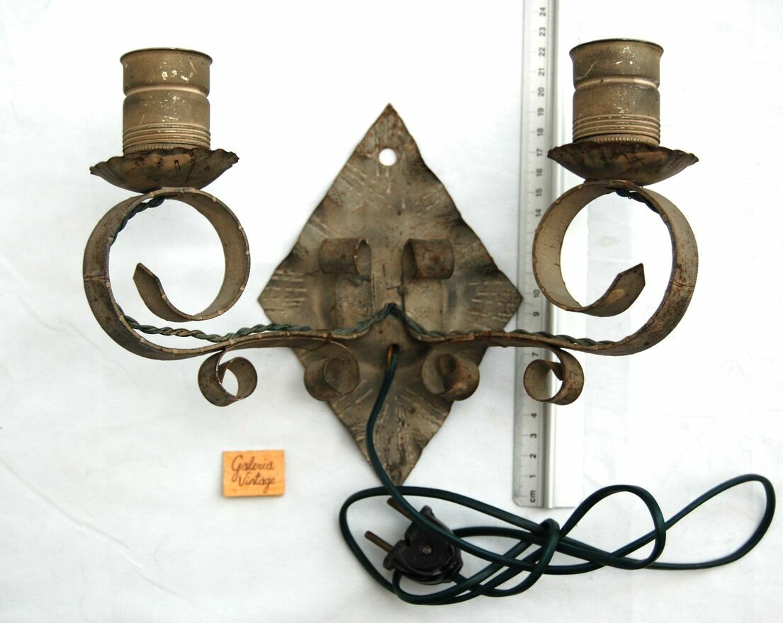 Stary, dwuramienny, kuty kinkiet metalowy. Gdy sąsiedzi prześcigają się w efektach specjalnych LED, przyprawiających o atak padaczki w okresie świątecznym, Ty oświetl swą fortecę Gargamela tym oto kinkietem, niczym ze średniowiecznego zamczyska, czy zbójnickiej chaty. :)Kinkiet ma wszystkie elementy oryginalne, niewymieniane, nienaprawiane. Metal ma kolor szary z drobnymi plamkami rdzy, zarysowaniami. Wtyczka jest częściowo ułamana. Światło włącza się poprzez włożenie wtyczki do kontaktu (kabel nie ma przełącznika). Do kinkietu pasują dwie żarówki o średnicy gwintu 4 cm. Żarówki widoczne na zdjęciu nie są częścią oferty.