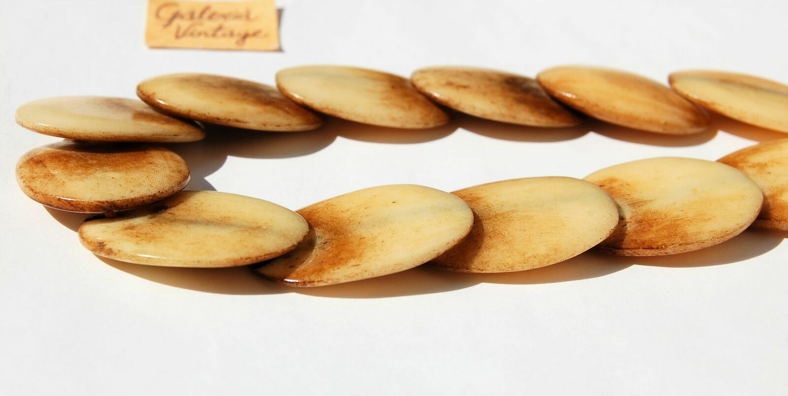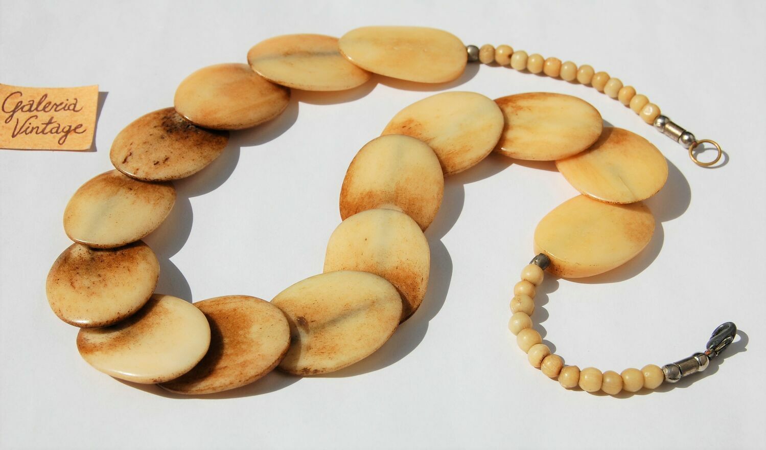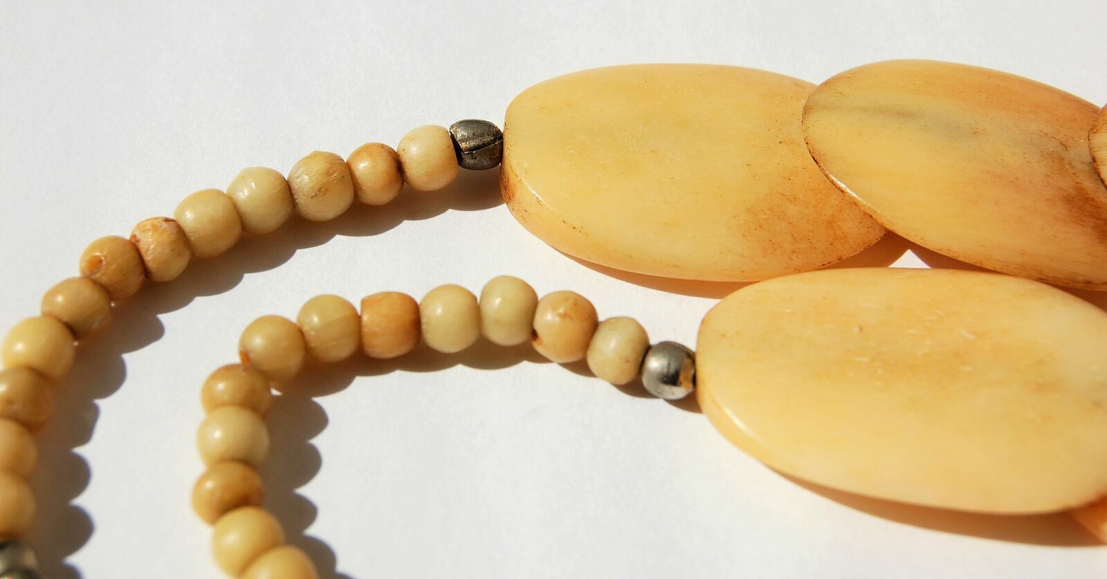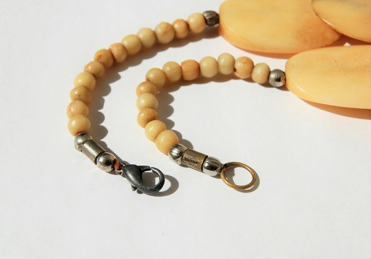 Unikatowy, stary naszyjnik z naturalnej kości bawołu. Korale są ręcznie wykonane, płaskie, polerowane. Kolor kremowy z żółtawym i brązowym odcieniem. Zapięcie i metalowe koraliki oddzielające segmenty są metalowe, miejscami zmatowiałe, pociemniałe. Elementy są nawleczone na nić. Stan zachowania dobry.Długość: 53,8 cm.