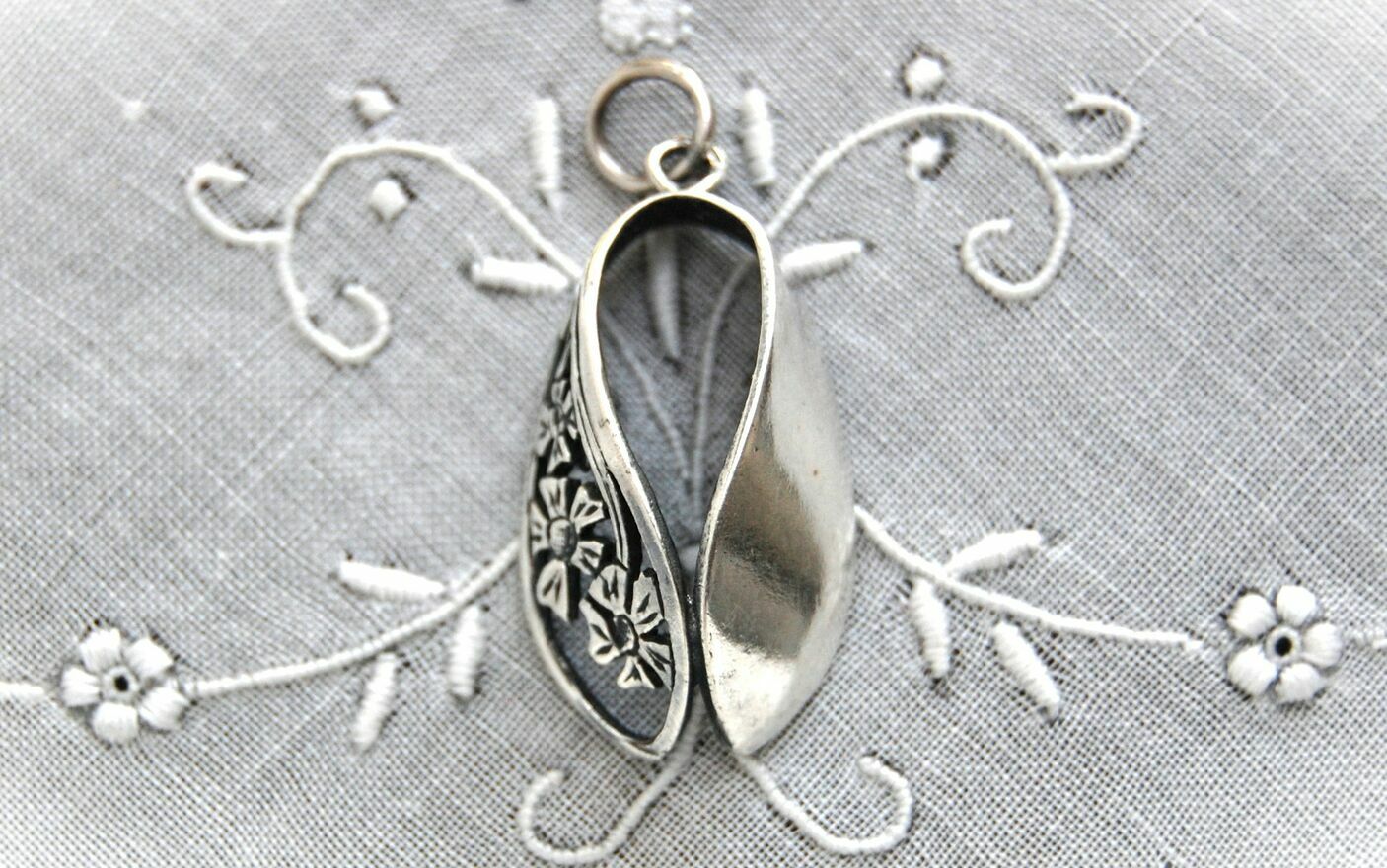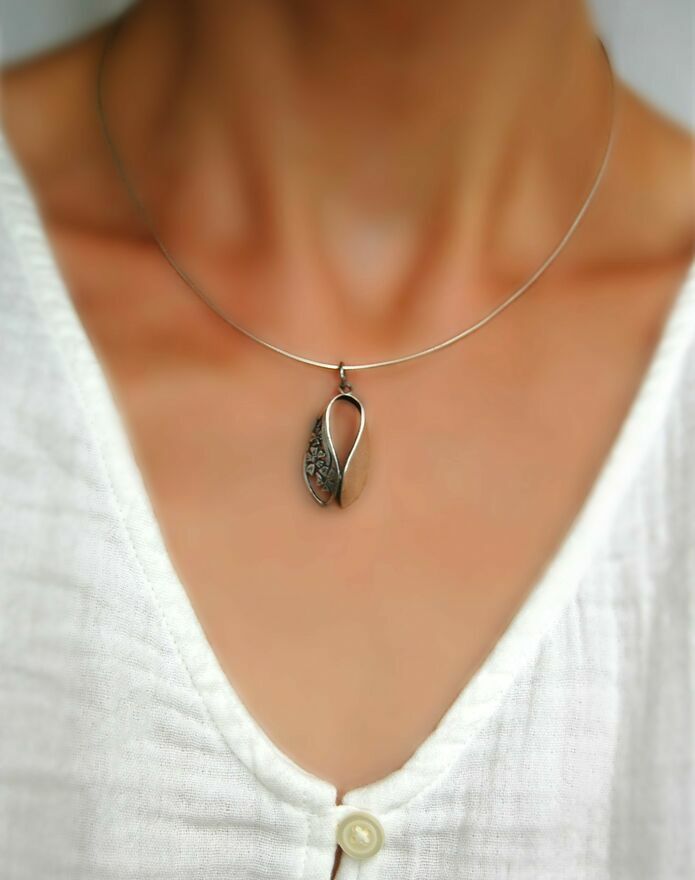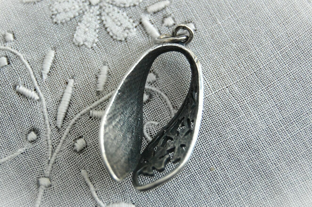 Subtelny wisiorek damski w kształcie łezki z ażurowym motywem kwiatów, nawiązujący do stylu secesyjnego. Wisiorek pochodzi z okresu PRL, jest to wyrób polski, nieoznaczony puncami, sygnaturami. Wisiorek pokrywa się ciemną patyną typową dla srebra i nie przyciąga go magnes - najprawdopodobniej jest to srebro. Stan zachowania bardzo dobry, bez uszkodzeń.Wymiary:
