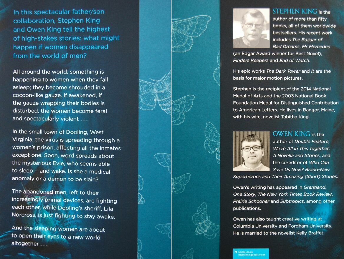 Stephen & Owen King "Sleeping Beauties" - książka w j. angielskim. Wydawnictwo Hodder And Stoughton, Londyn, 2017 r. Pierwsze wydanie w twardej okładce z obwolutą. Liczba stron: 718. Stan: nowa.Wymiary (wysokość x szerokość x głębokość): 24 x 16 x 6,5 (cm).