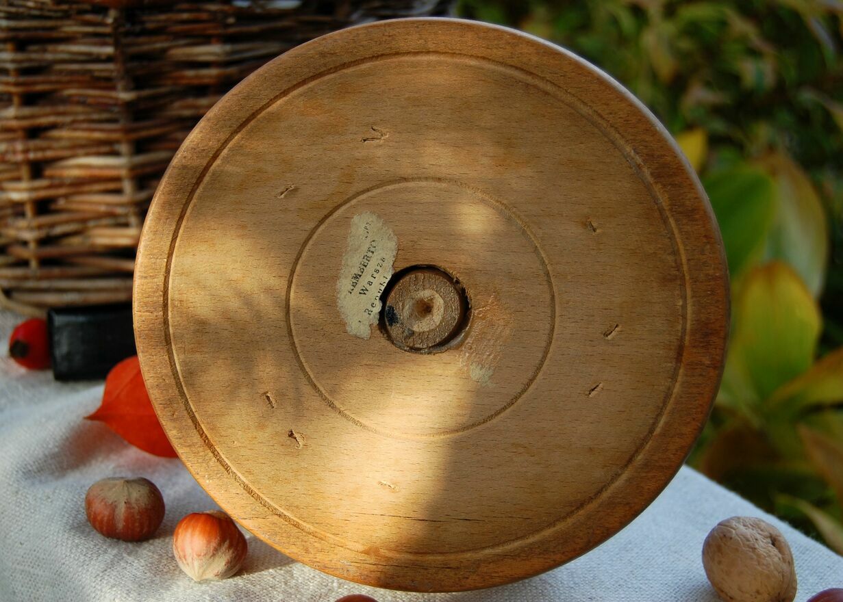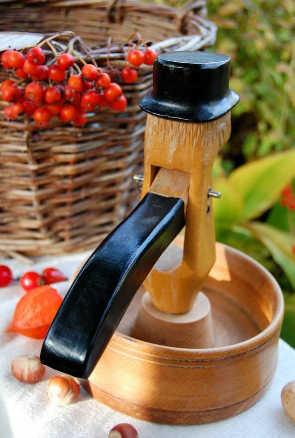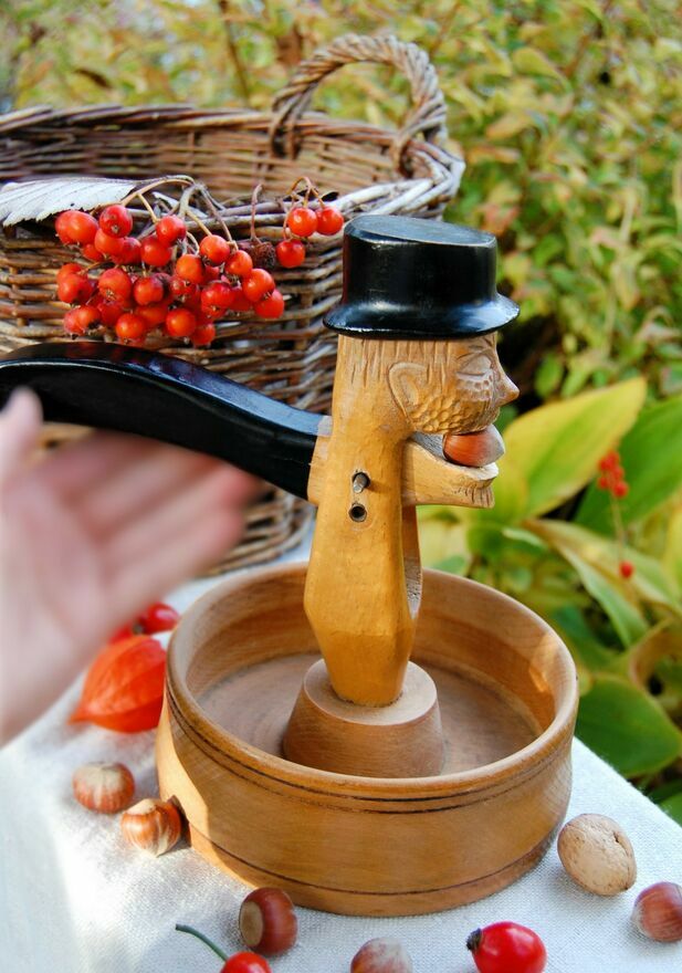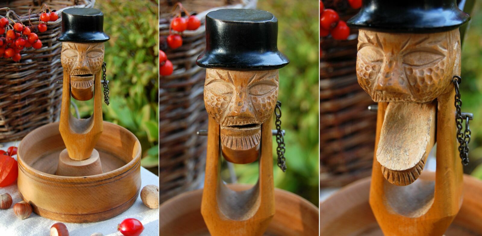 Stary, drewniany dziadek do orzechów z okresu PRL. Rękodzielniczy, unikatowy wyrób polski z częściowo czytelną, papierową etykietą od spodu: "Rembertów. Warszawa. Republika". Dziadek jest ręcznie wyrzeźbiony w jasnym drewnie, polakierowany. Kapelusz i uchwyt dźwigni są pomalowane czarną, błyszczącą farbą. Szerokie rozwarcie szczęki pozwala łupać orzechy różnych rozmiarów - włoskie i laskowe. Dźwignię można zamontować na dwóch poziomach za pomocą metalowego bolca na łańcuszku przechodzącego przez otwory. Mocny nacisk dźwignią, stabliność i duży pojemnik na łupiny zapewniają wygodę użytkowania. Miejscami widać otarcia lakieru, a szczęka starca jest wytarta i chropowata, gdyż niejeden twardy orzech zgryzł w swym długim życiu. Dziadek, choć bezzębny, nadal łupie orzechy fest, a jego sroga mina sprawia, że same przed nim pękają. :)Wymiary: