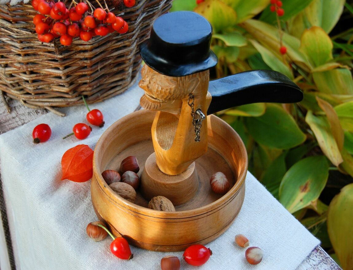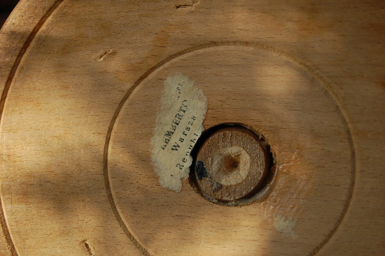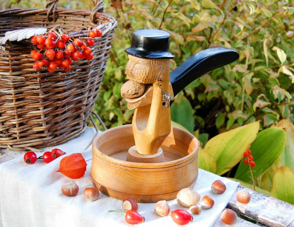 Stary, drewniany dziadek do orzechów z okresu PRL. Rękodzielniczy, unikatowy wyrób polski z częściowo czytelną, papierową etykietą od spodu: "Rembertów. Warszawa. Republika". Dziadek jest ręcznie wyrzeźbiony w jasnym drewnie, polakierowany. Kapelusz i uchwyt dźwigni są pomalowane czarną, błyszczącą farbą. Szerokie rozwarcie szczęki pozwala łupać orzechy różnych rozmiarów - włoskie i laskowe. Dźwignię można zamontować na dwóch poziomach za pomocą metalowego bolca na łańcuszku przechodzącego przez otwory. Mocny nacisk dźwignią, stabliność i duży pojemnik na łupiny zapewniają wygodę użytkowania. Miejscami widać otarcia lakieru, a szczęka starca jest wytarta i chropowata, gdyż niejeden twardy orzech zgryzł w swym długim życiu. Dziadek, choć bezzębny, nadal łupie orzechy fest, a jego sroga mina sprawia, że same przed nim pękają. :)Wymiary: