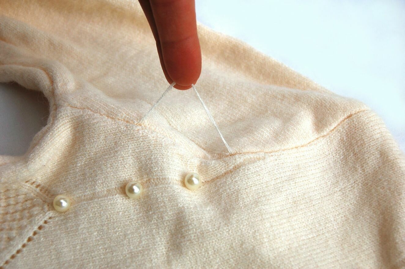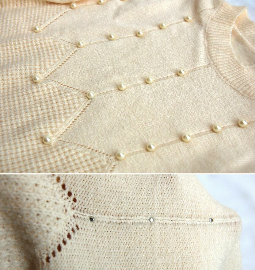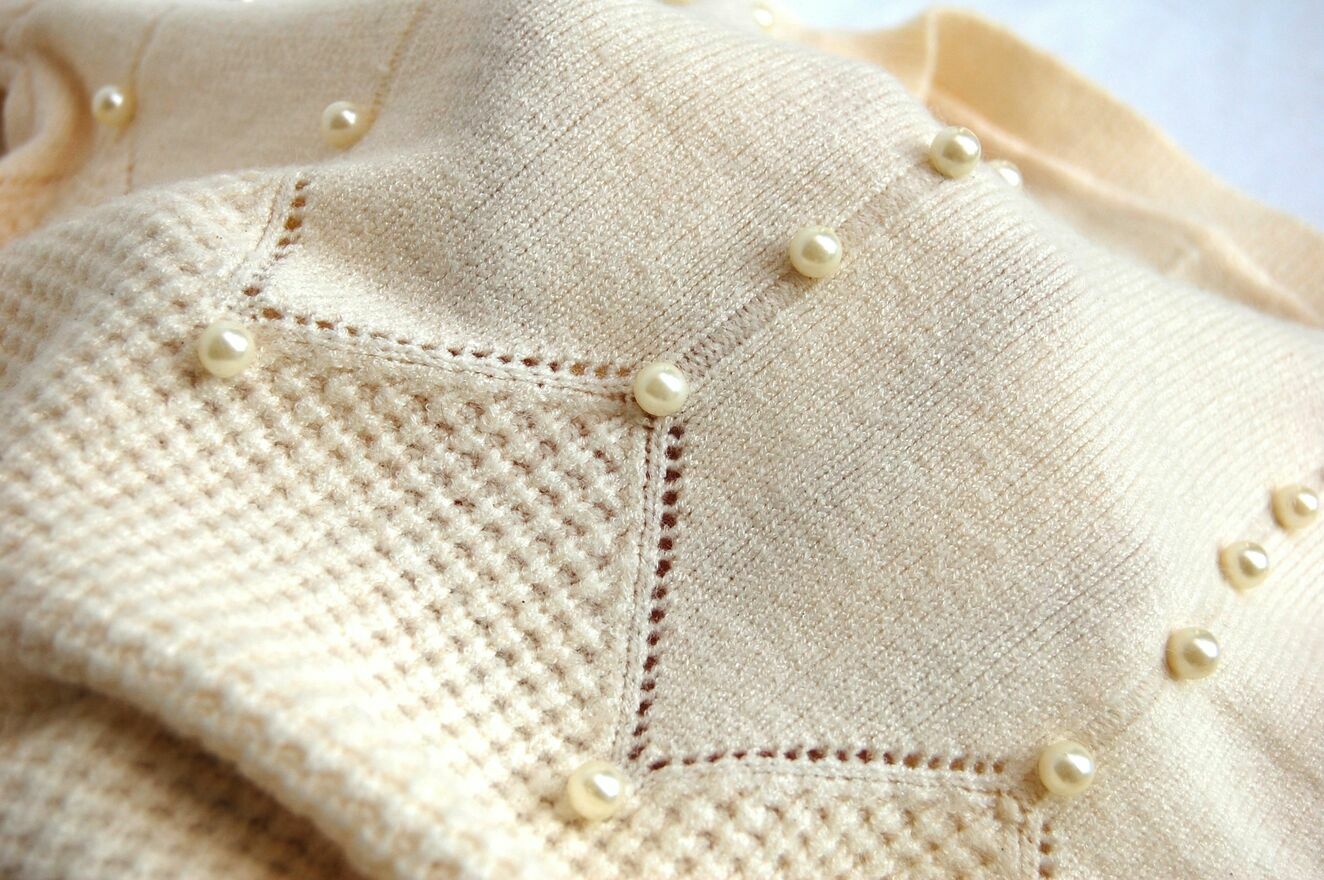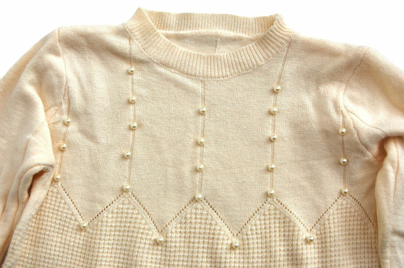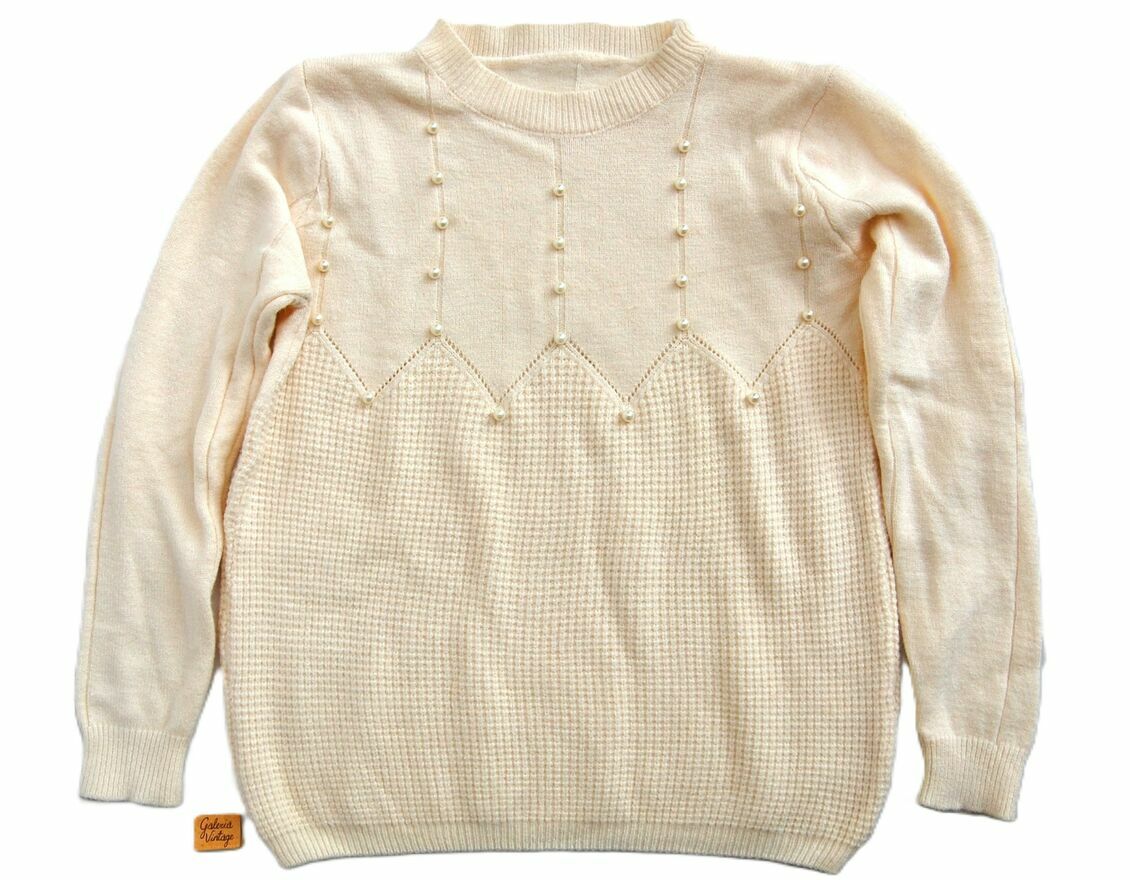 Piękny sweter damski w kolorze kremowej bieli/ecru. Wymiary odpowiadają rozmiarowi 34 (XS). Brak metek. Materiał delikatny w dotyku, miękki, ciepły, rozciągliwy jak wełna z dodatkiem. Front swetra jest ozdobiony wzorem z perłami umocowanymi na metalowe nity. Stan zachowania bardzo dobry, bez śladów użytkowania, przy szwie prawego rękawa jest zaciągnięta nitka, która się nie pruje - pokazane na zdjęciu ze zbliżeniem.Wymiary mierzone na płasko: