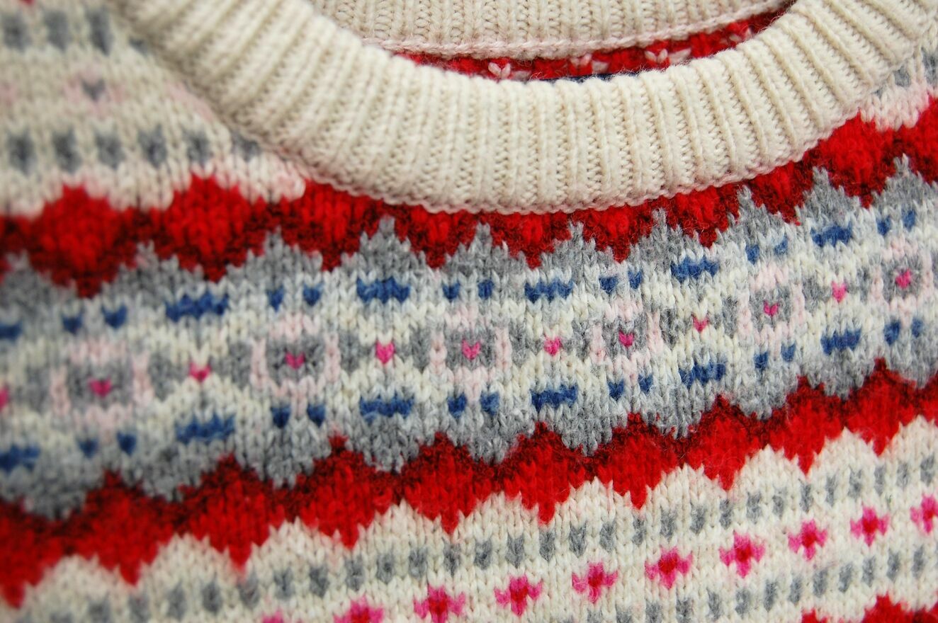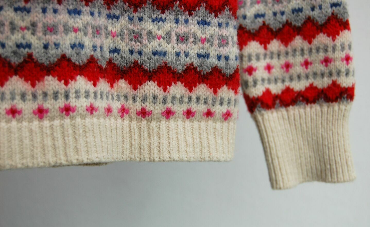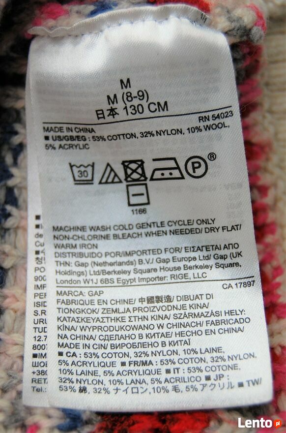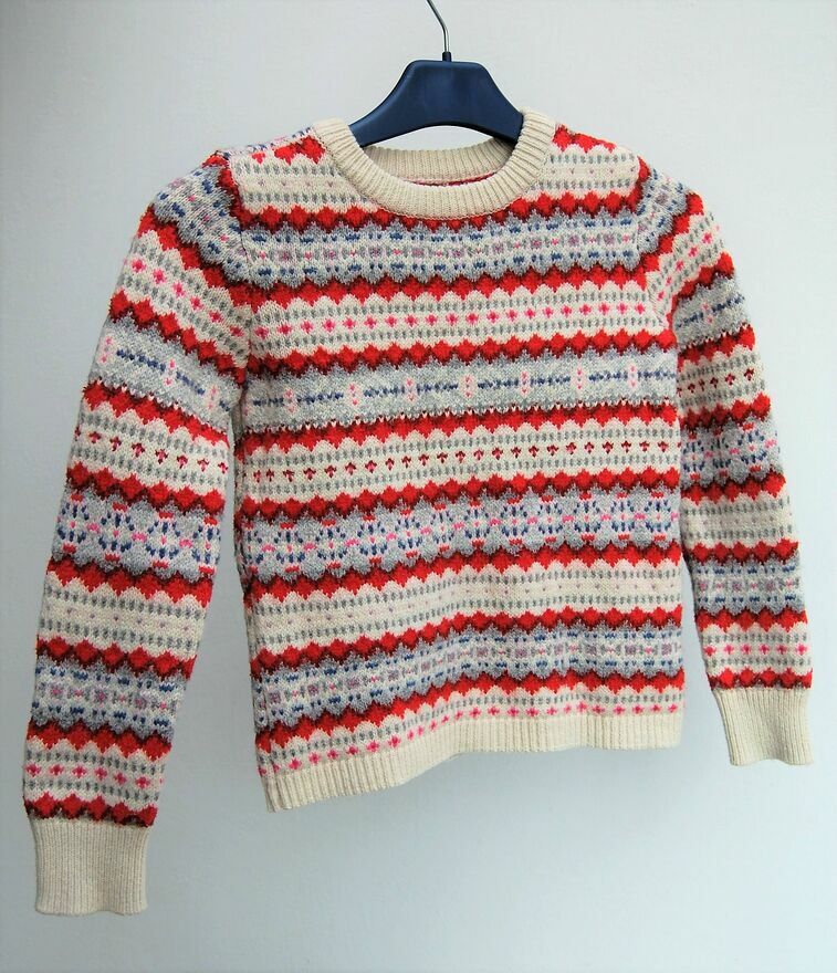 Sweter dla dzieci ze skandynawskim wzorem, Gap Kids. Rozmiar M (8-9 lat), 130 cm wzrostu. Materiał, skład: 53% bawełna, 32% nylon, 10% wełna, 5% akryl. Materiał jest dość gruby, ciepły. Kolory: kremowa biel (organic white - nazwa producenta) i wzory w kolorach czerwonym,bordowym, różowym, szarym, niebieskim. Stan zachowania bardzo dobry, materiał jest minimalnie zmechacony, na froncie jest zaciągnięta szara nić (widoczne na zdjęciach ze zbliżeniem).Wymiary mierzone na płasko bez rozciągania: