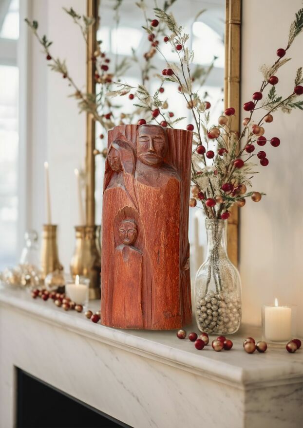 Święta Rodzina - unikatowa rzeźba, rękodzieło z lat 90 XX wieku. To pojedynczy egzemplarz, nie produkcja masowa. Rzeźba została wykonana przez artystę-amatora, który jest osobiście znany ogłoszeniodawcy. Praca nie posiada sygnatury, co jest typowe dla prywatnego rękodzieła z tamtego okresu, jednak jej pochodzenie jest znane.Rzeźba jest wykonana ręcznie, dłutem w drewnianym pniaku. Pomalowana bejcą na kolor wiśniowobrązowy (mahoń). Powierzchnia jest gładka z lekkim połyskiem oraz z widoczną fakturą i śladami ręcznej pracy.