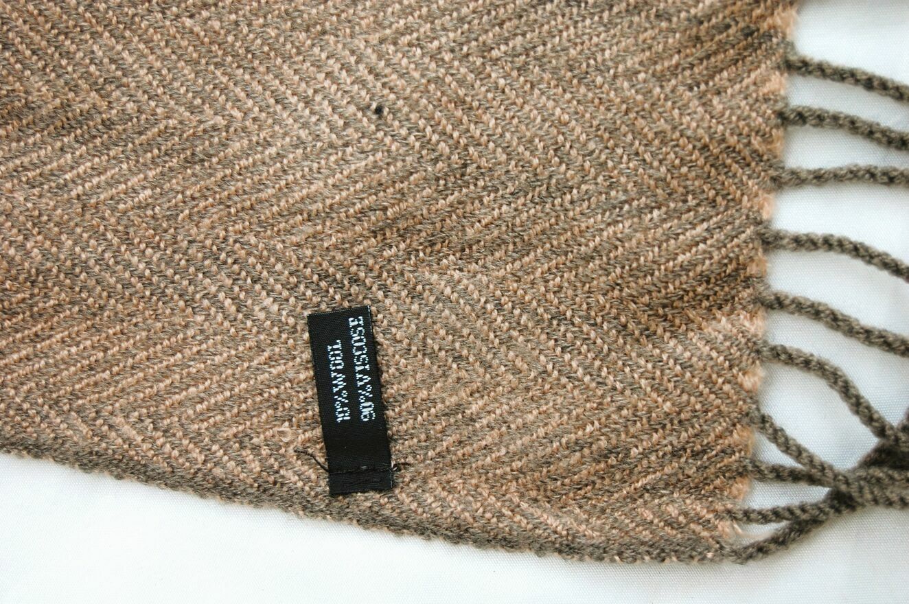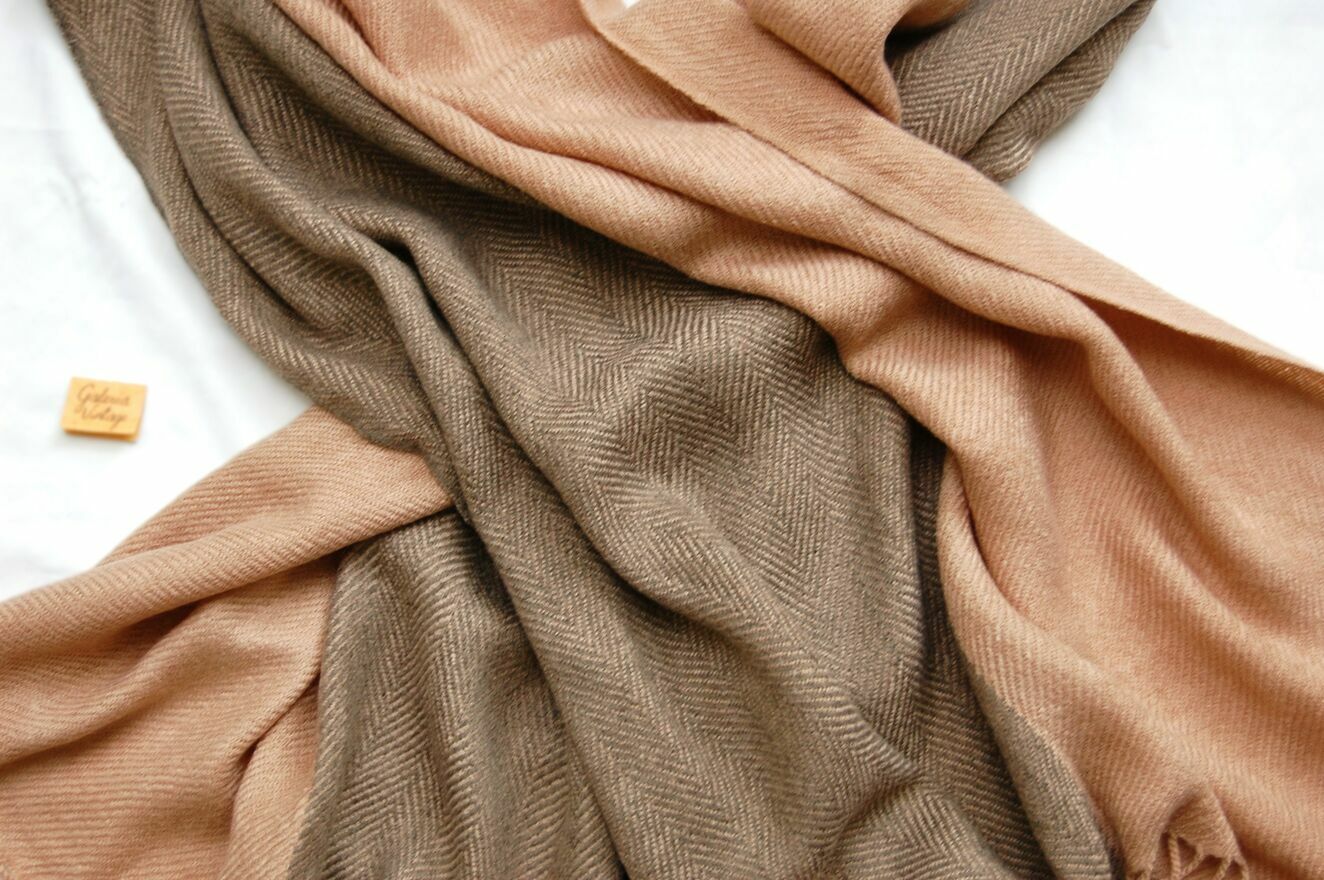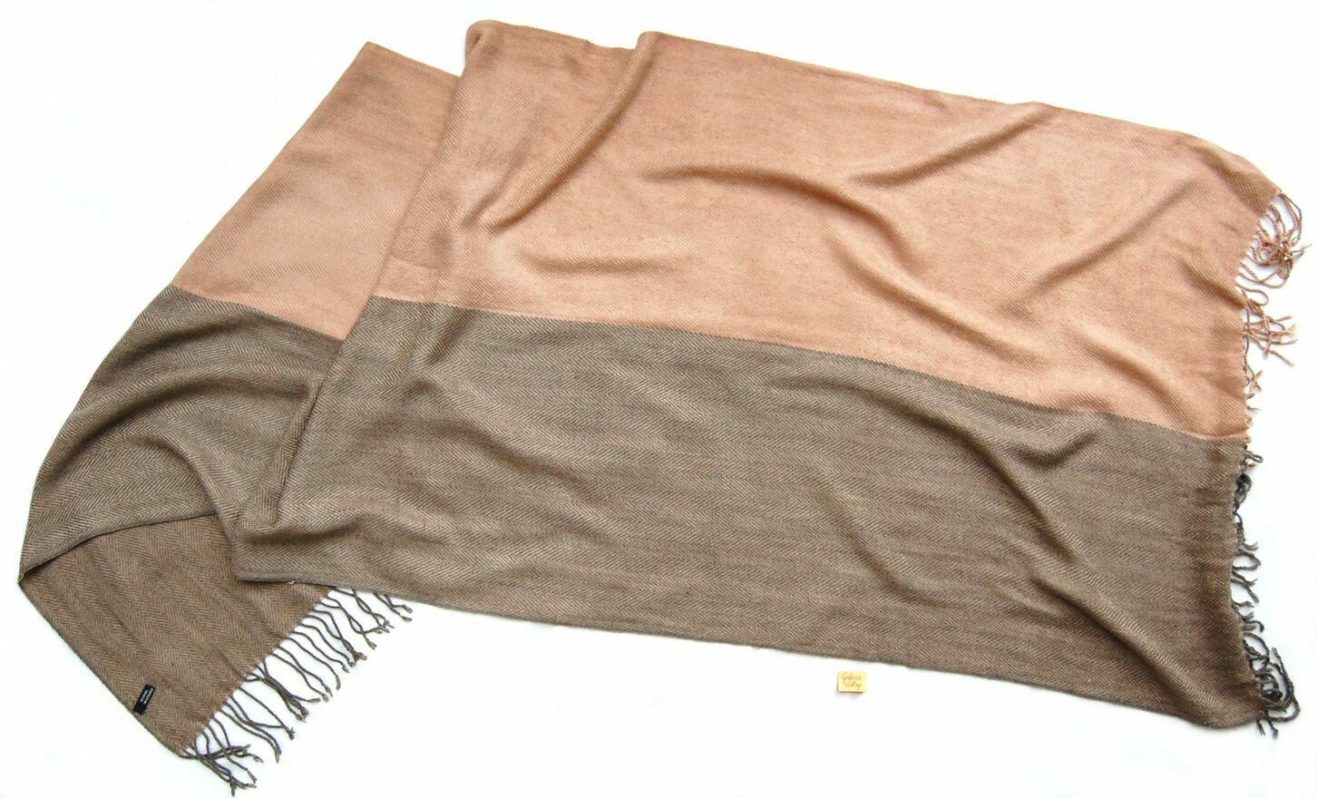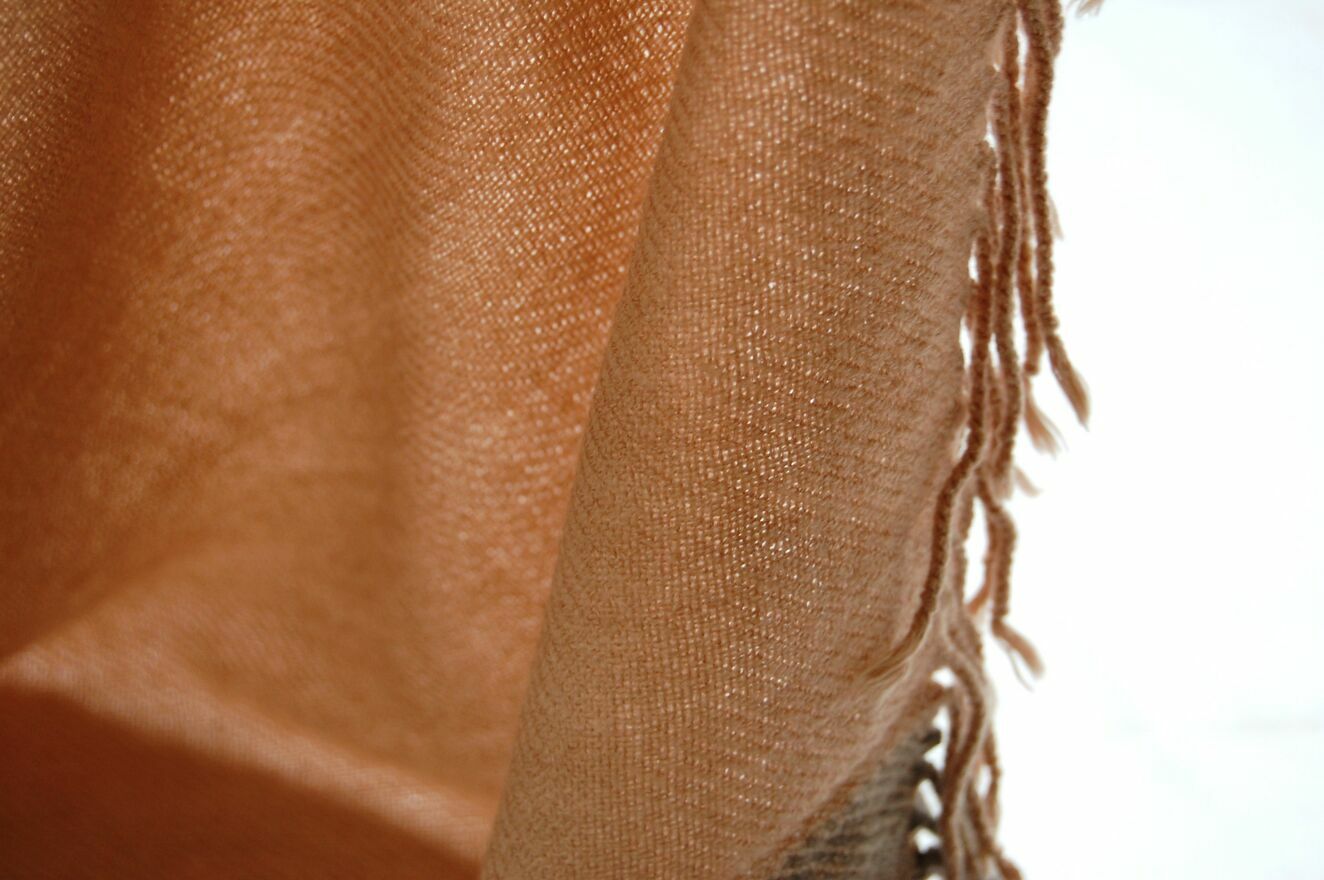 Długi szal damski w dwóch kolorach: płowego brązu i camelowego beżu. Materiał delikatny, miękki, cienki, ciepły. Skład: 90% wiskoza, 10% wełna. Stan zachowania bardzo dobry, w jednym miejscu przy krawędzi jest zaciągnięta nitka (widoczna na zdjęciu ze zbliżeniem).Wymiary (długość nie licząc frędzli x szerokość): 190 x 70 cm.