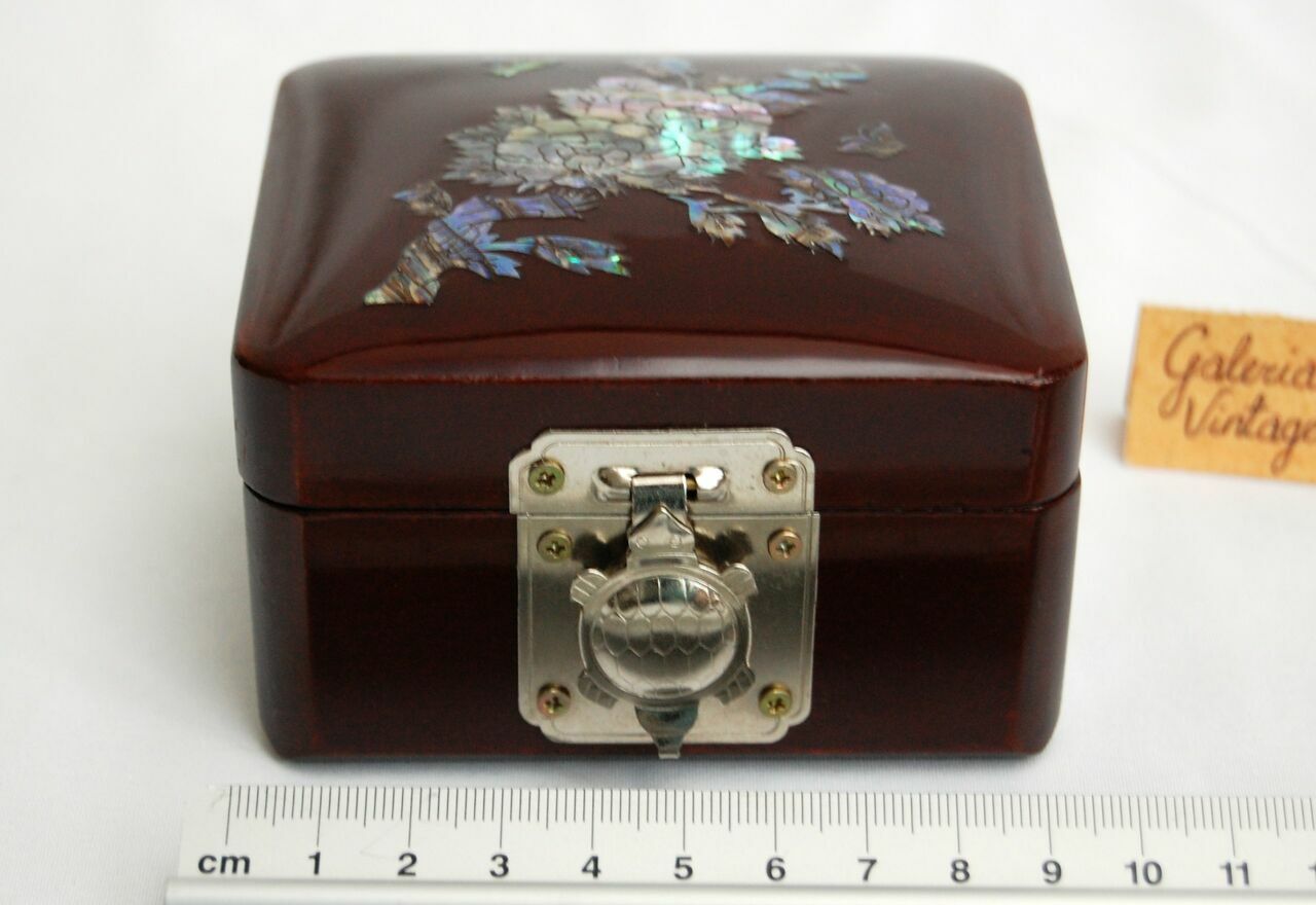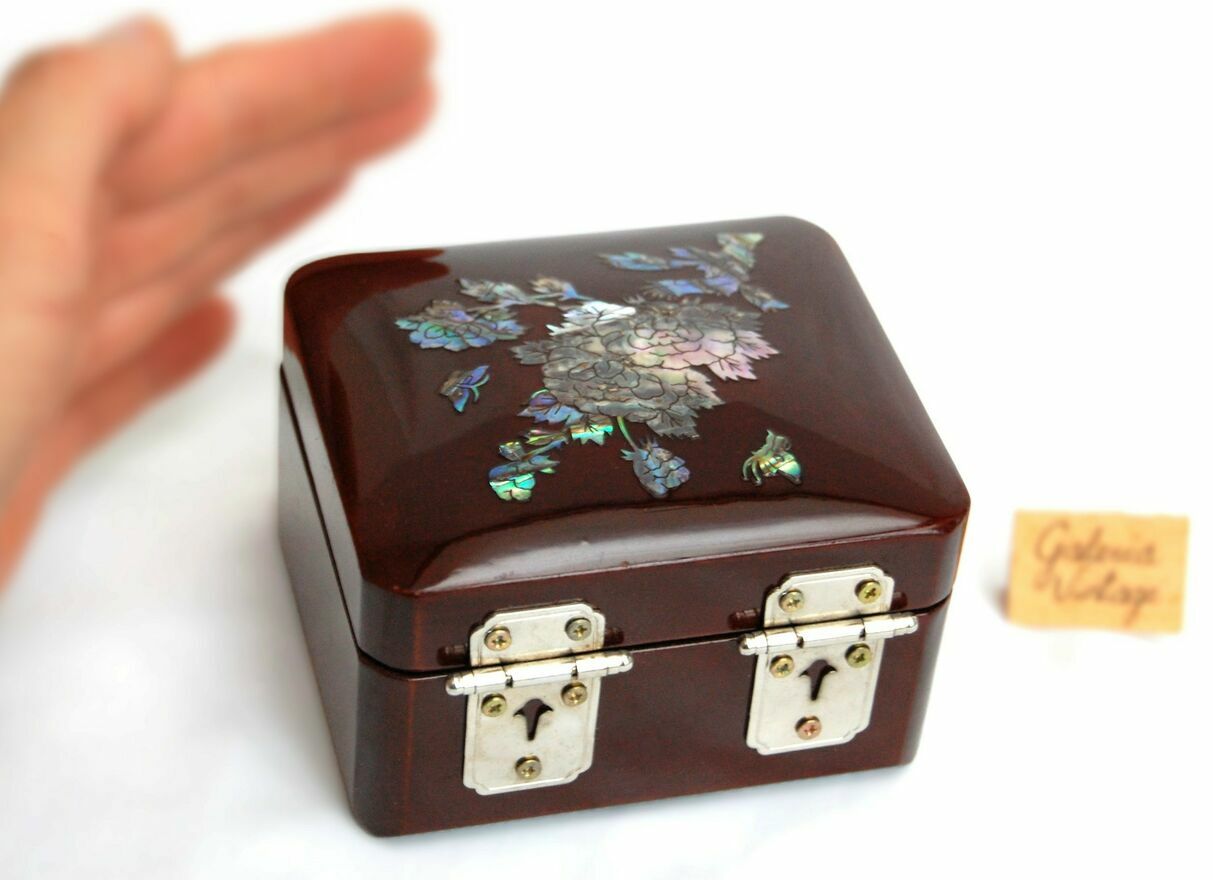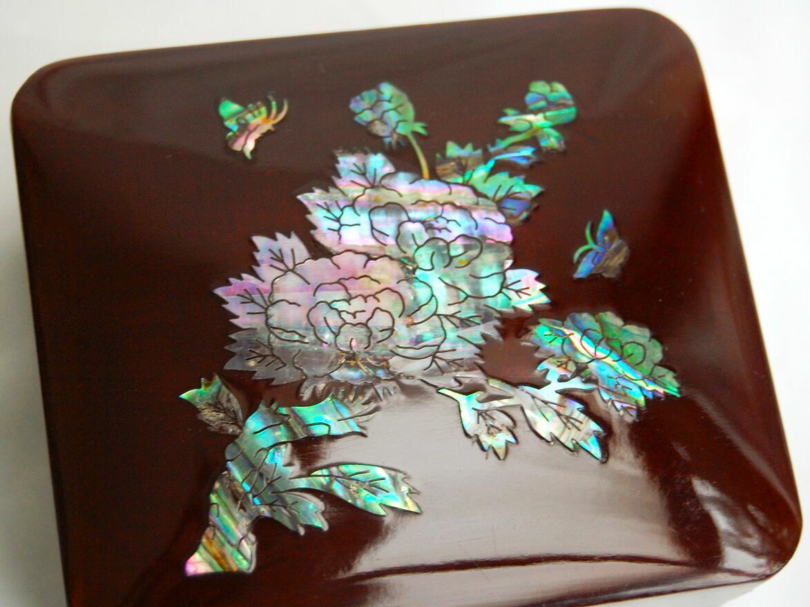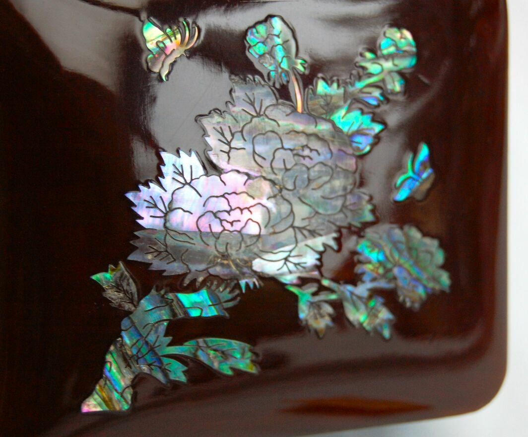 Przepiękna, orientalna szkatułka z burgundowej laki, inkrustowana rzeźbioną macicą perłową z motywem kwiatów i motyli. Zapięcie i zawiasy są metalowe. We wnętrzu jest lusterko i welurowa, czerwona wyściółka. Stan zachowania bardzo dobry.Wymiary: