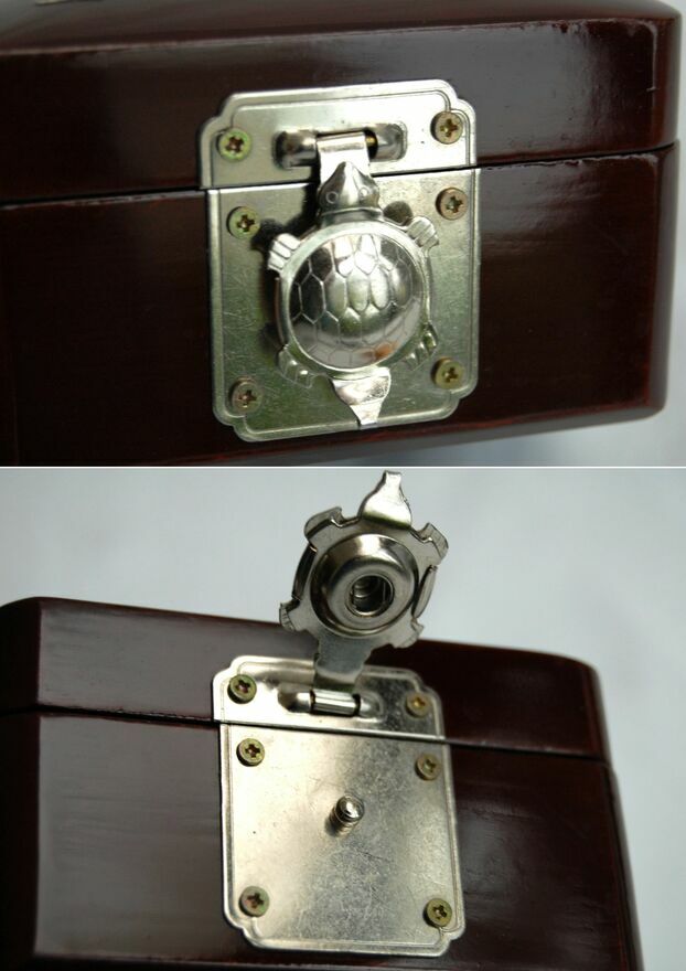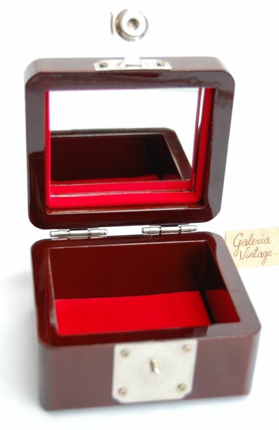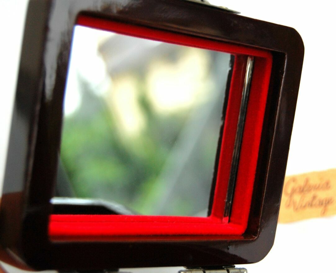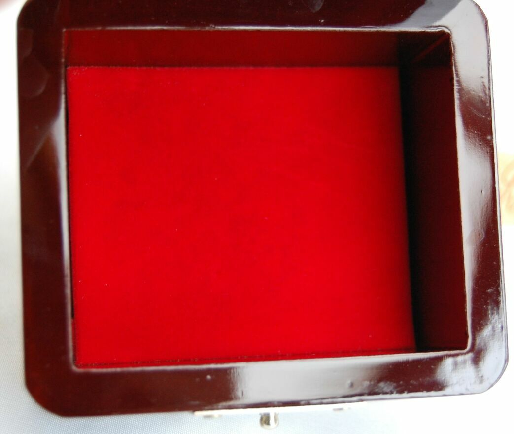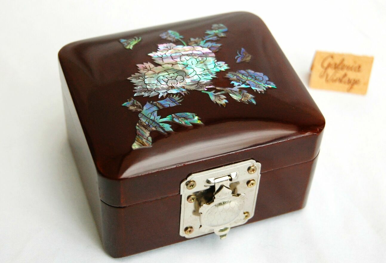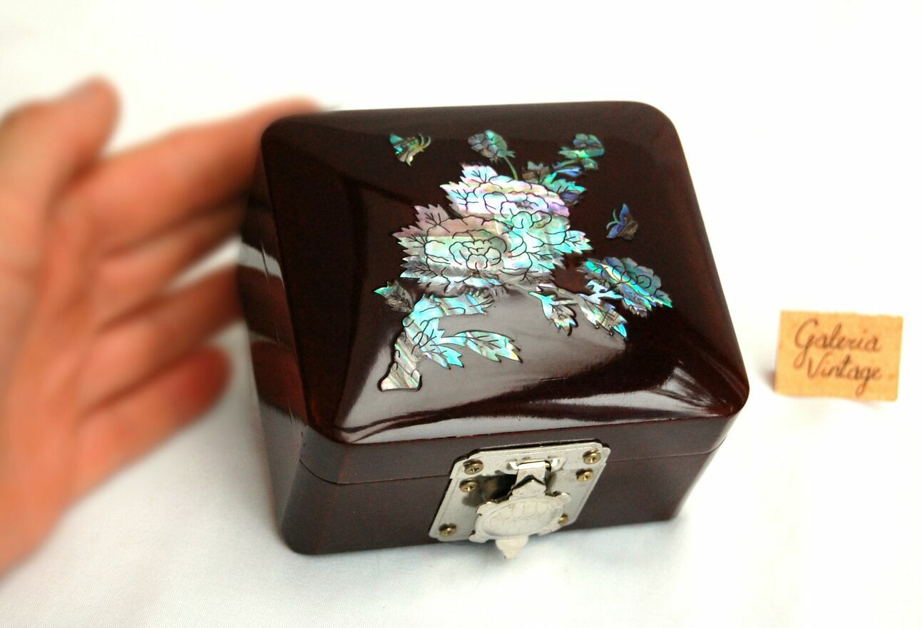 Przepiękna, orientalna szkatułka z burgundowej laki, inkrustowana rzeźbioną macicą perłową z motywem kwiatów i motyli. Zapięcie i zawiasy są metalowe. We wnętrzu jest lusterko i welurowa, czerwona wyściółka. Stan zachowania bardzo dobry.Wymiary: