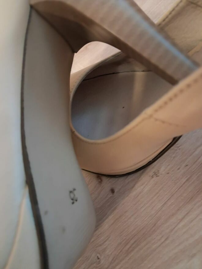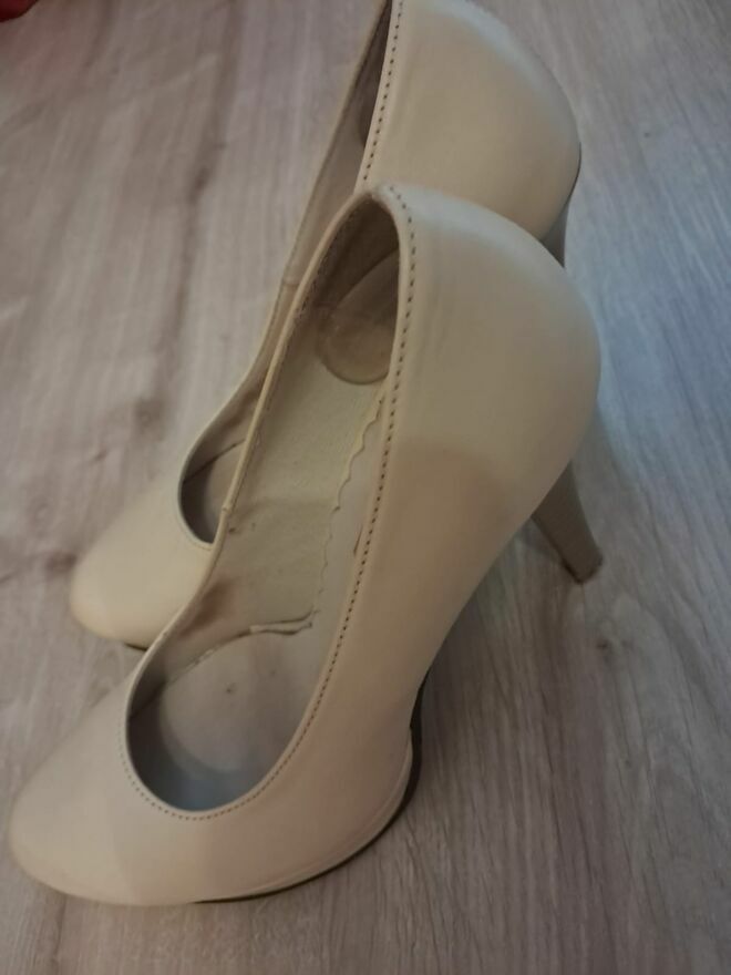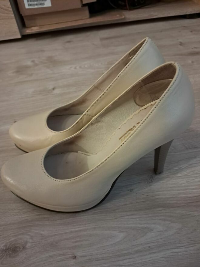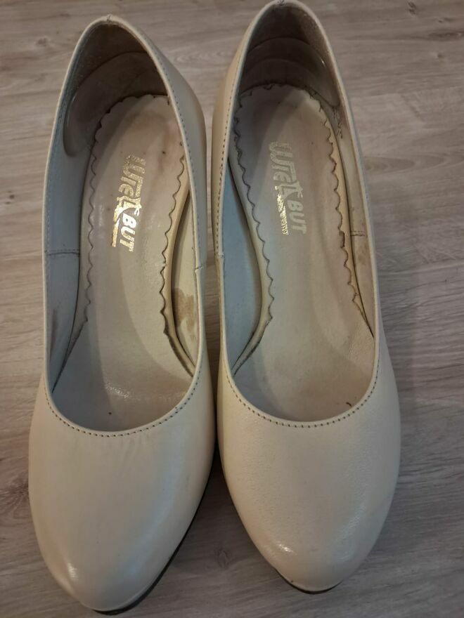 Śliczne skórzane szpilki w kolorze ecru. Są w stanie bardzo dobrym choć w środku widać lekkie ślady po wkładkach żelowych.Rozmiar 35 firmy Wielbut.
