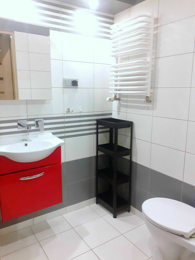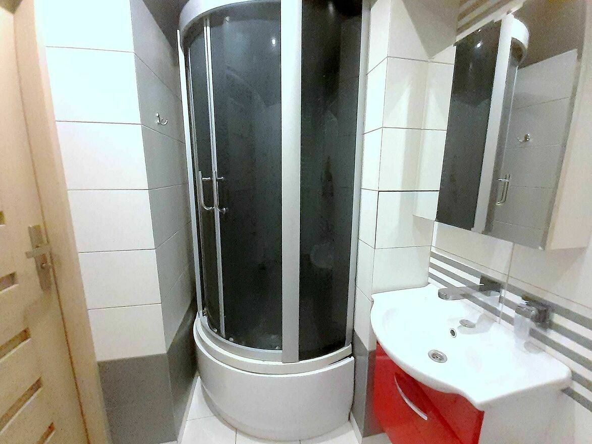 Łazienka i WC są razem. W łazience jest prysznic, toaleta, umywalka z szafką, lustro, półki na kosmetyki.
