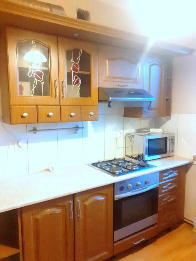 W kuchni jest pełne wyposażenie: lodówka, kuchenka gazowa, piekarnik, mikrofala, garnki, talerze, szklanki, sztućce, etc.
